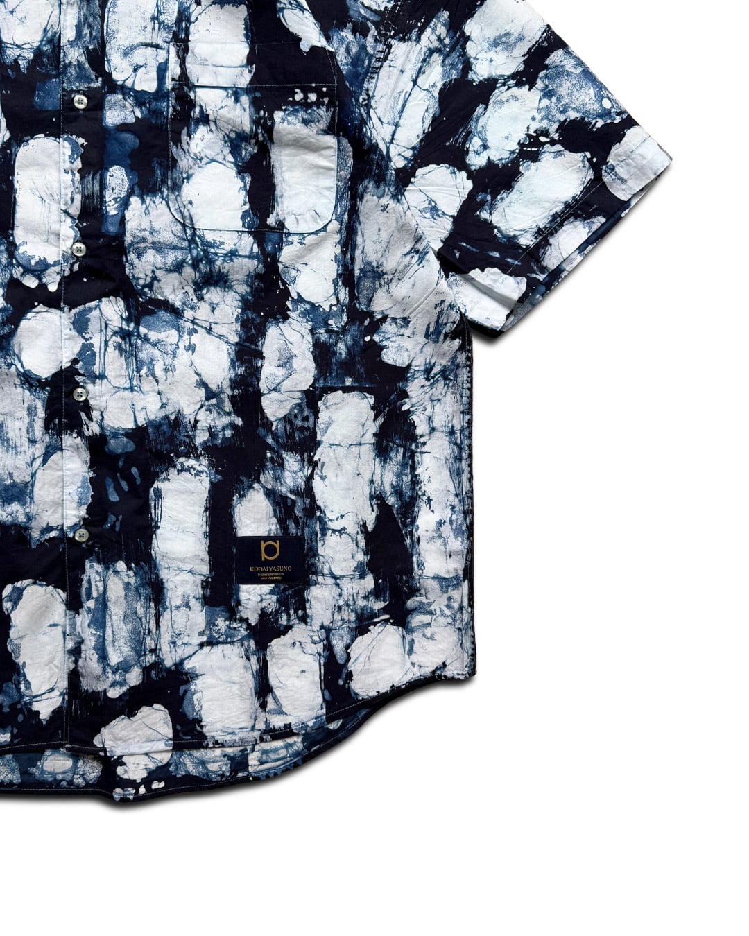 白と藍染めならではの深みのあるネイビーのコントラストが美しく、ろうけつ染めならではの細かい柄の表現が唯一無二でクールなシャツです。