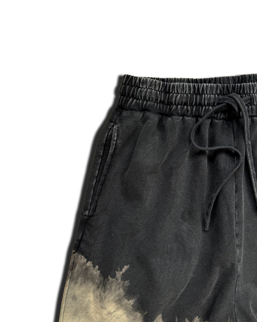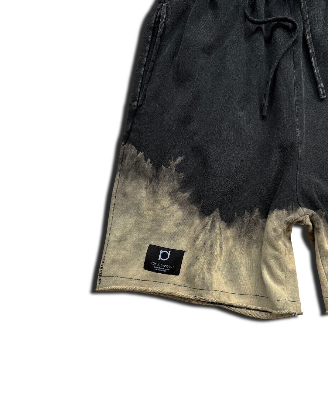 ウォッシュをかけてビンテージ風の質感を出した黒に上部に絞りを加え、グラデーションになるようにブリーチをしたハーフパンツ。