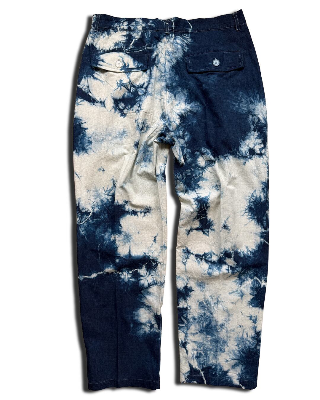 藍染めにて全体に柄が入るよう制作したコットンリネン素材の開襟シャツセットアップ。