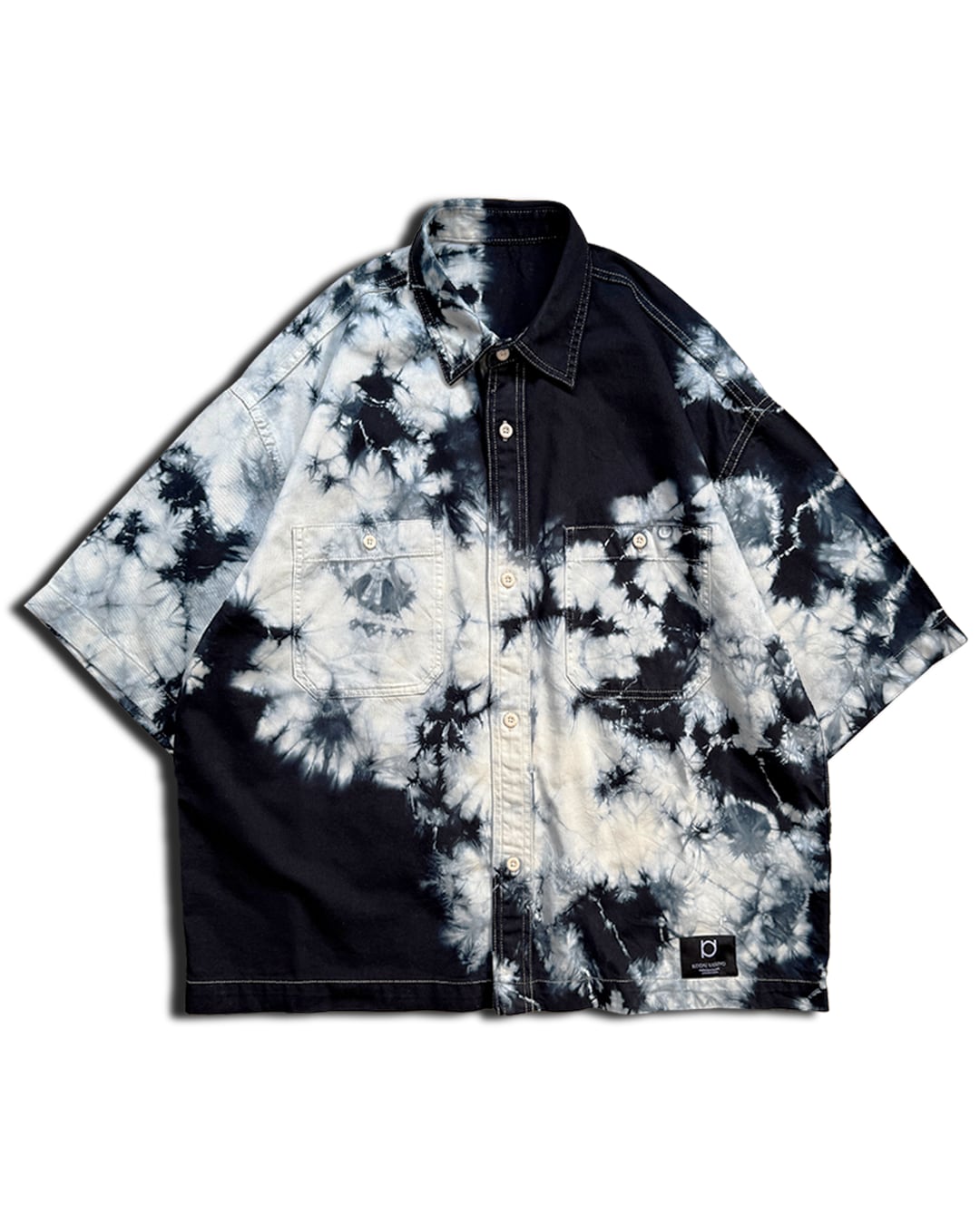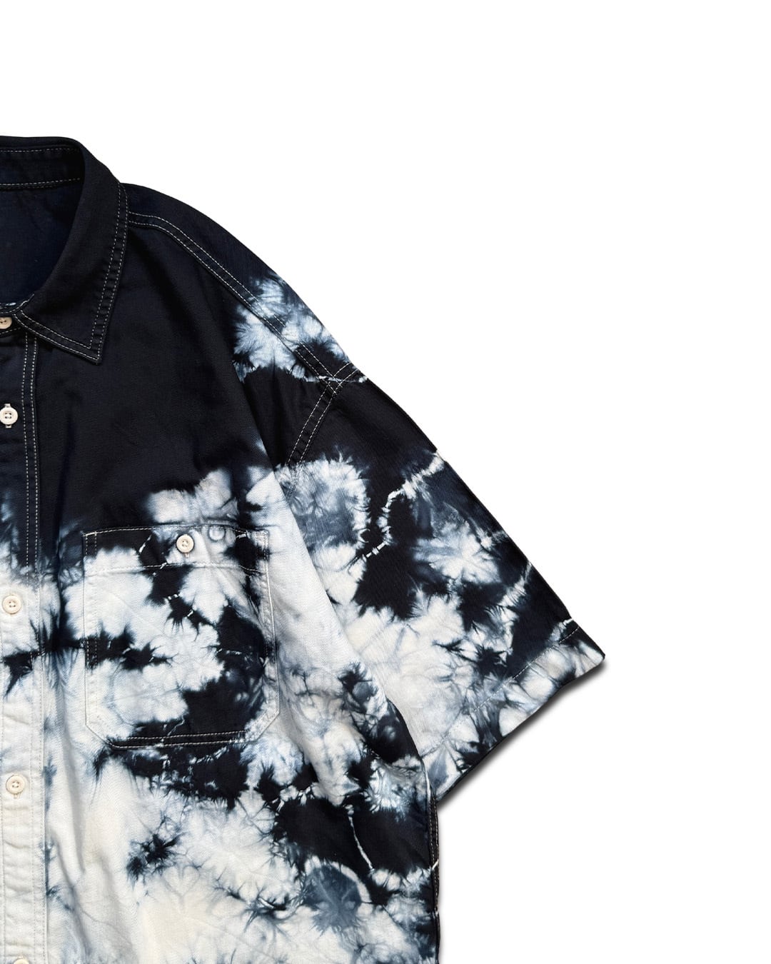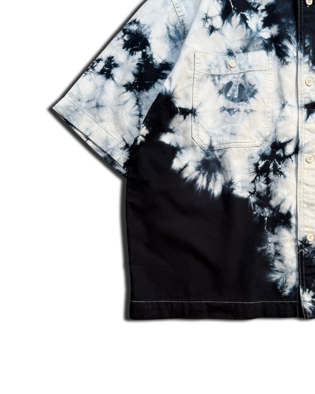 全体を黒のタイダイ柄に染色をした5分袖のデニムワークシャツ。