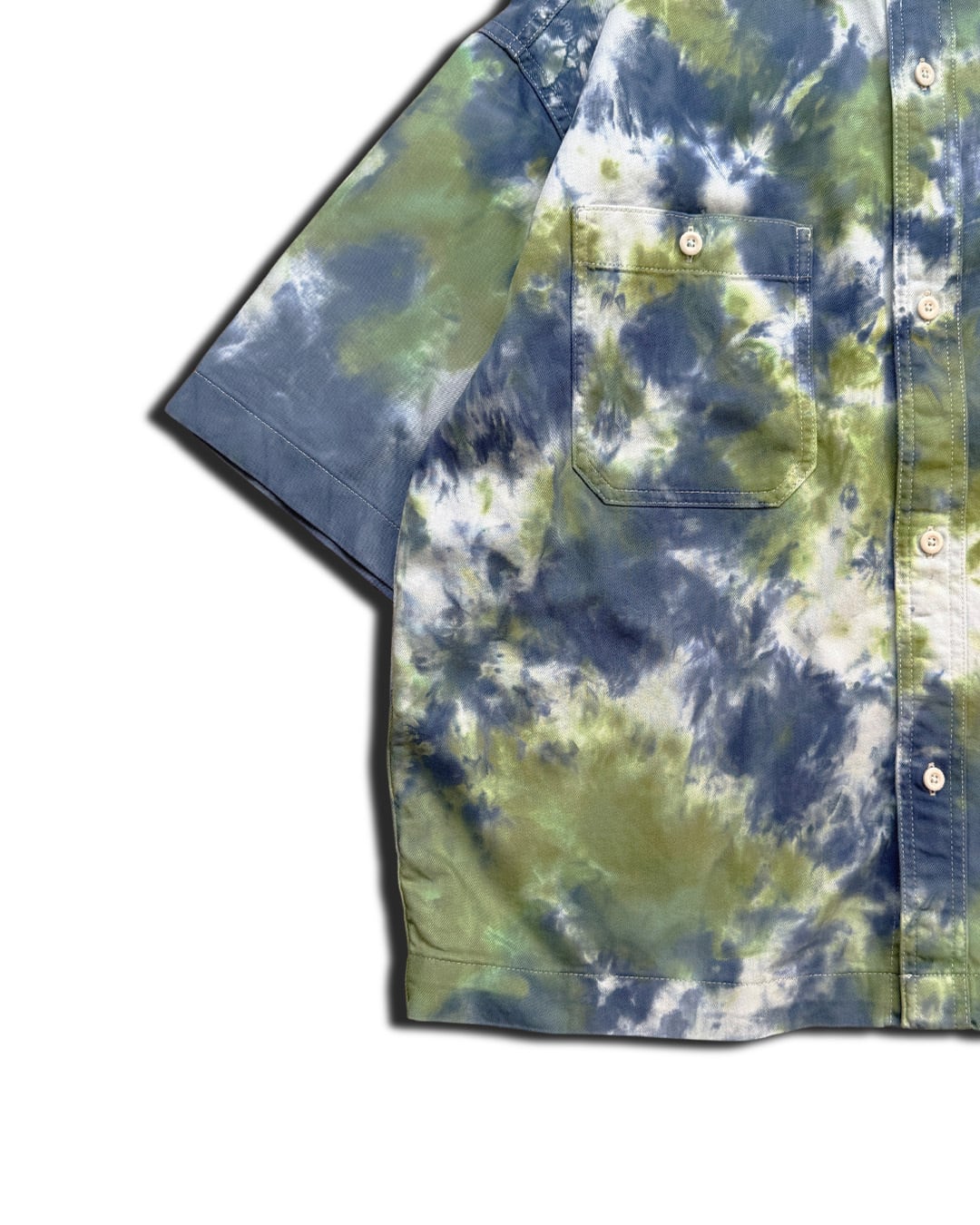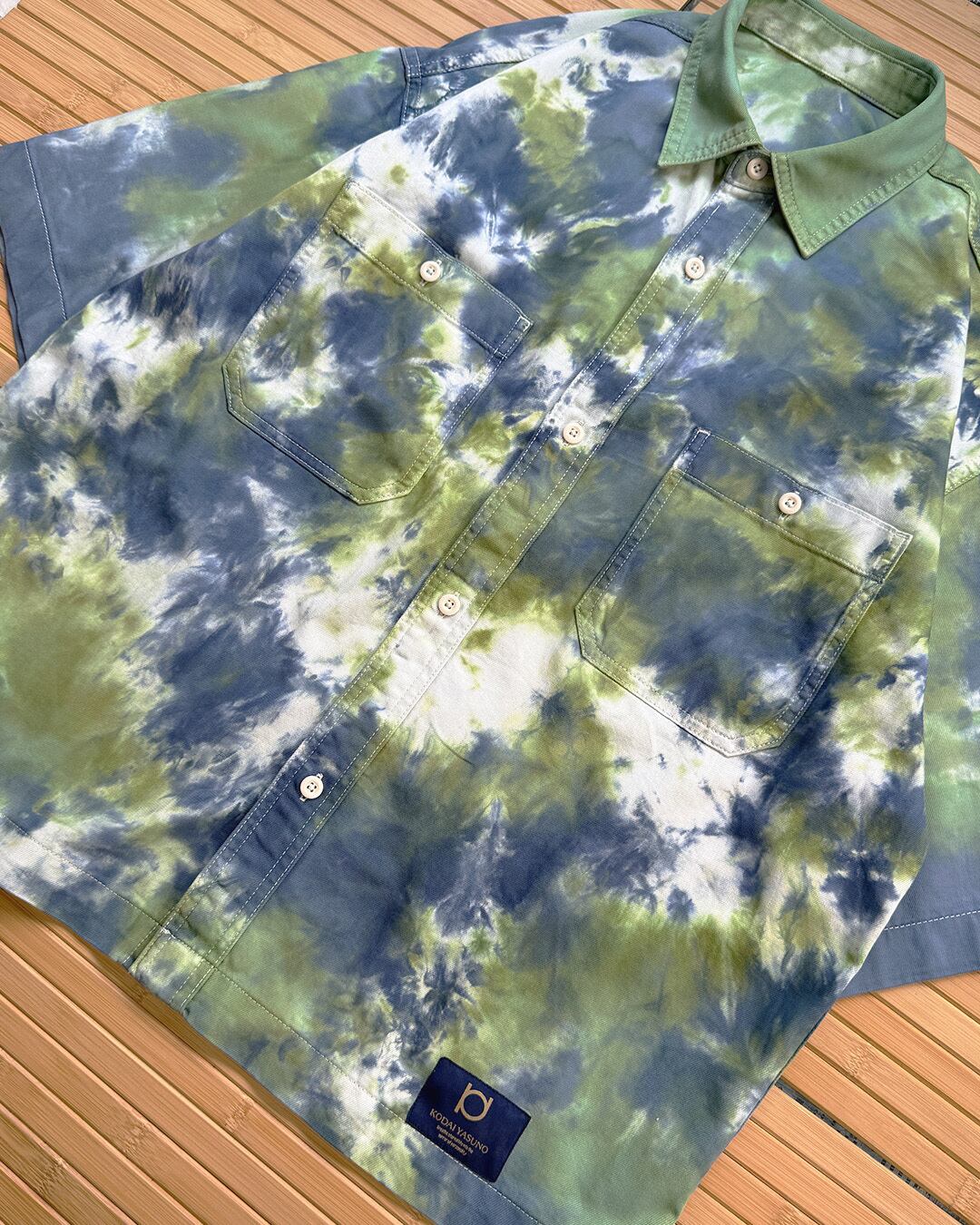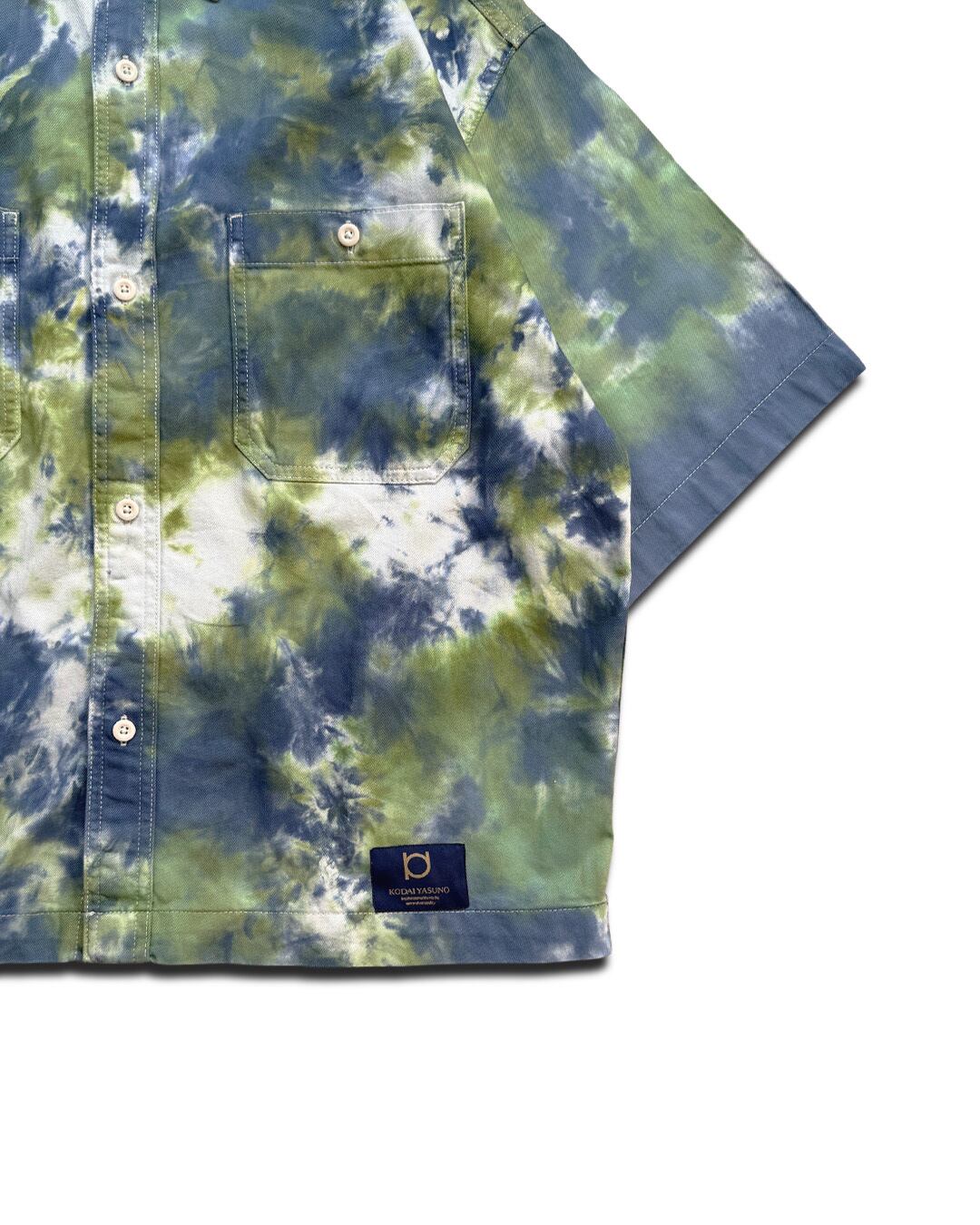 全体を黄緑よりの緑と青のタイダイ柄に染色をした5分袖のデニムワークシャツ。