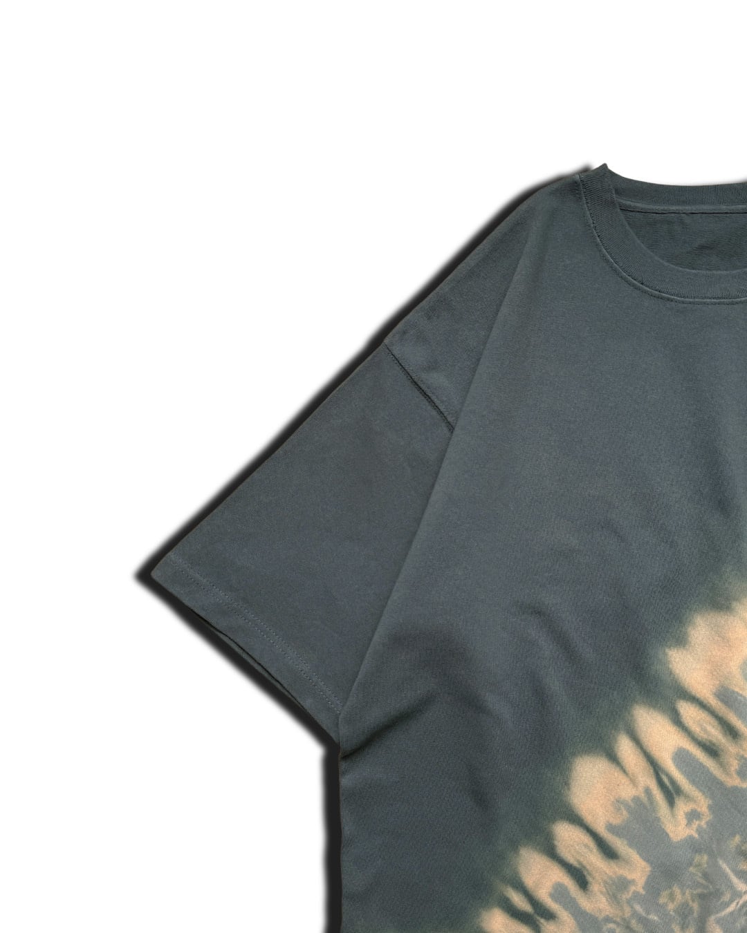 右斜め上を緑と青味がかったグレーに近い絶妙な色合いに、斜め下を薄緑とベージュのタイダイ柄に染色した斜め厚手のビッグシルエットTシャツ。