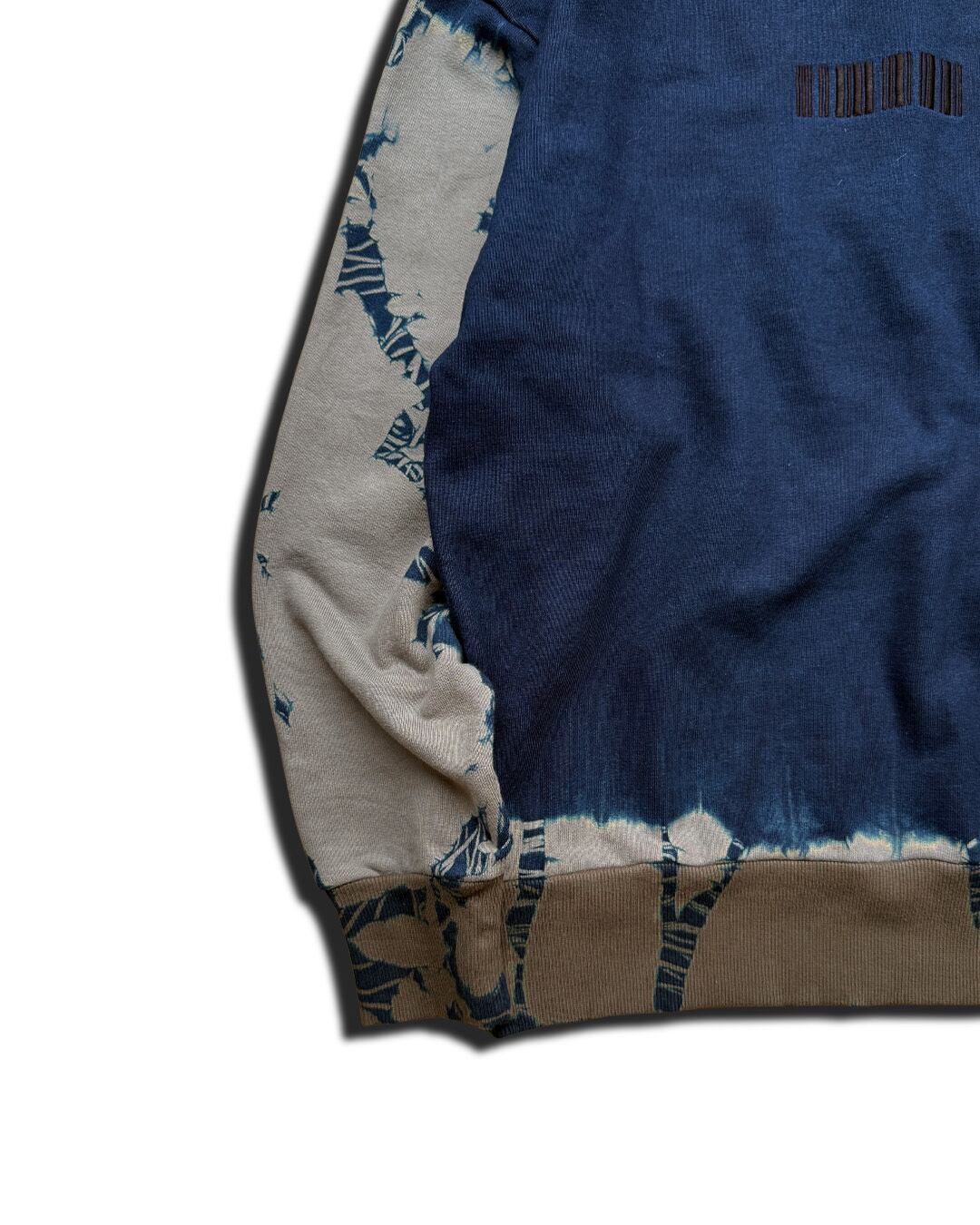 袖をグレーに藍染めのタイダイ柄が入るように、身ごろは全体を藍色に染色したトレーナー。