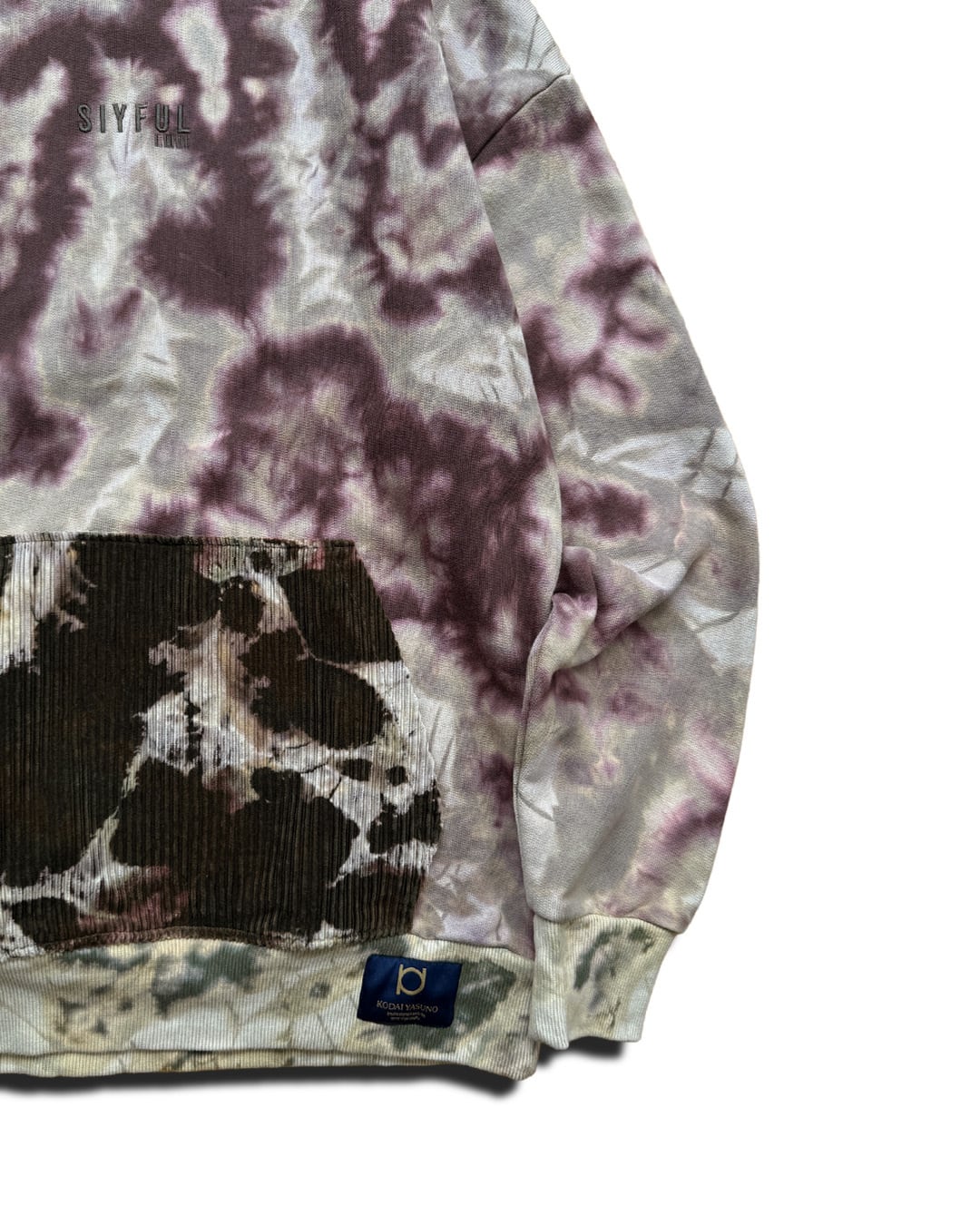 全体を紫味がかった赤茶色や赤紫、ベージュなど複数色のタイダイ柄に染色したプルオーバーフーディー。