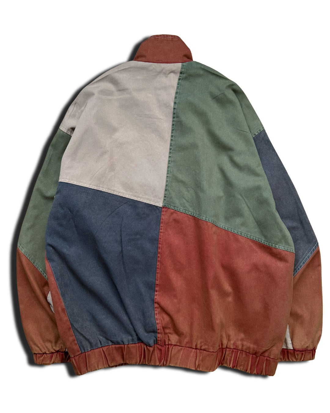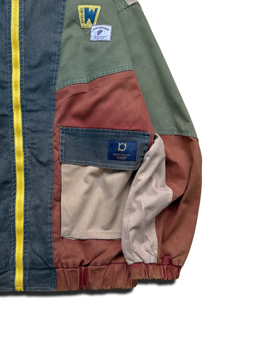 オレンジ味がかった茶色、緑、ベージュ、青色に染色した切り返しジャケット。