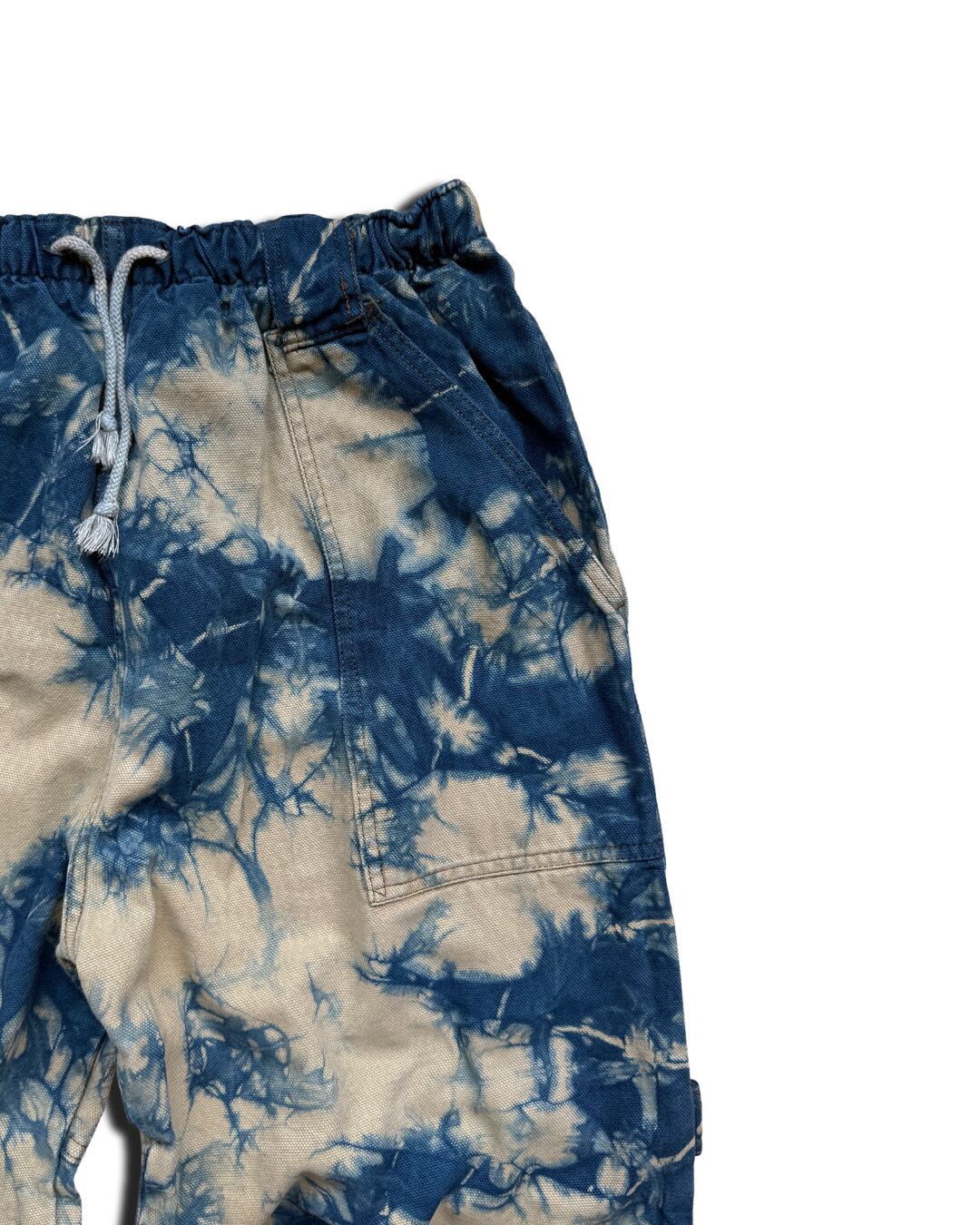 古着のワークパンツを藍染のタイダイ柄にリメイクして制作した1点。