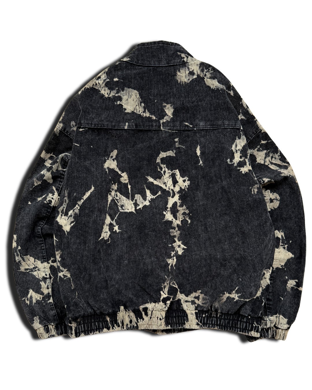 身ごろをウォッシュがかかったかのような質感の黒に染色したのち、全体をブリーチして白煙のような不規則な柄を入れて制作したコーデュロイ生地のブルゾンジャケット。