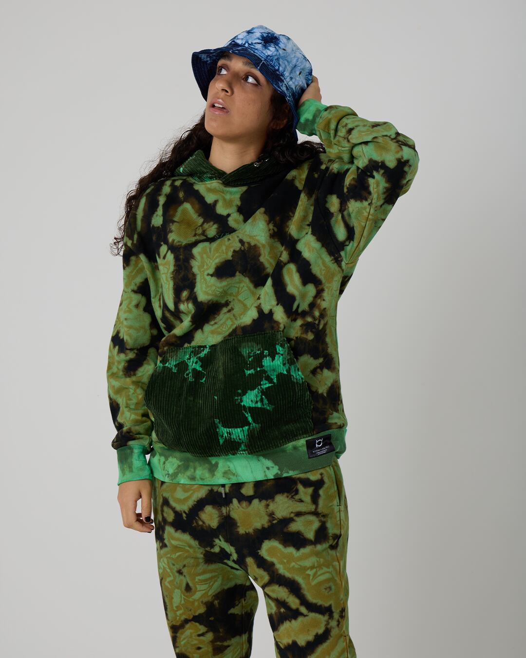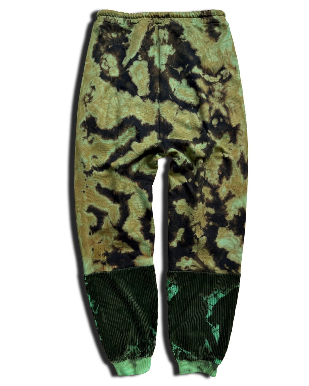 全体を黒、オレンジ、黄緑など複数色のタイダイ柄に染色したスウェットパンツ。