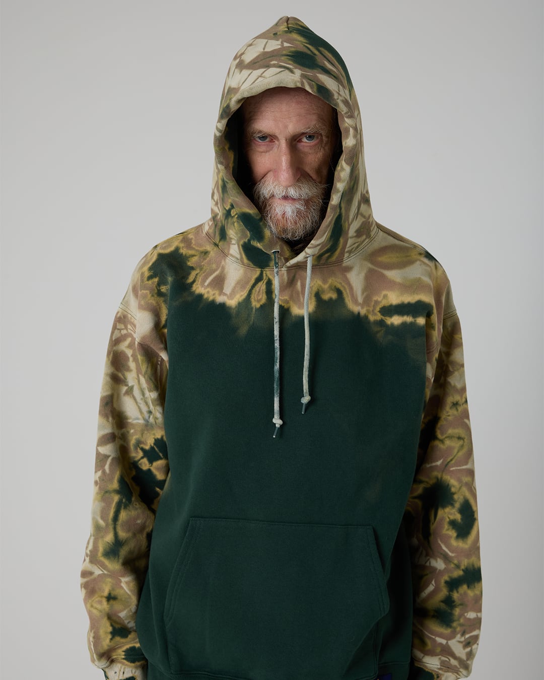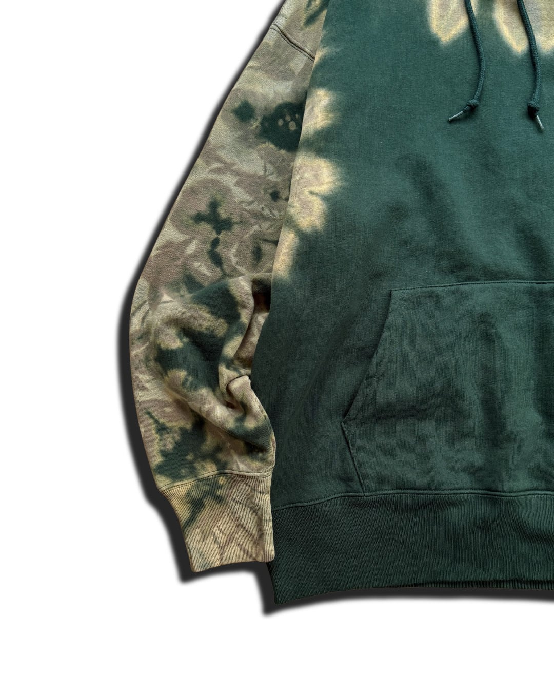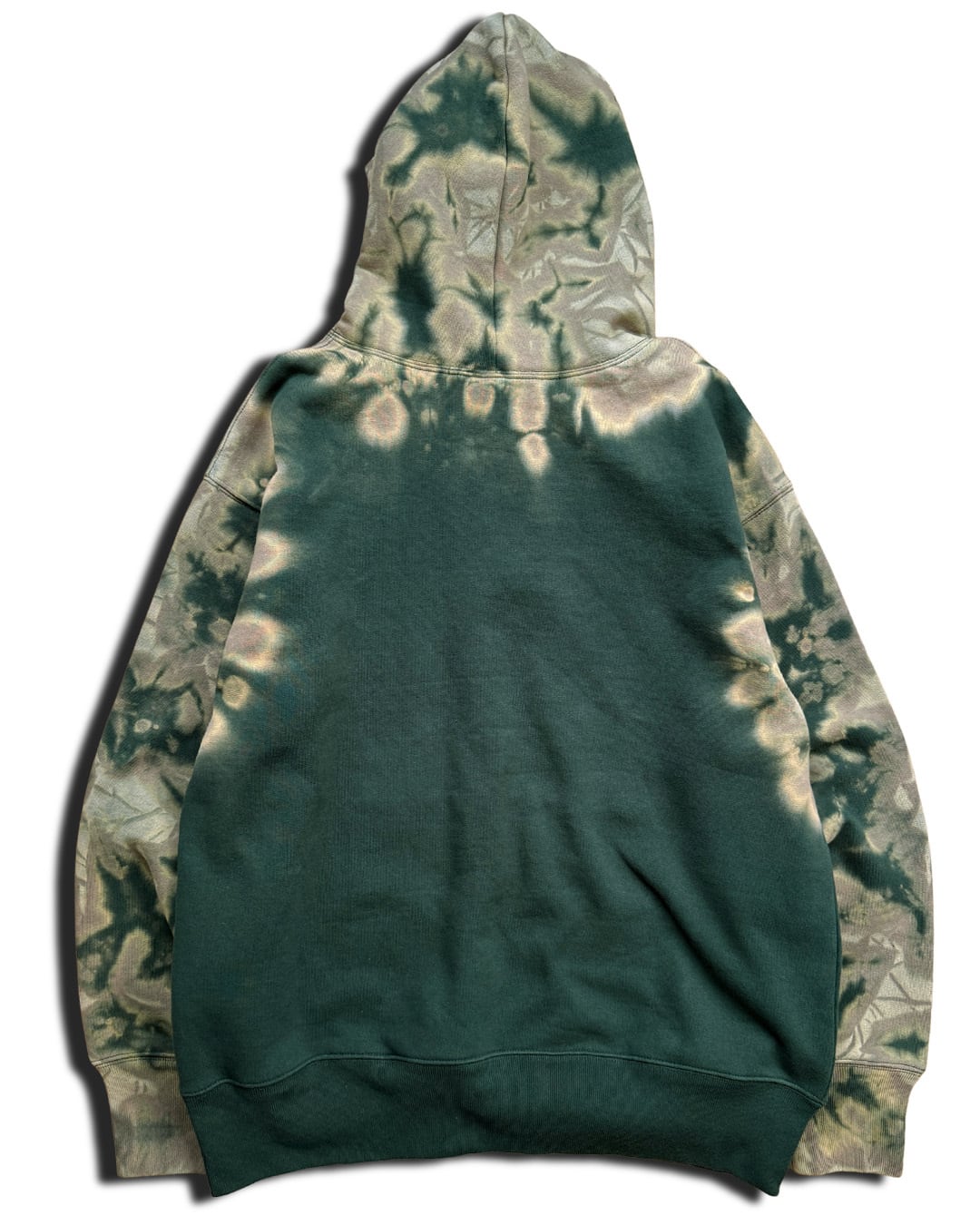 身ごろを緑に、袖とフードを緑、黄緑ヘベージュよりの茶色など複数色のタイダイ柄に制作したヘビーオンスのフーディー。