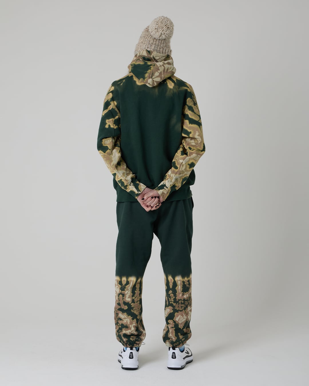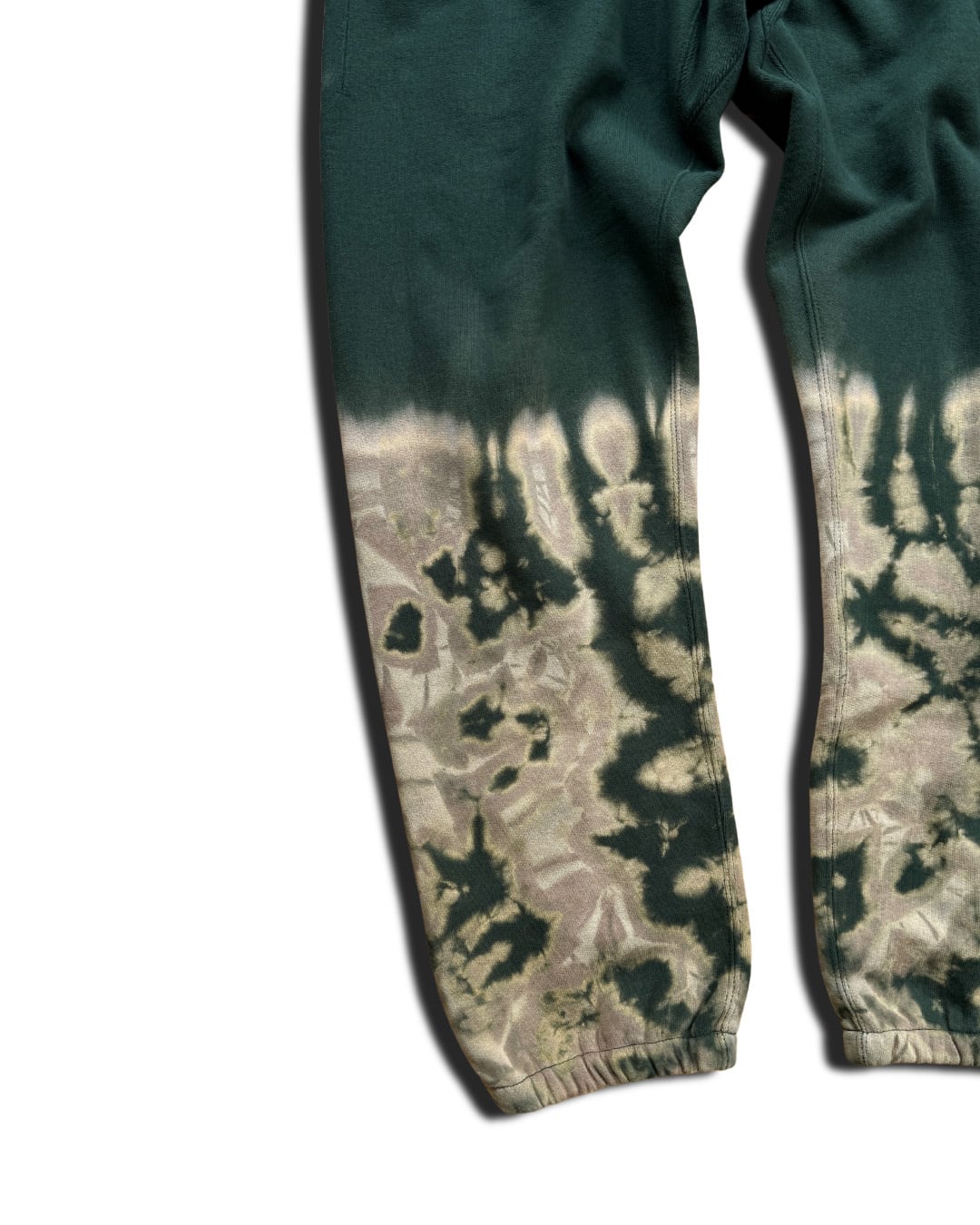 上部を緑に、裾に緑、黄緑ベージュよりの茶色のタイダイ柄を入れたヘビーオンスのスウェットパンツ。