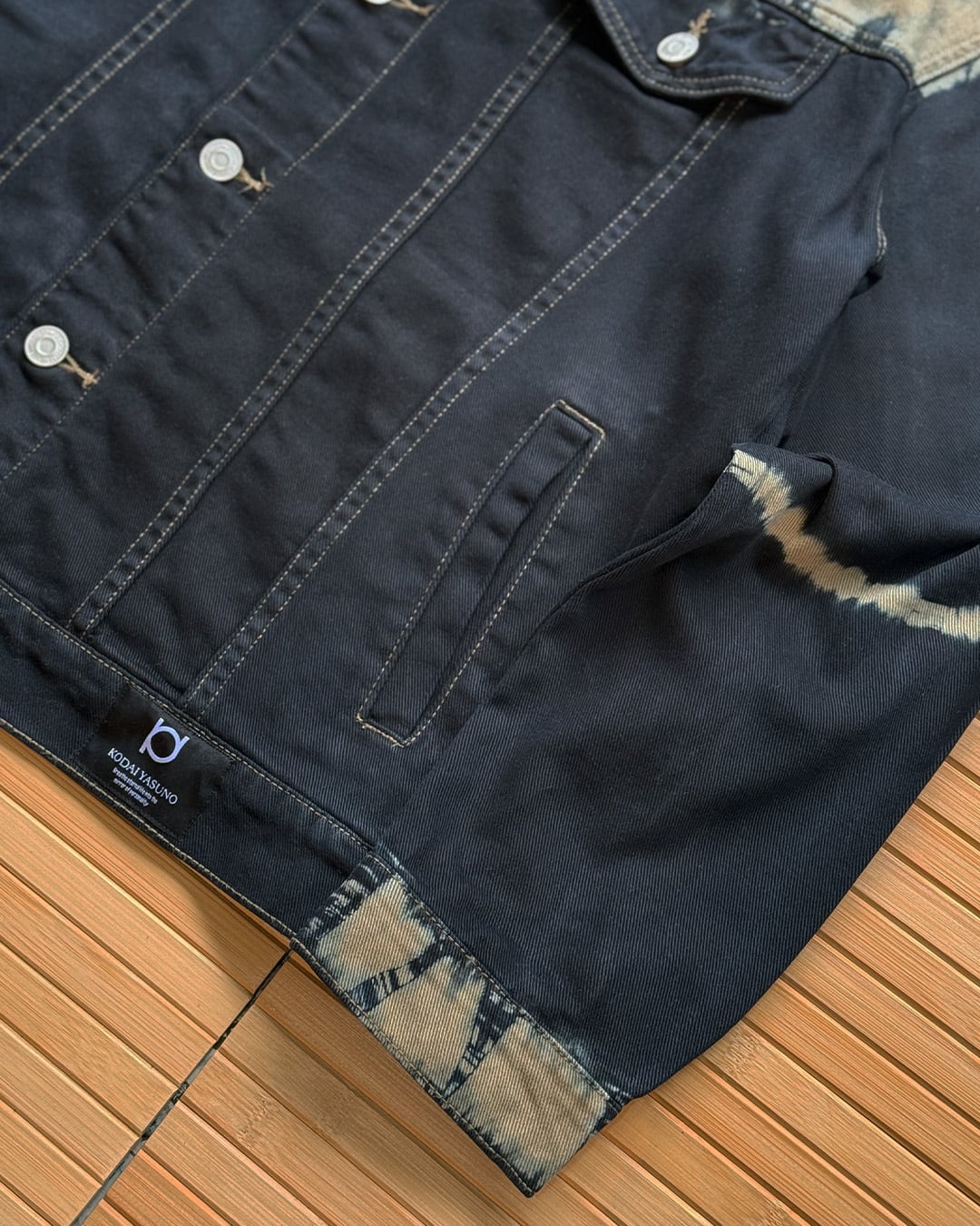 ジャケット上部と襟口をブラウンベージュに黒のタイダイ柄、両袖にベージュの線を入れ、身ごろ全体を黒1色に染色したデニムジャケット。