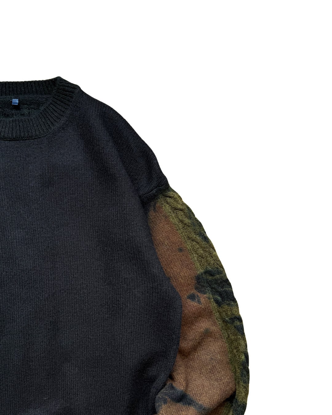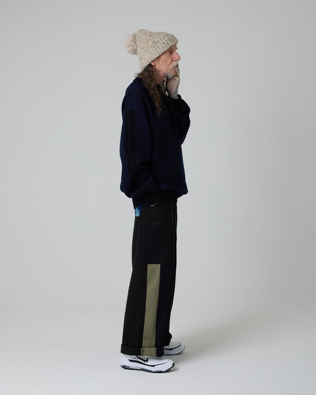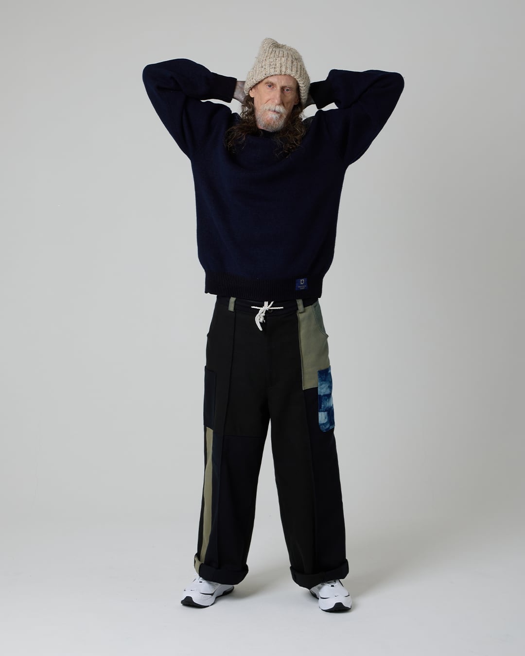 両袖と背中にケーブルを編み込んだウールニットを藍染めにて染色。