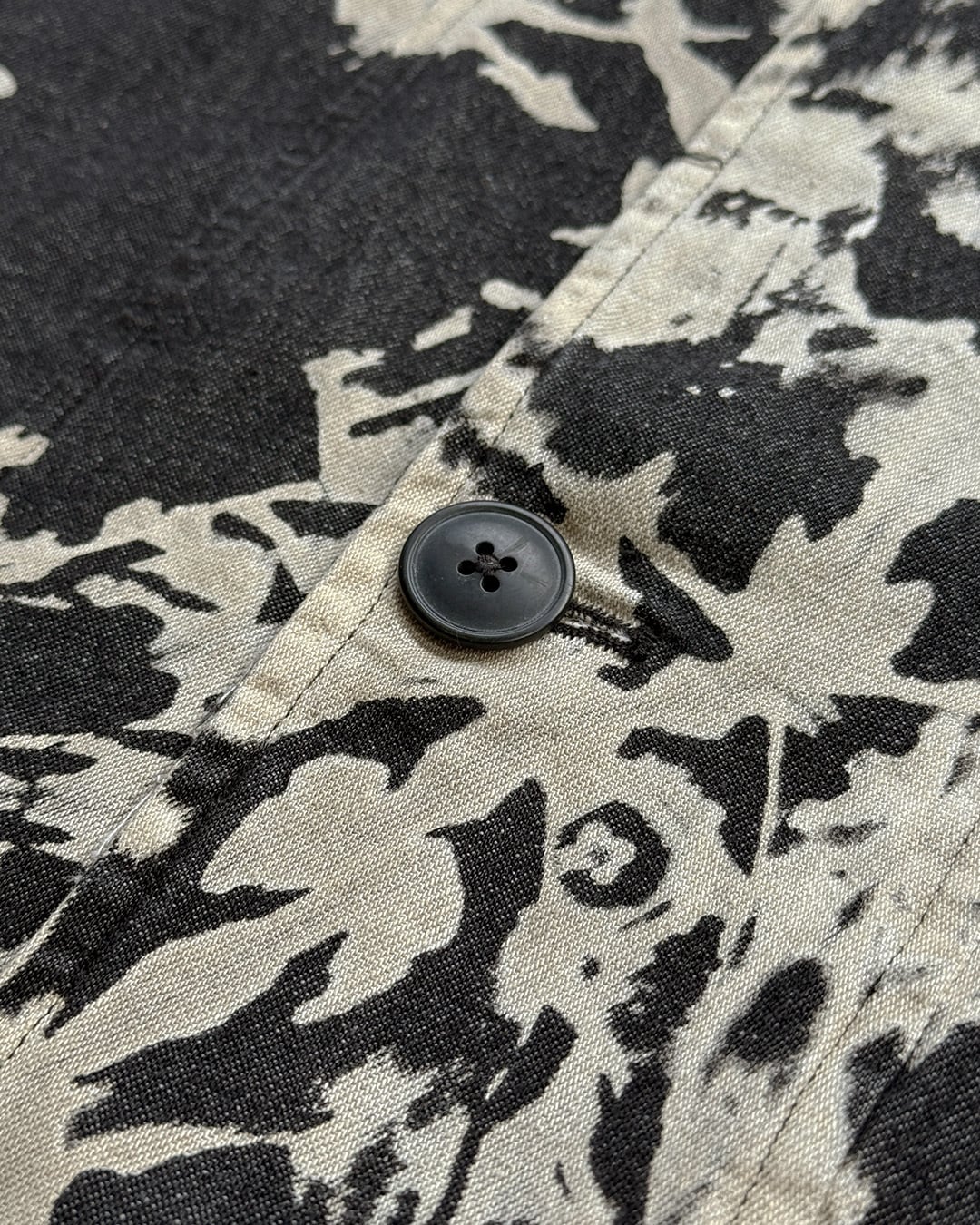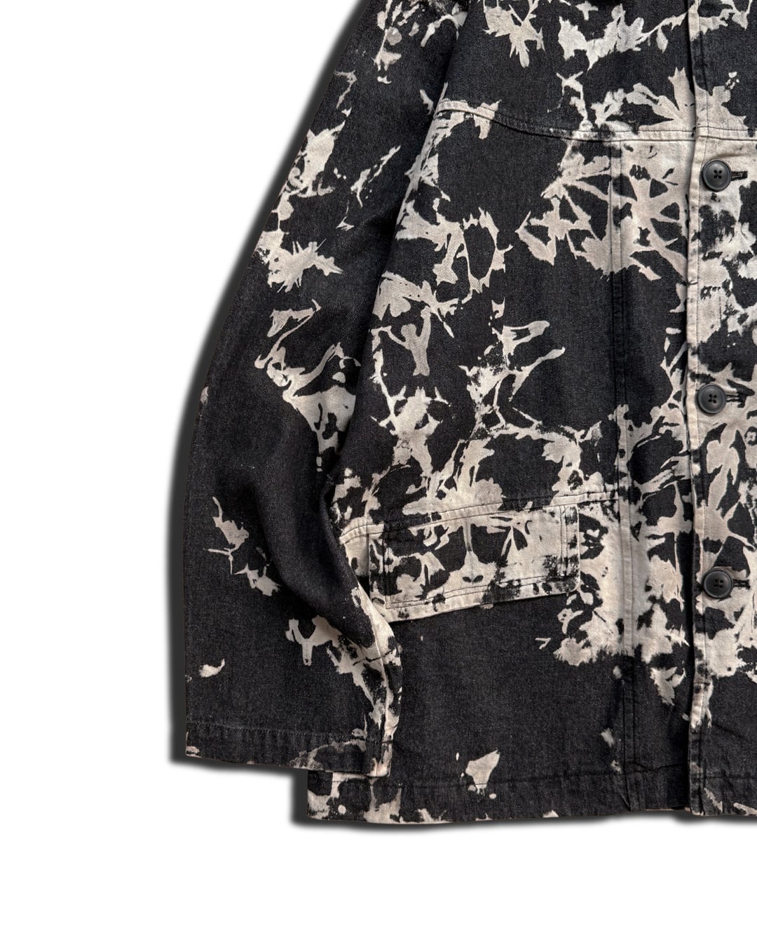全体をタイダイ柄にブリーチして、黒と白寄りのベージュの不規則な柄に仕上げたデニムジャケット。個性的で唯一無二なデザインの1点。