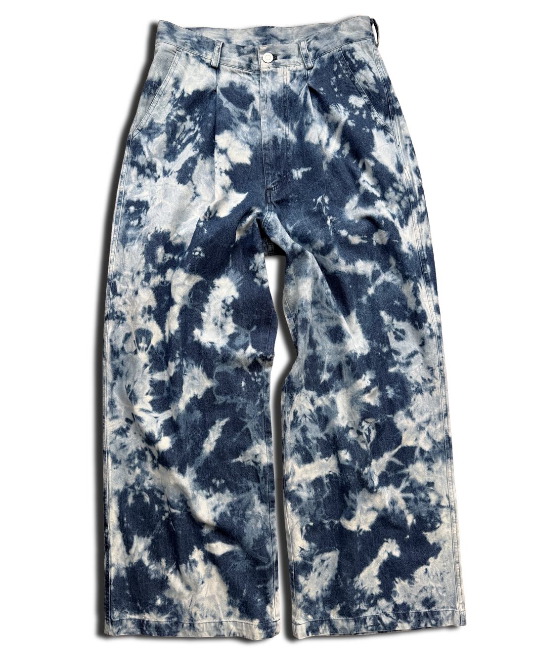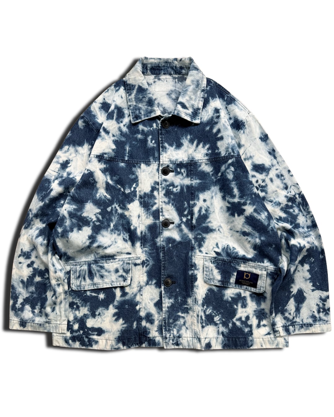 全体をタイダイ柄にブリーチして、ライトインディゴと白の不規則な柄に仕上げたデニムジャケット。個性的で唯一無二なデザインの1点。