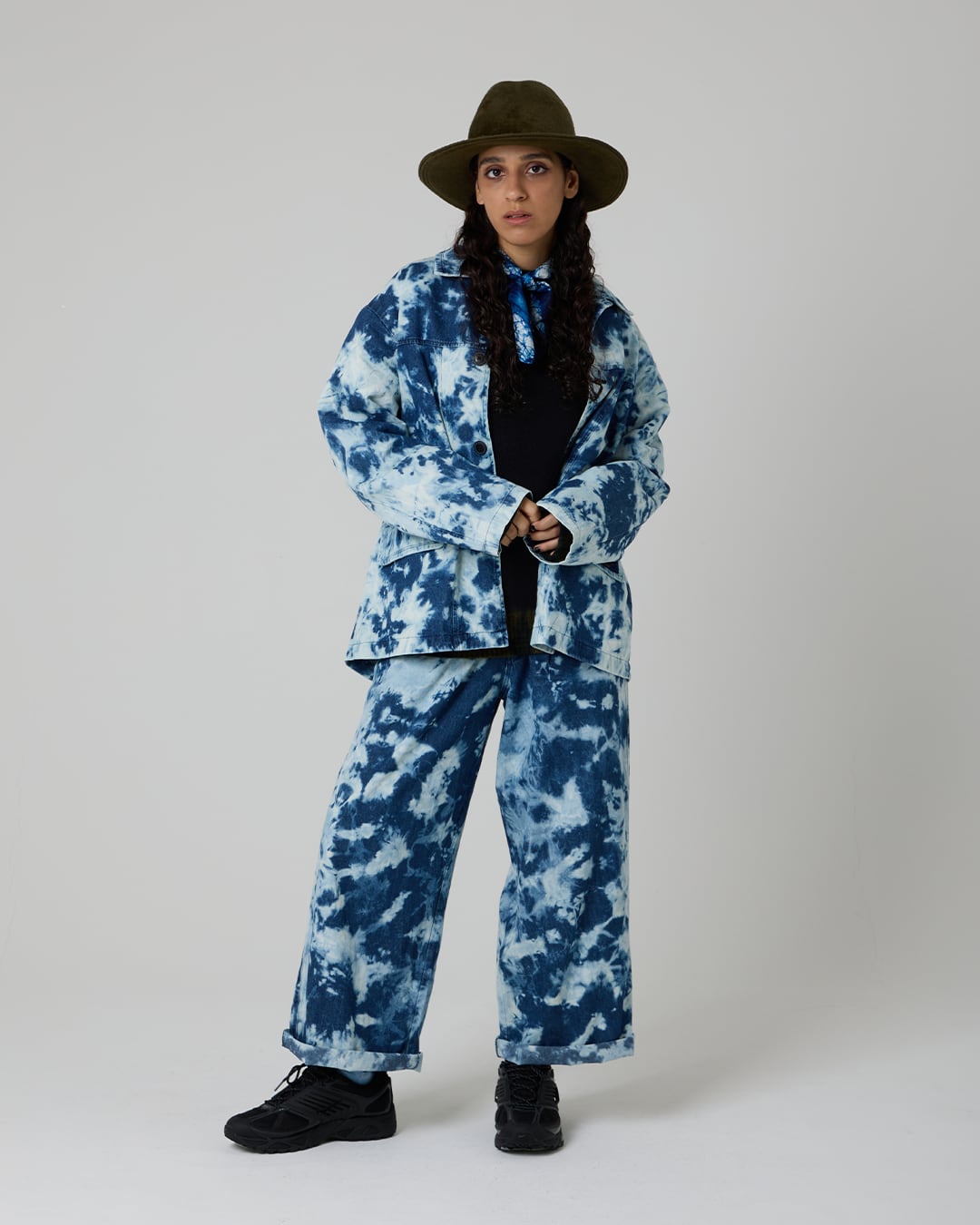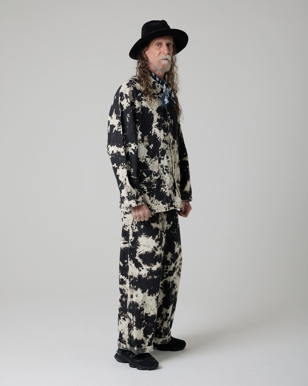 全体をタイダイ柄にブリーチして、ライトインディゴと白の不規則な柄に仕上げたデニムパンツ。