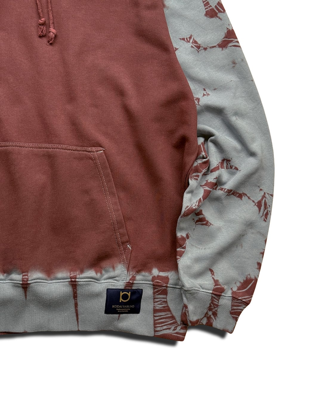 フード、左袖、右袖下部、裾リブを茶色味がかったくすみ赤のタイダイ柄にくすんだ水色を、見ごろ部分を茶色味がかったくすみ赤に染色したプルオーバーフーディー。
