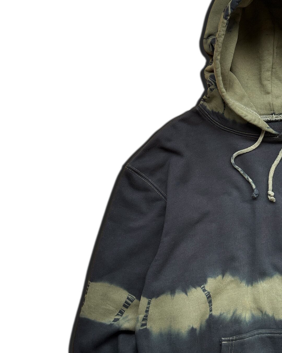 をベースとして黒のタイダイ柄、それ以外を黒1色に染色したプルオーバーフーディー。