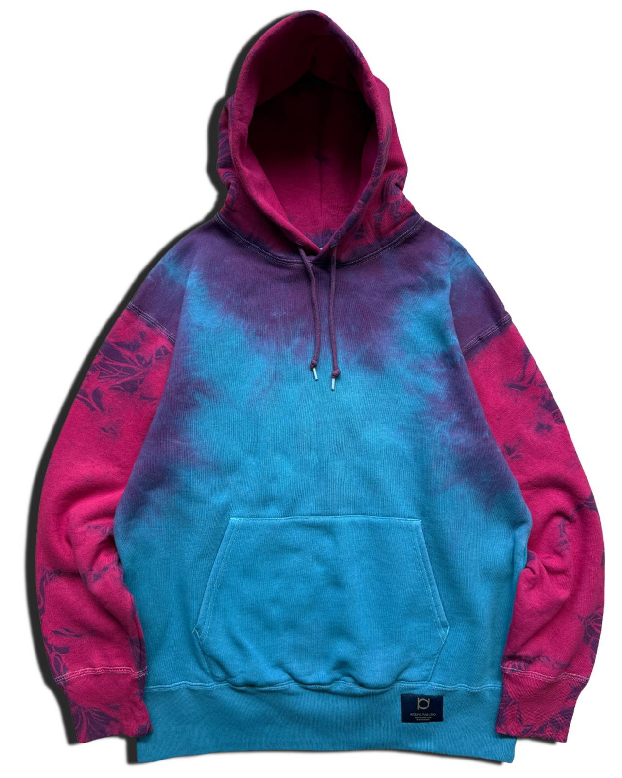 身ごろを水色に、袖とフードに紫のタイダイ柄を入れた上でピンクに染色をしたヘビーオンスのフーディー。