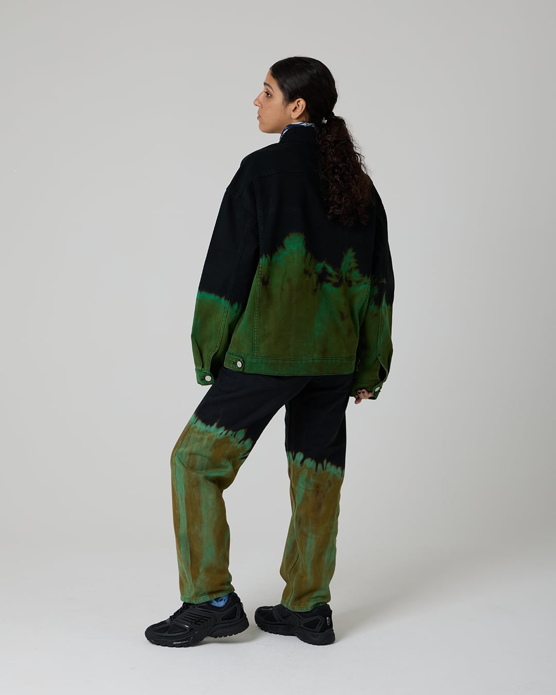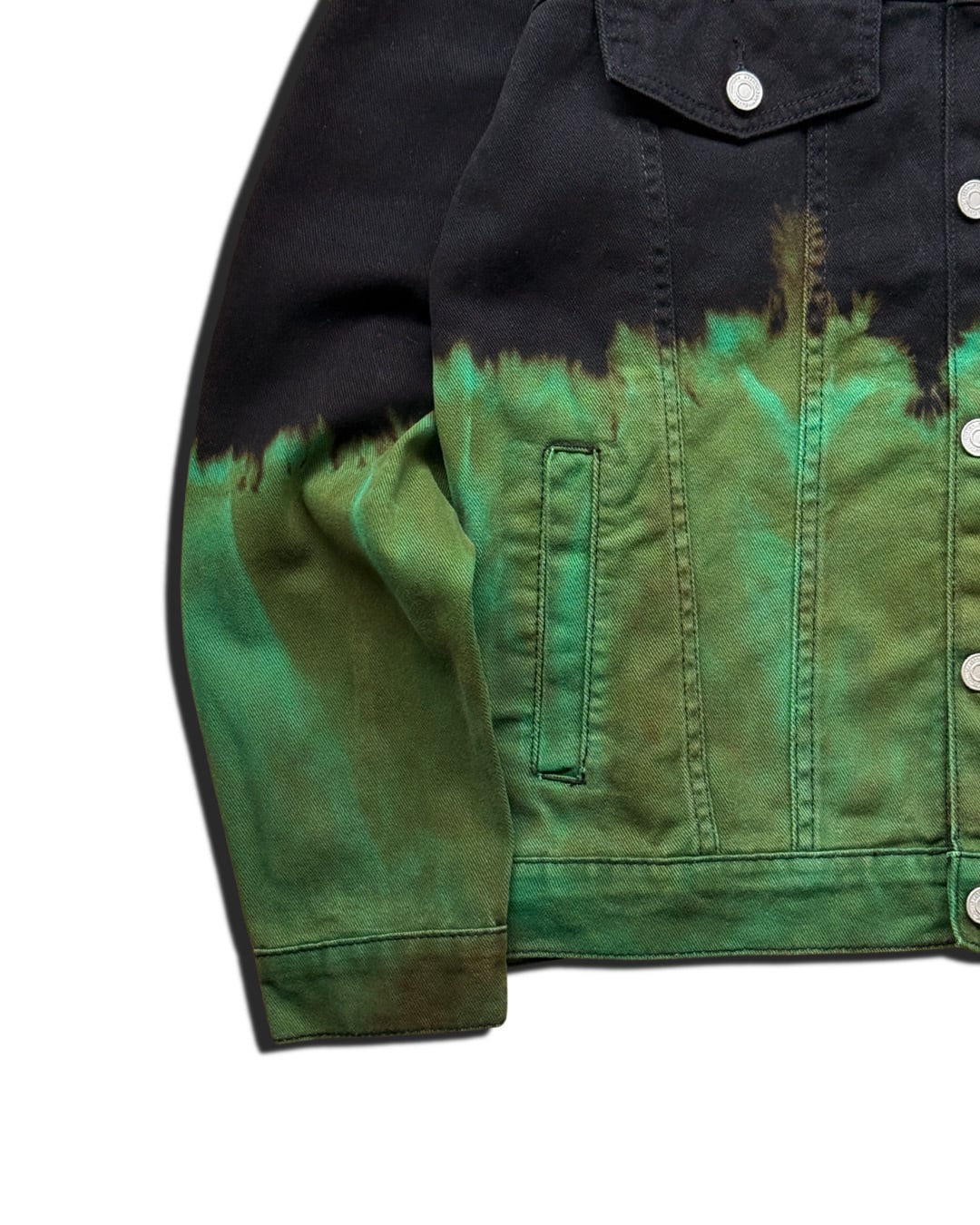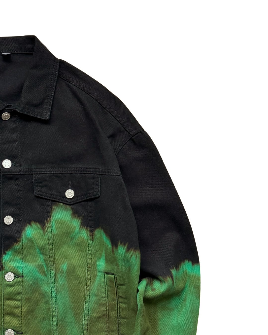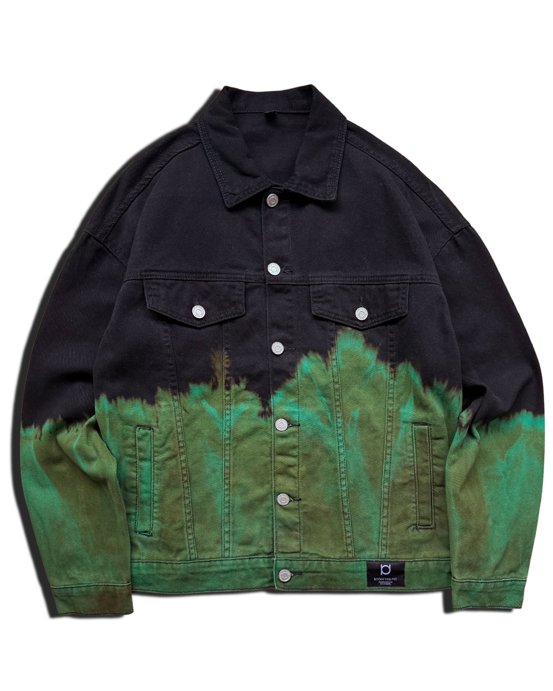 ジャケット上部を黒1色に、下部をブリーチしたのち黄緑に染色を重ねて制作したデニムジャケット。