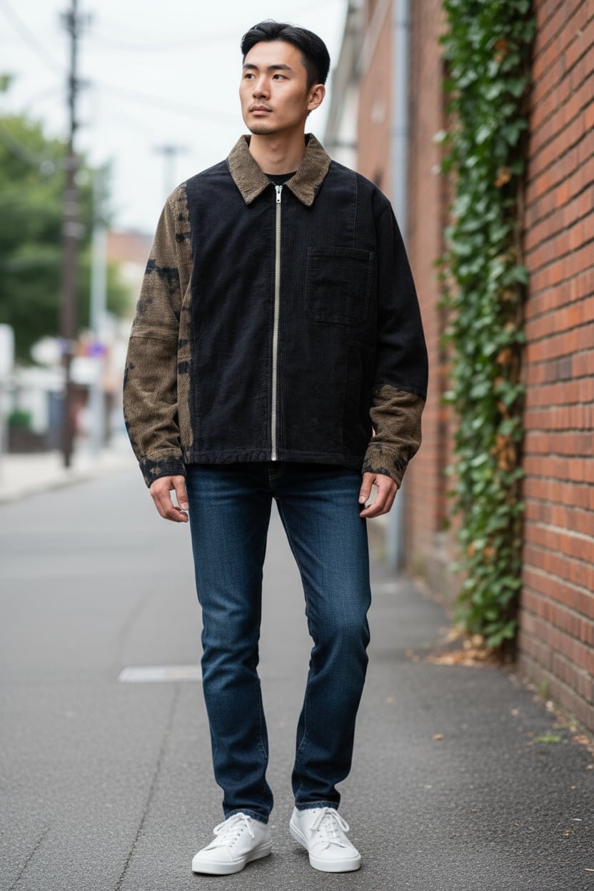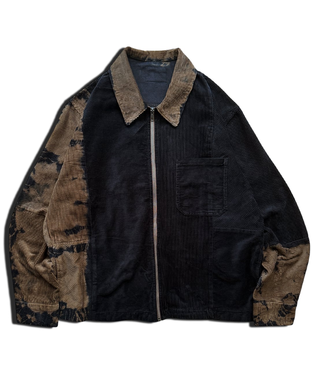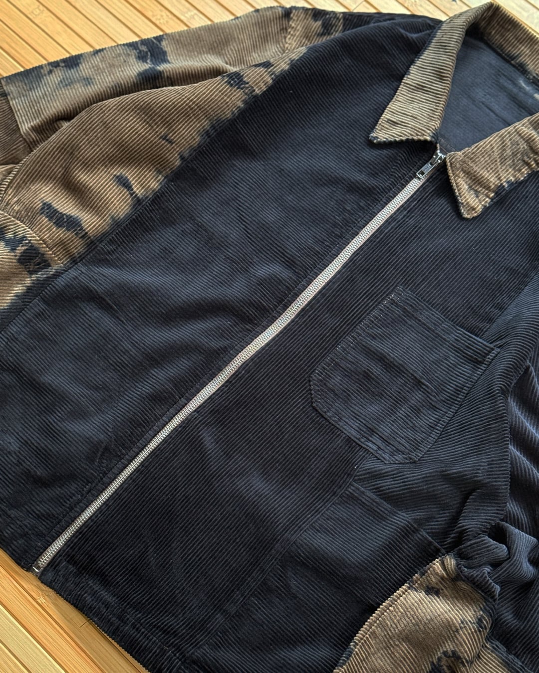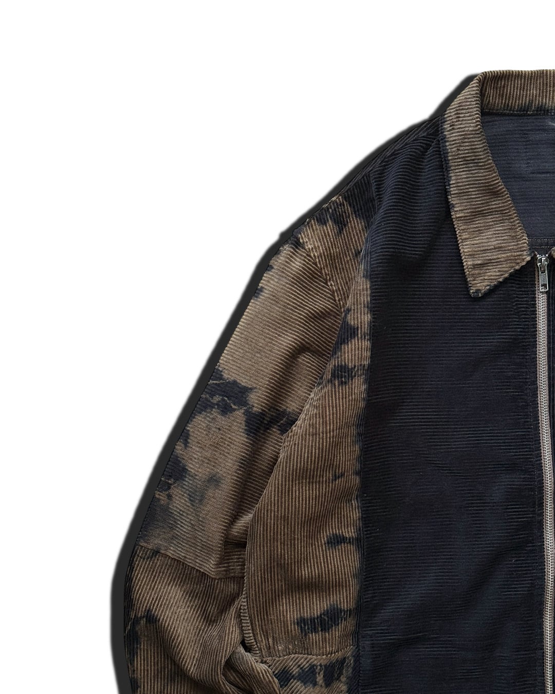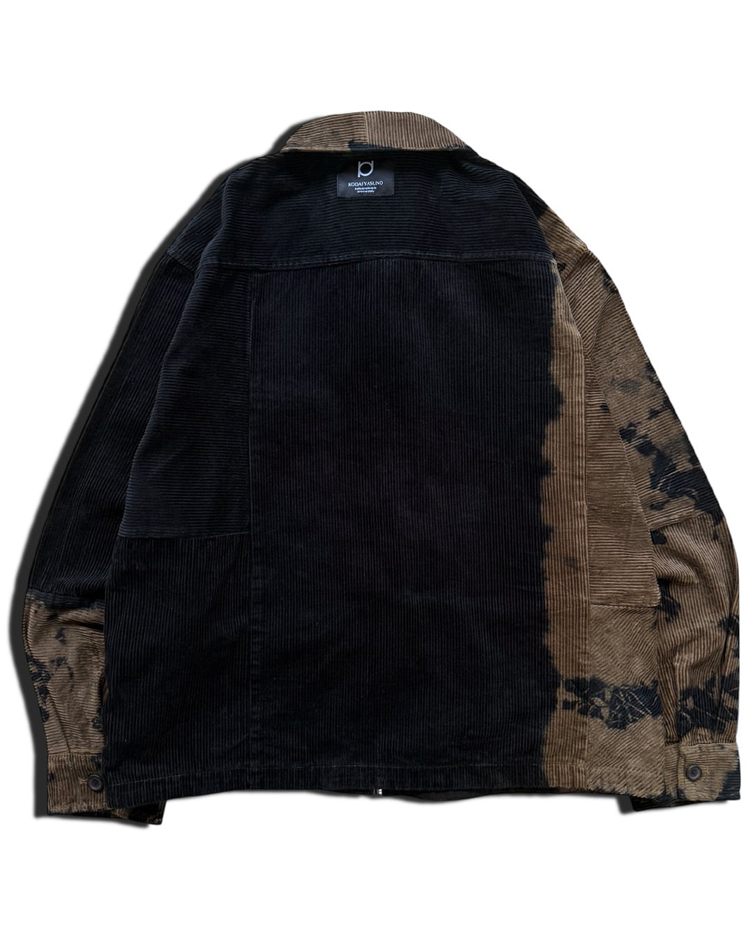 身ごろの右側と右袖、襟、左袖の一部を絞り、黒のタイダイ柄にブラウン、それ以外の部分を黒1色に染色したコーデュロイ生地のジャケット。