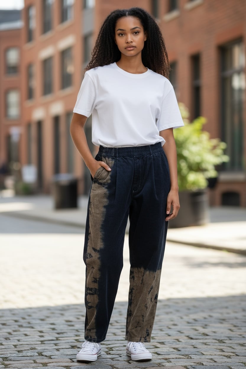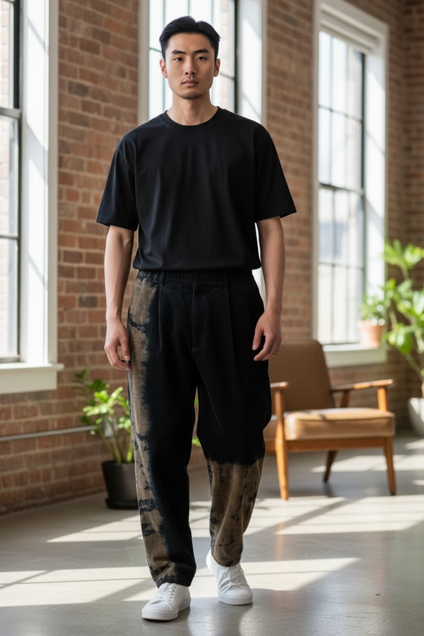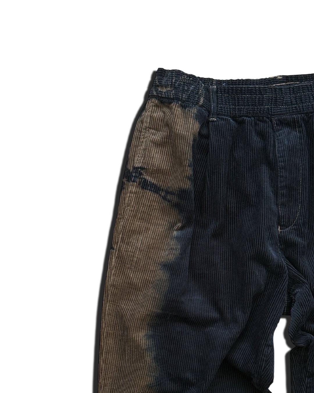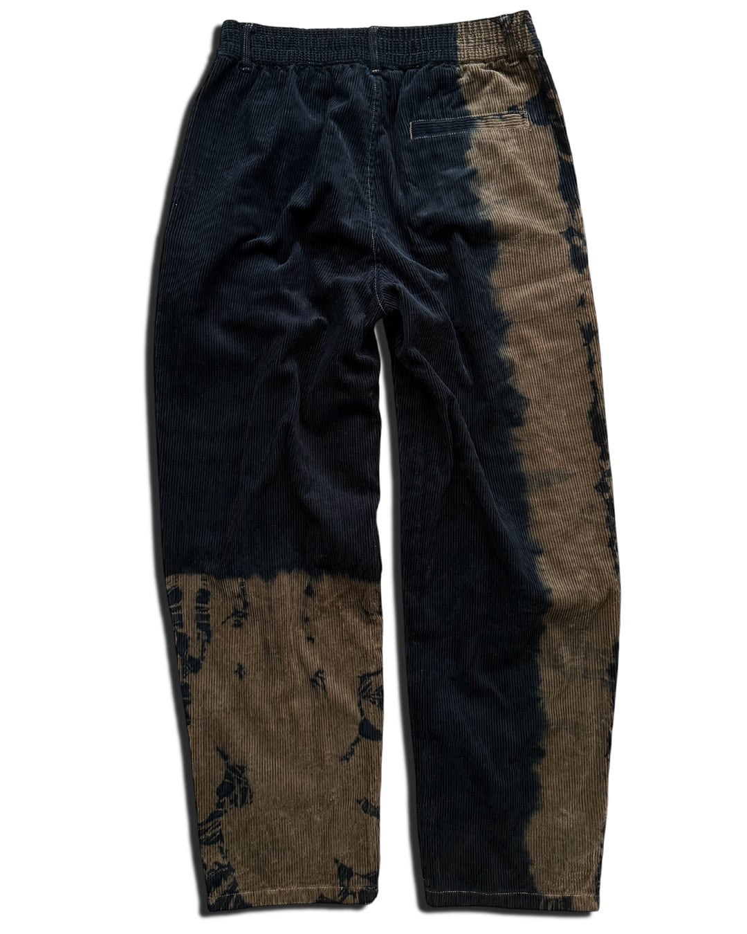 右側と左裾の一部を絞り、黒のタイダイ柄にブラウン、それ以外の部分を黒1色に染色したコーデュロイ生地のパンツ。
