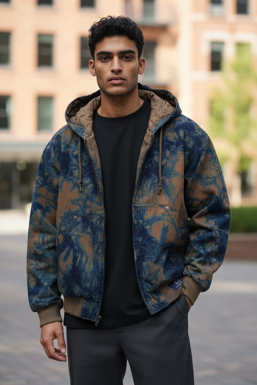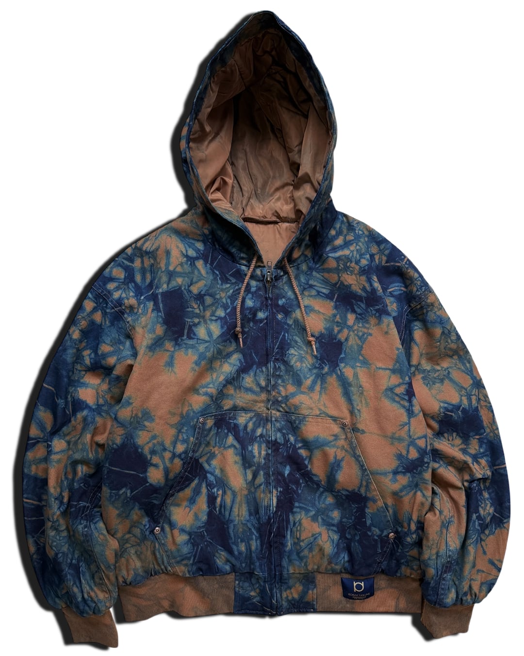 全体に絞りを加えて不規則な藍染のタイダイ柄を入れた中綿フードブルゾン。