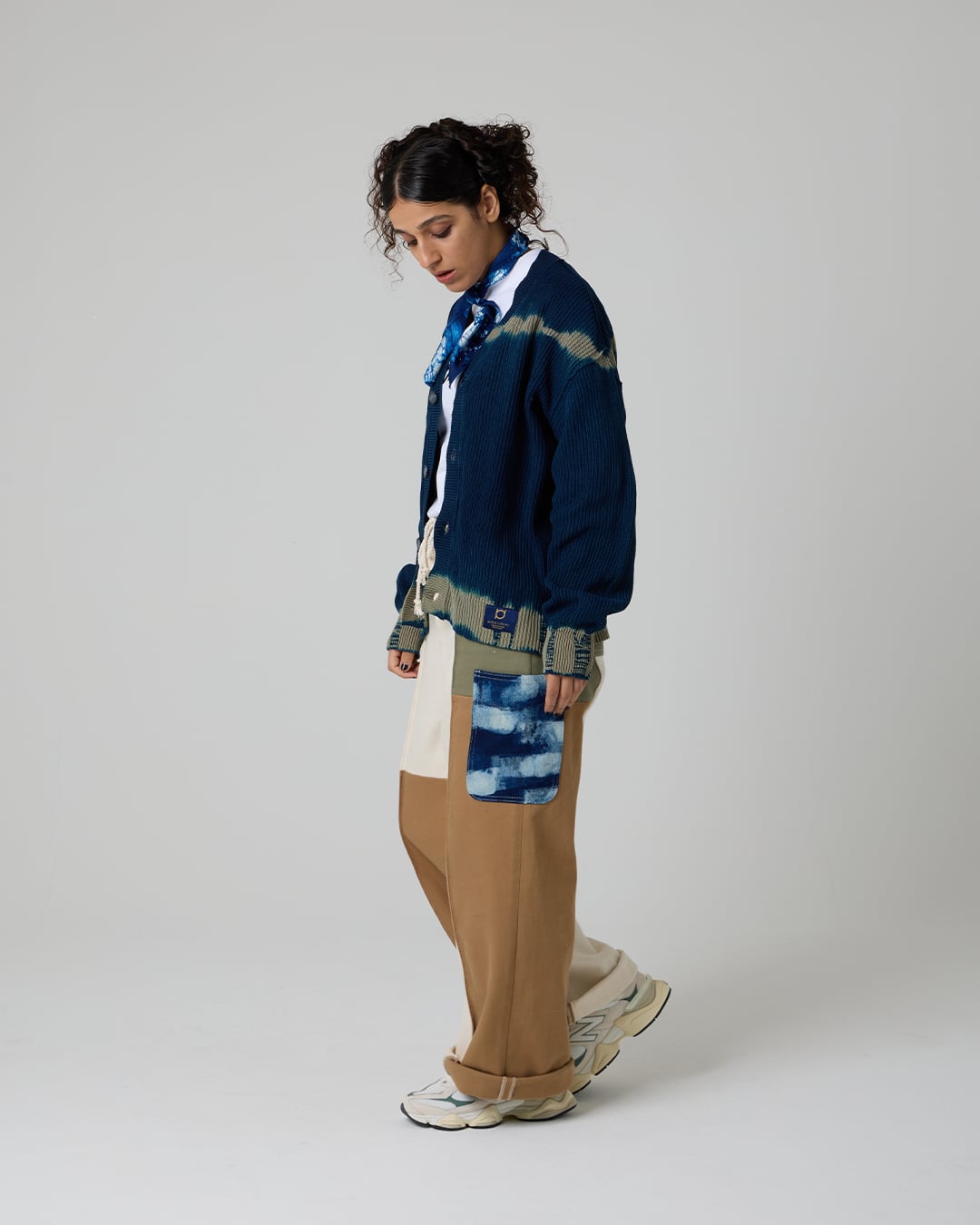 一部に絞りを加えて、ベージュと藍色に染色をしたニットカーディガン。