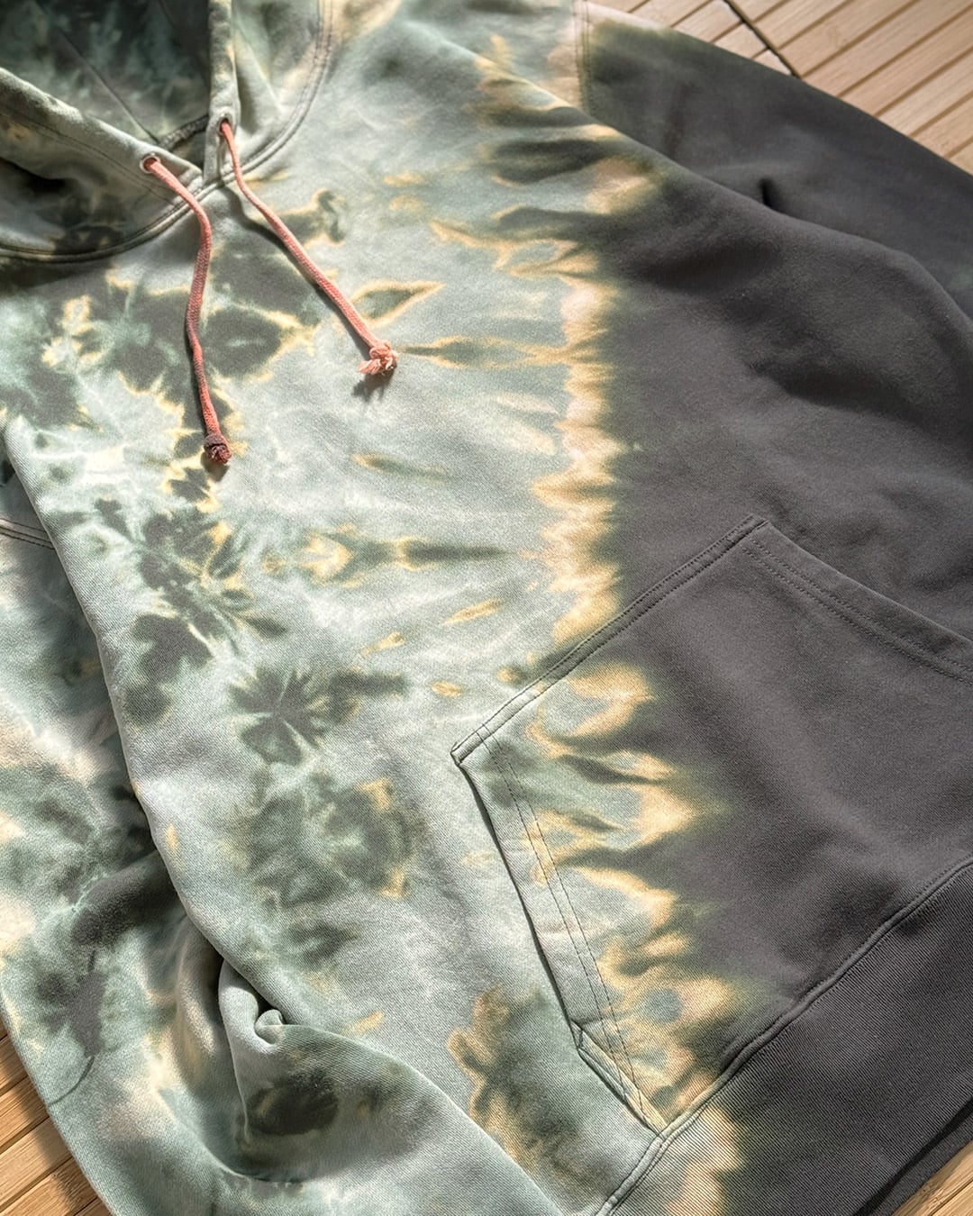 右斜め上部分を独自技法のブリーチにより緑・黄緑・ベージュの三色のタイダイ柄に染色したプルオーバーフーディー。