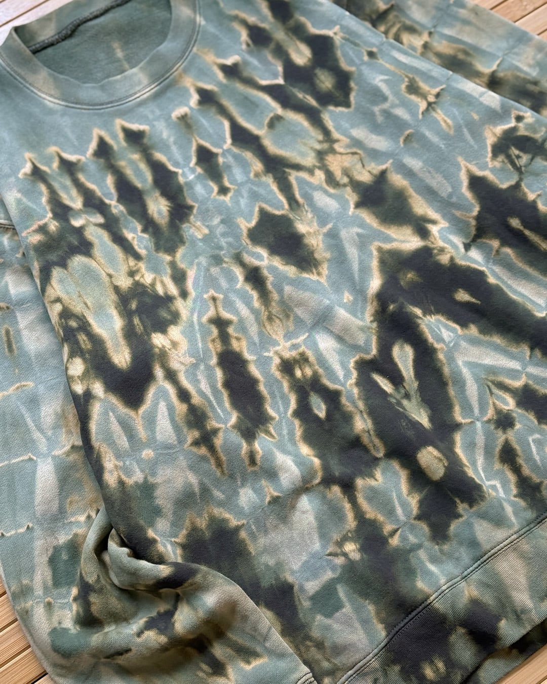 全体を縦に伸びるタイダイ柄に染色したパイル生地のトレーナー。