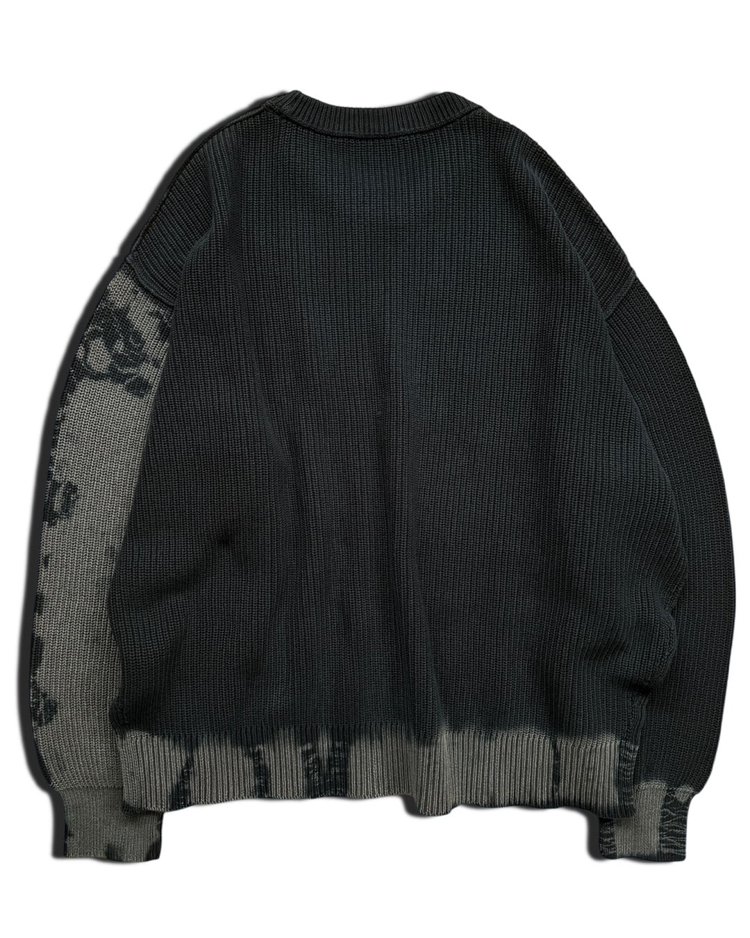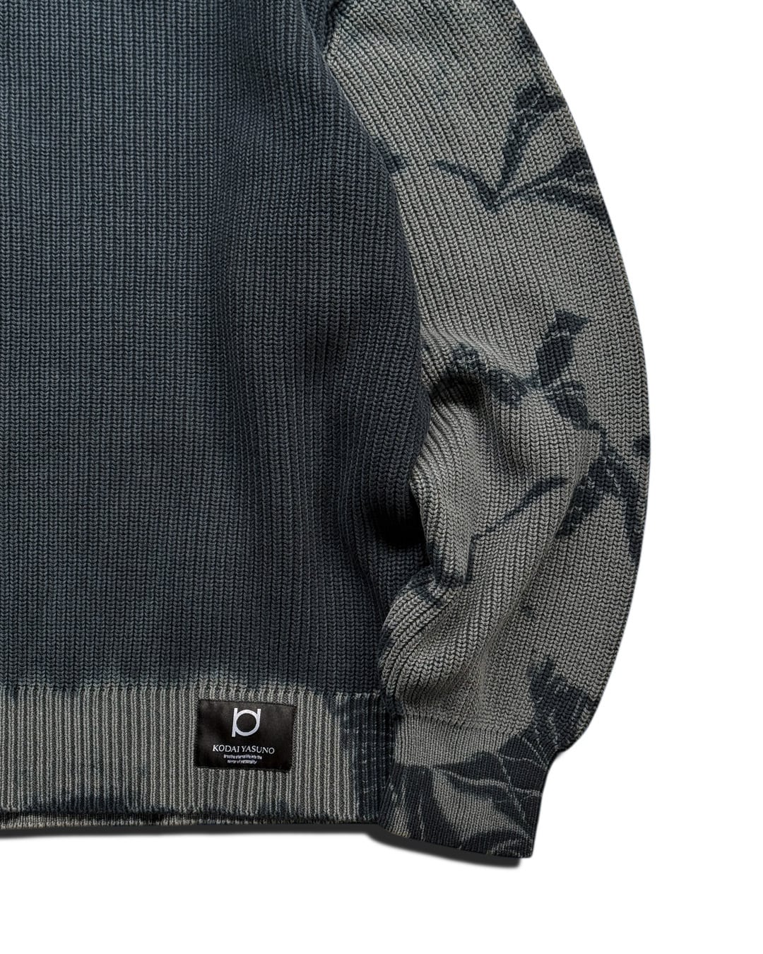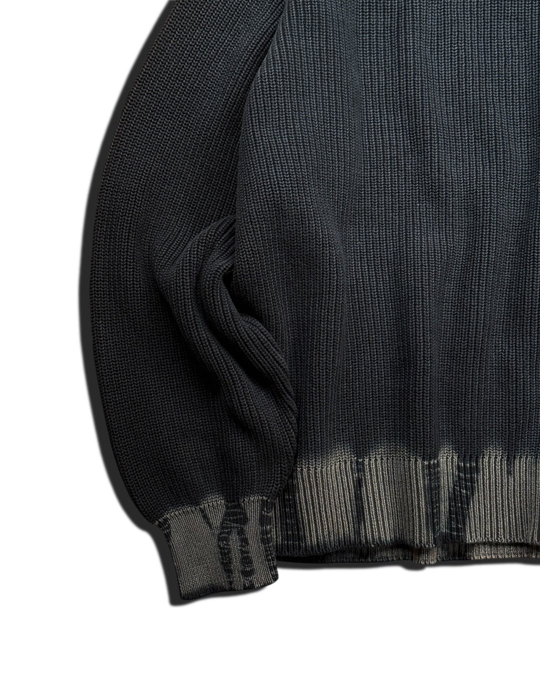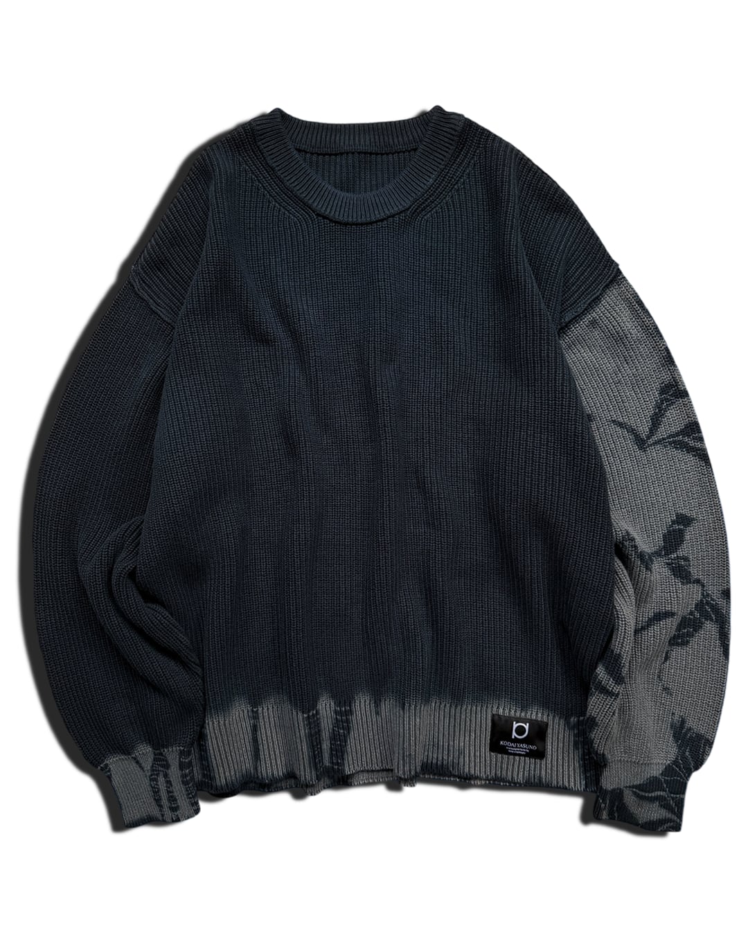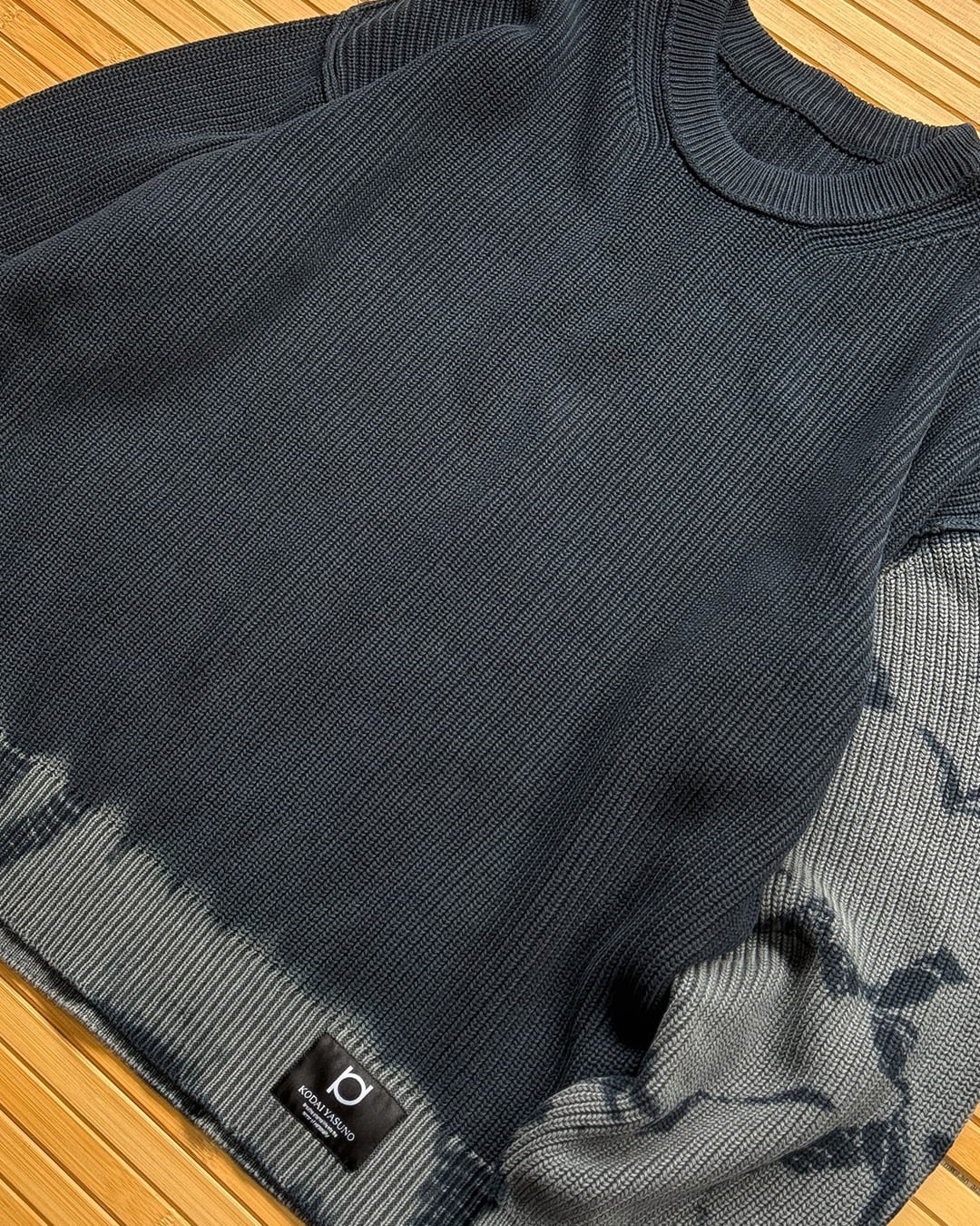 左袖と裾、右袖口をグレーにし絞りを加え、黒染めをして制作したコットンニット。