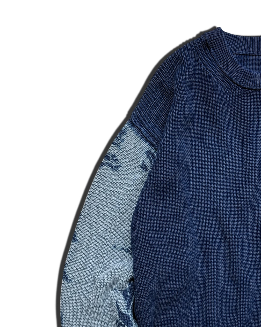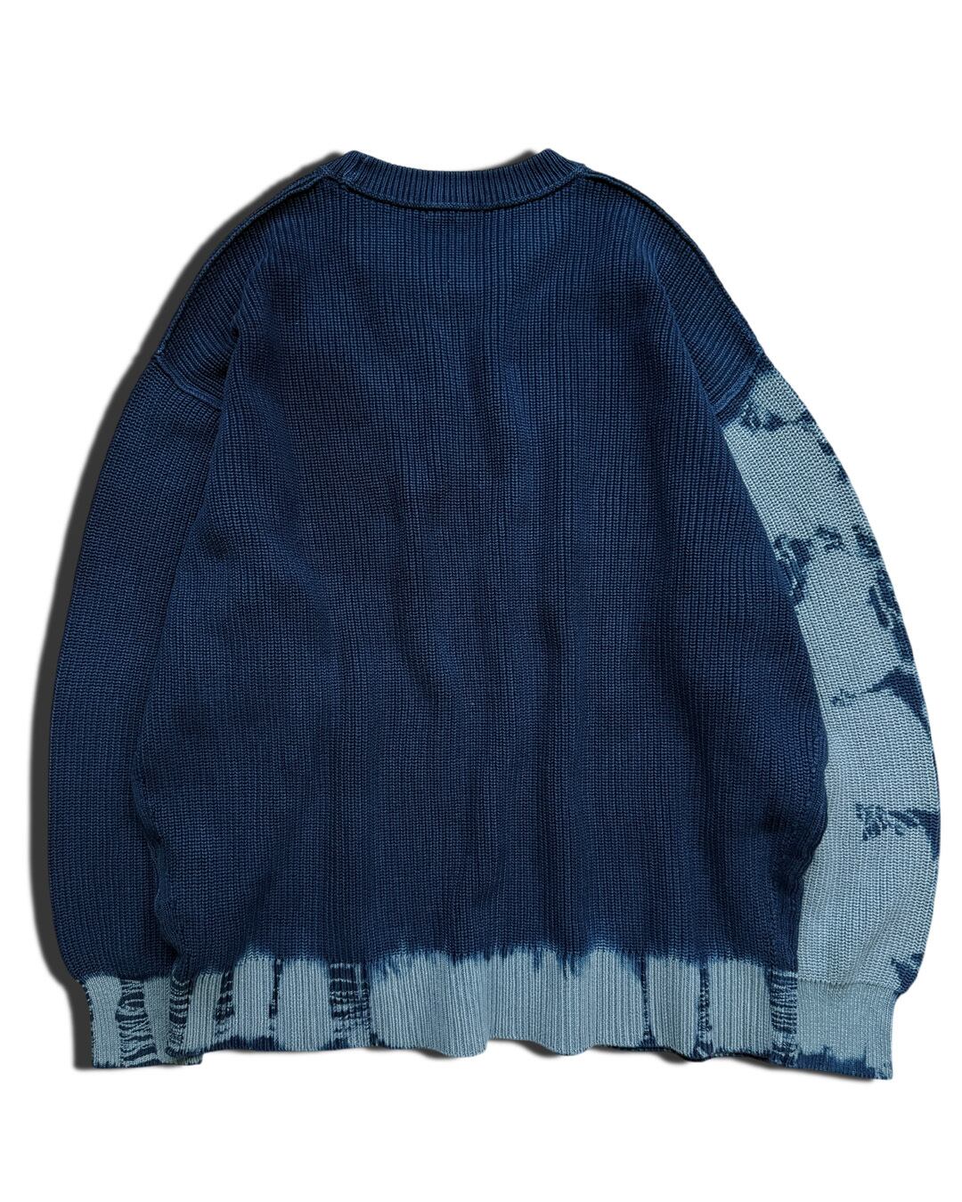 左袖と裾、右袖口を水色に絞りを加え、藍染めをして制作したコットンニット。