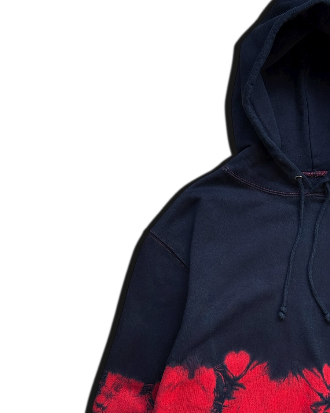上部を藍一色に、下部を赤に藍のタイダイ柄が入るように染色したプルオーバーフーディー。