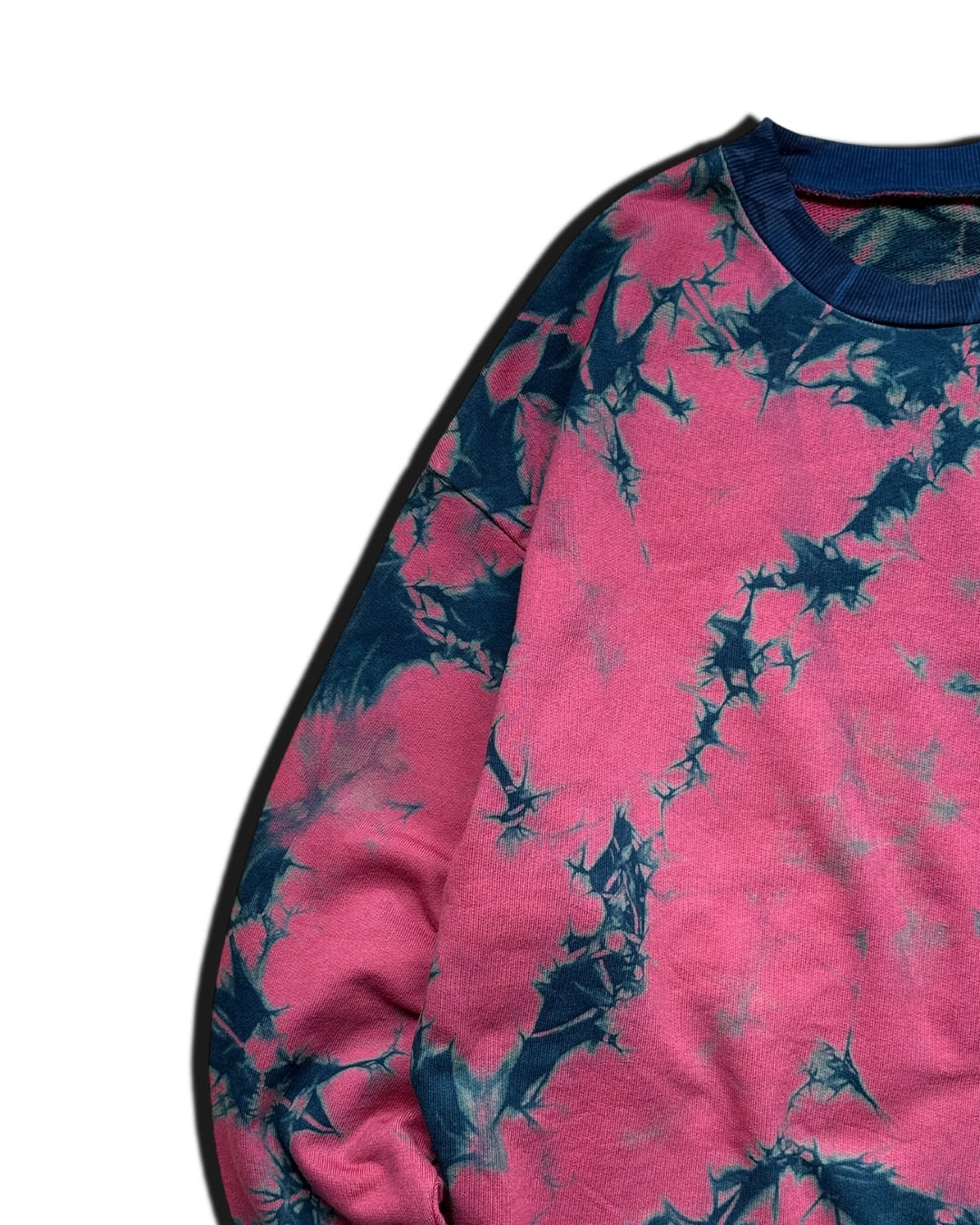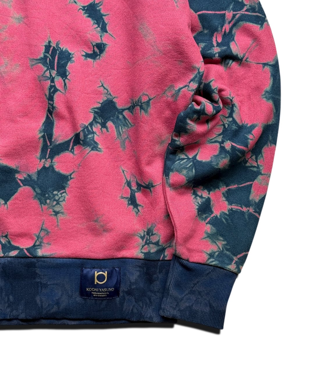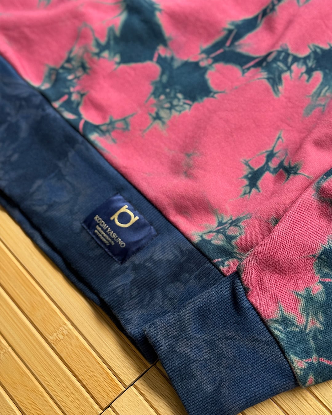 全体を紫味がかった絶妙な色のピンクに藍染めのタイダイ柄が入るように染色したトレーナー。