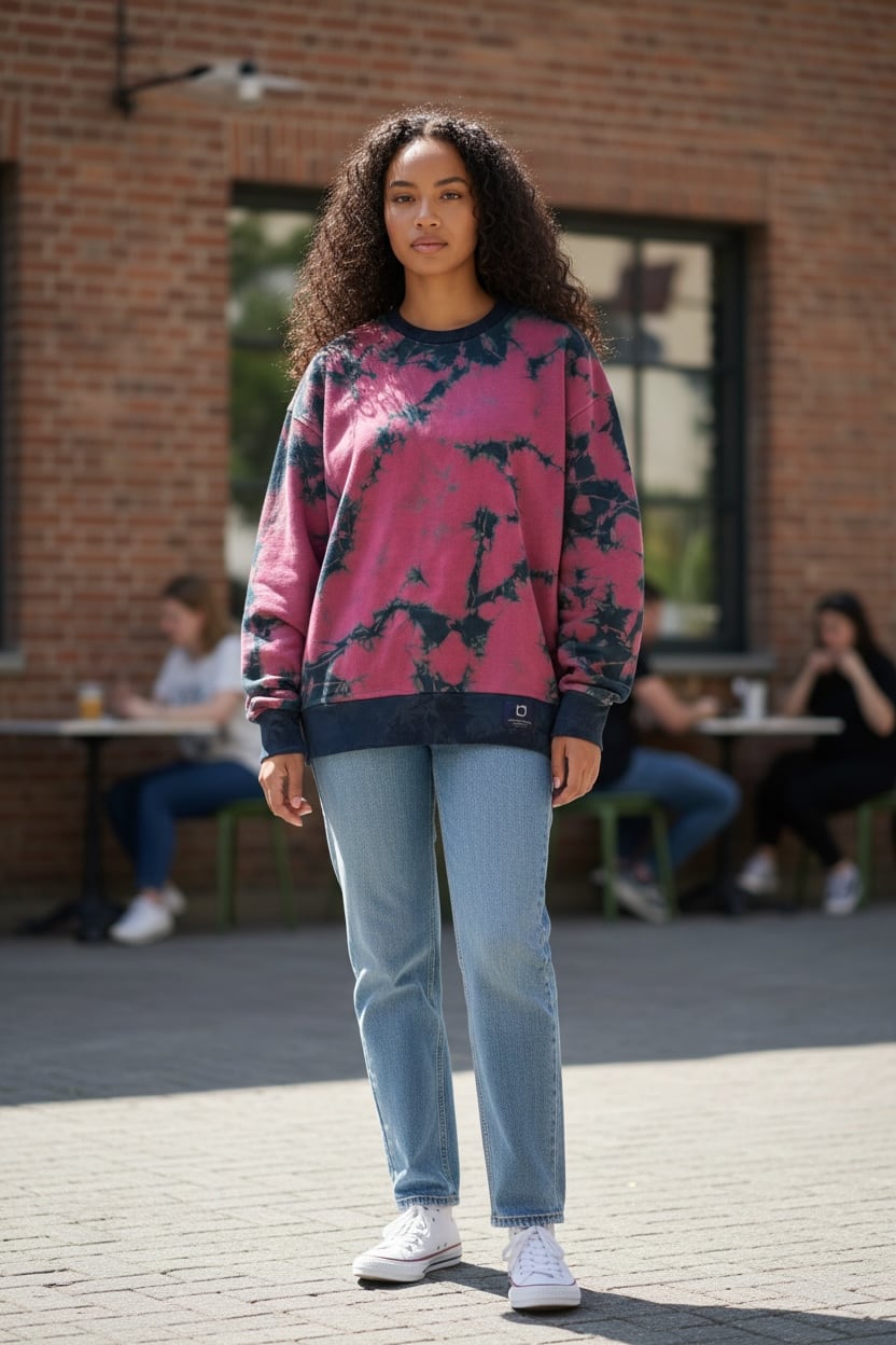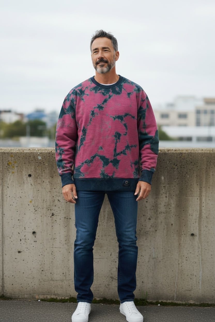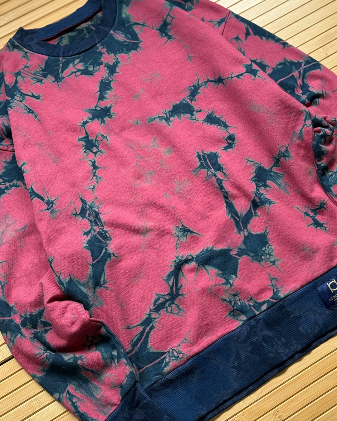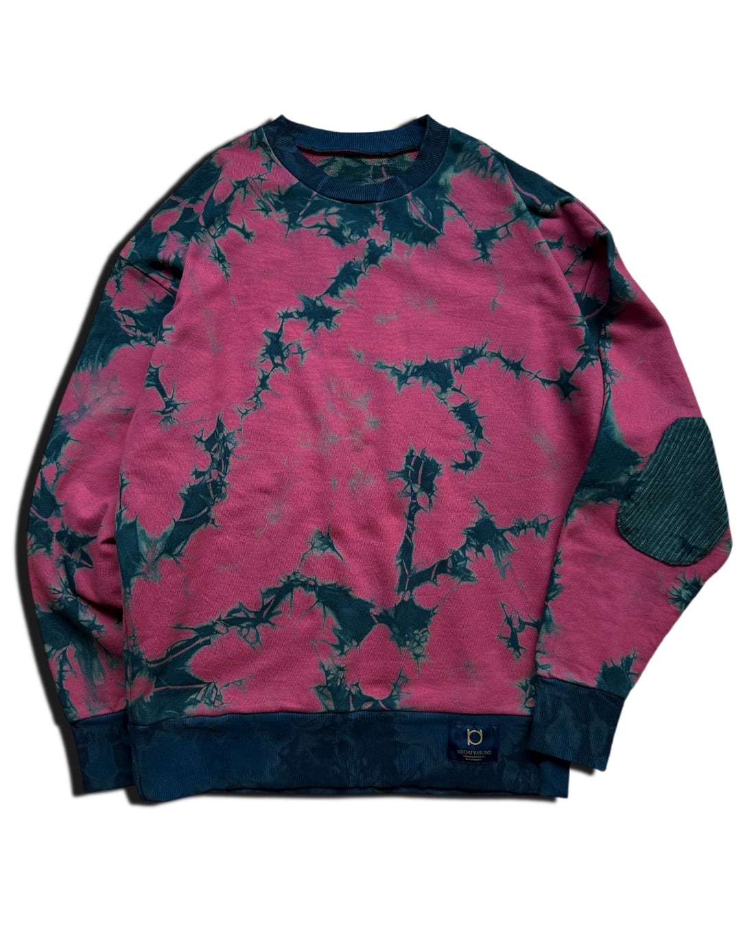 全体を紫味がかった絶妙な色のピンクに藍染めのタイダイ柄が入るように染色したトレーナー。