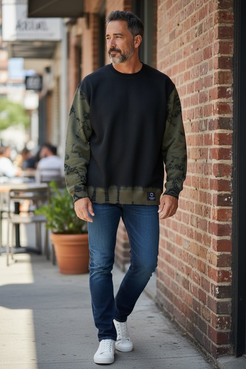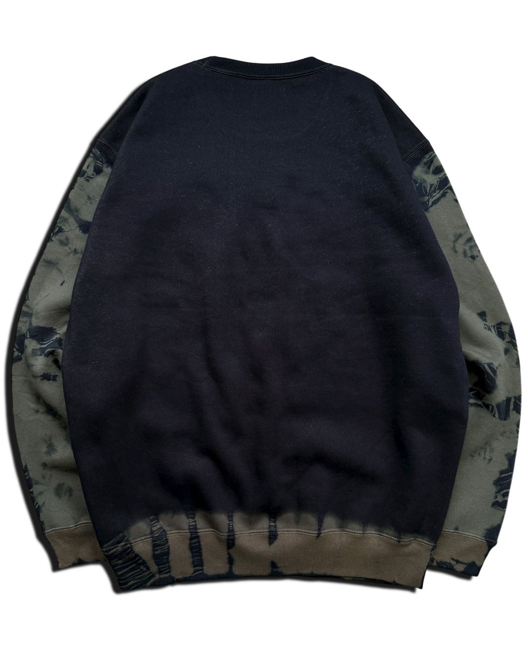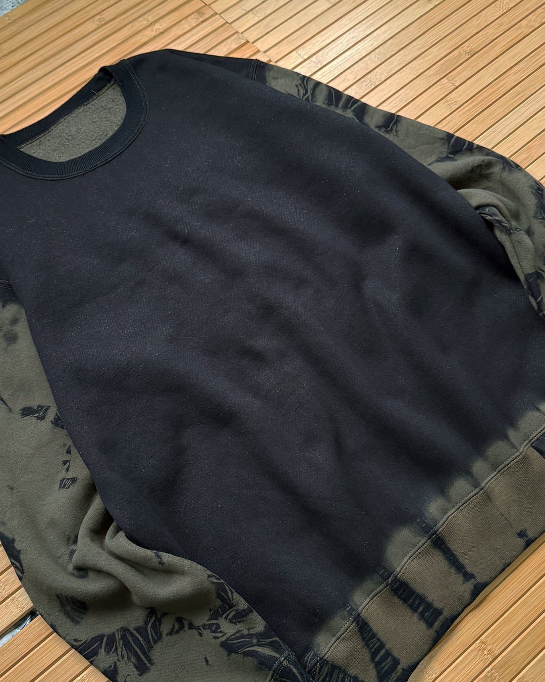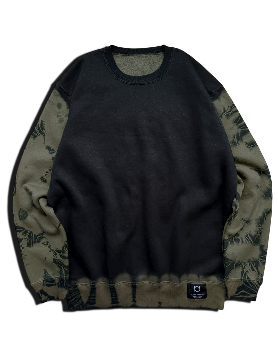 両袖と裾に絞りを加え、袖がカーキ、袖と裾リブがブラウンに近いカーキに黒のタイダイ柄、身ごろを黒一色に染色した裏起毛トレーナー。