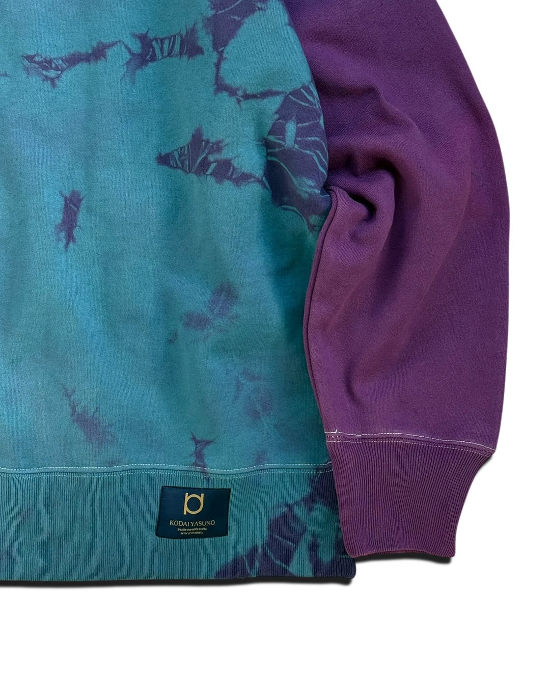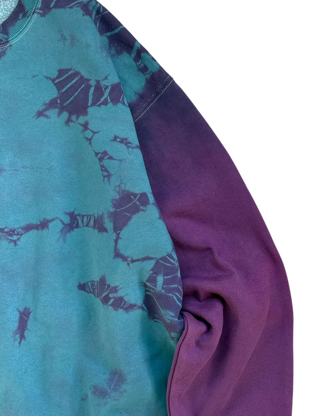 身ごろを水色と紫のタイダイ柄に、袖を赤味のある紫色に染色をしたヘビーオンスのトレーナー。