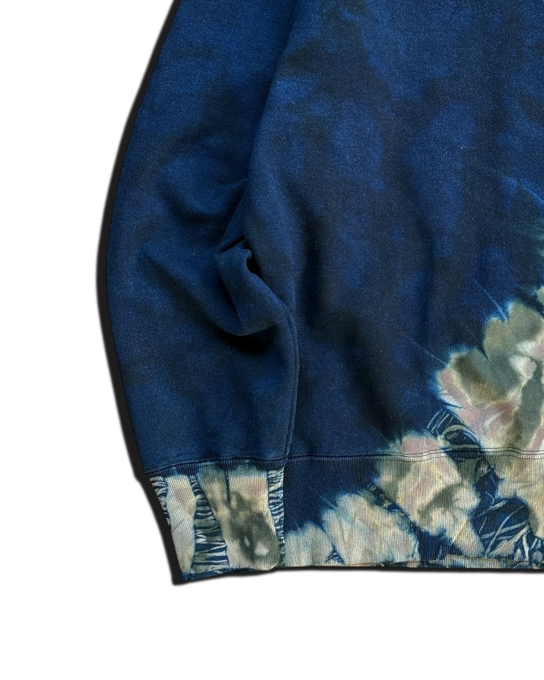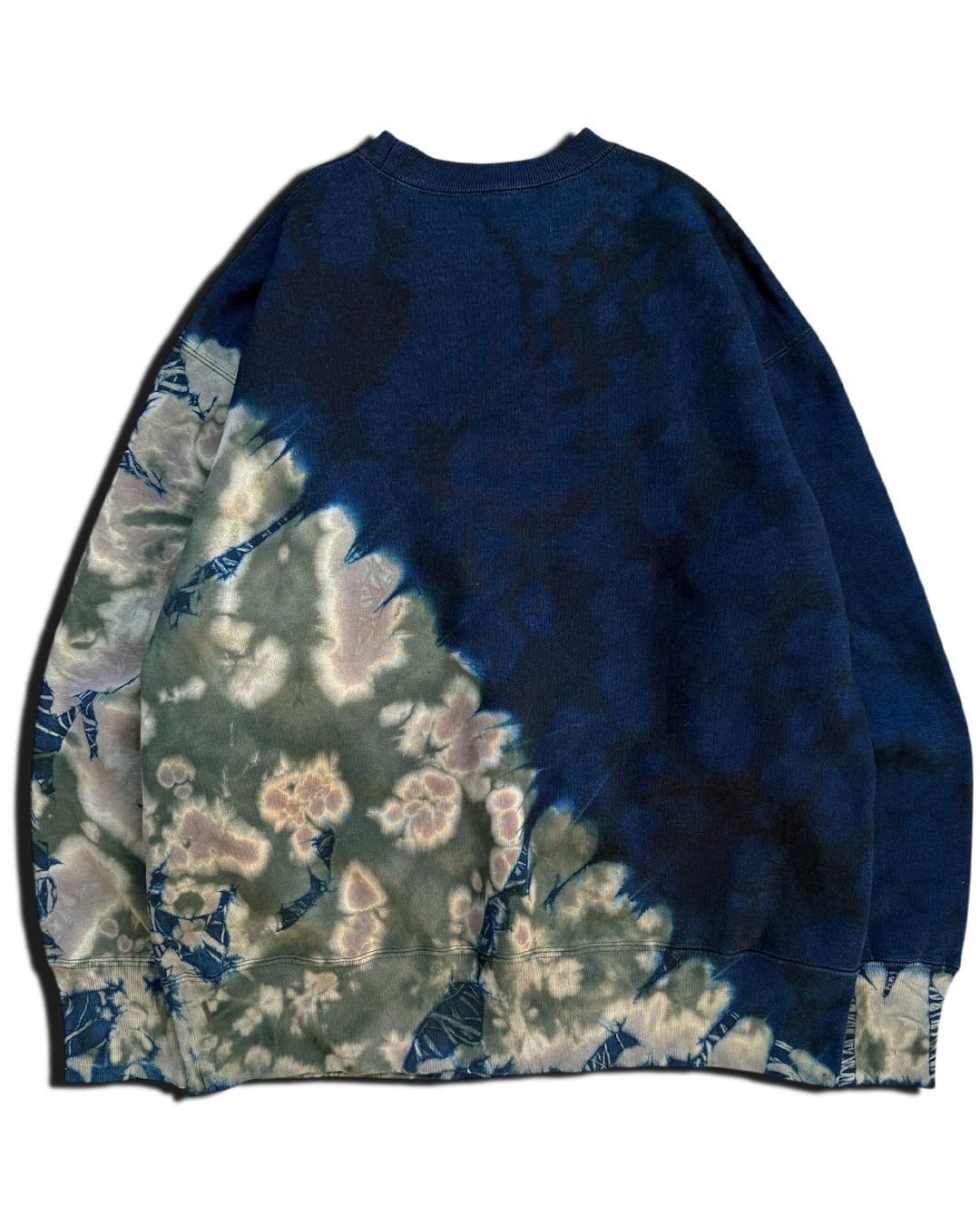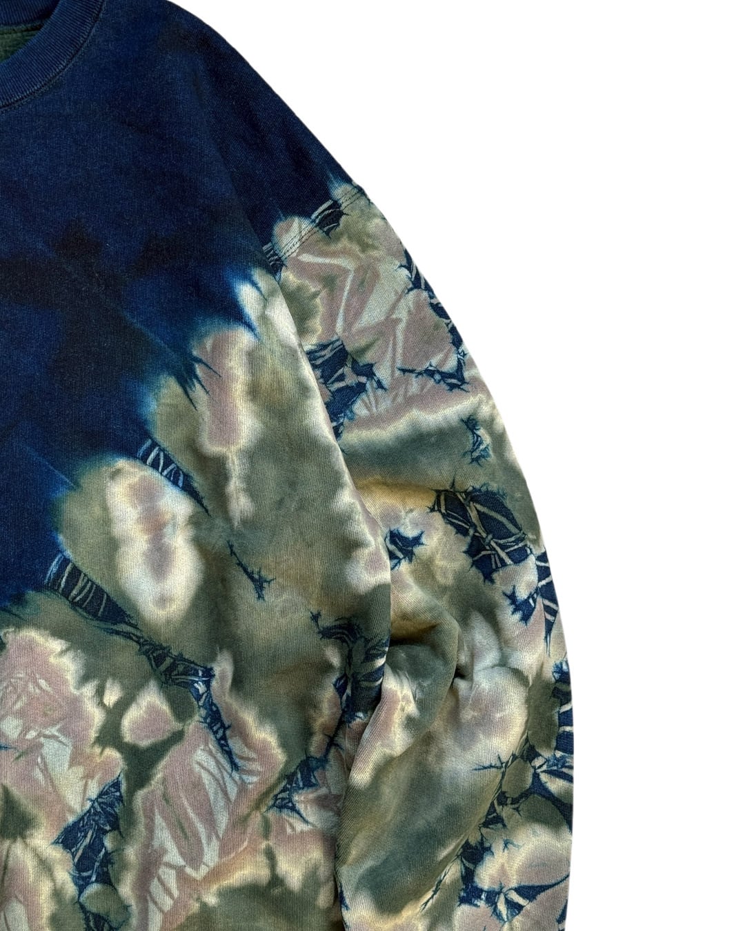 身ごろ斜め半分を藍染めで藍色1色に若干のタイダイ柄が入るように、斜め下半分と右袖口を緑、ベージュ、茶色、藍のタイダイ柄にに染色をしたヘビーオンスのトレーナー。