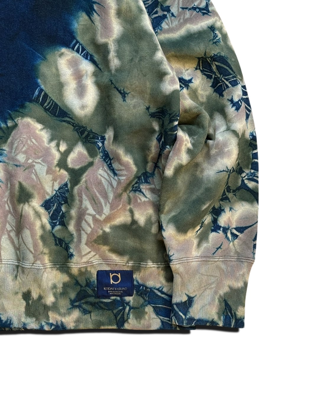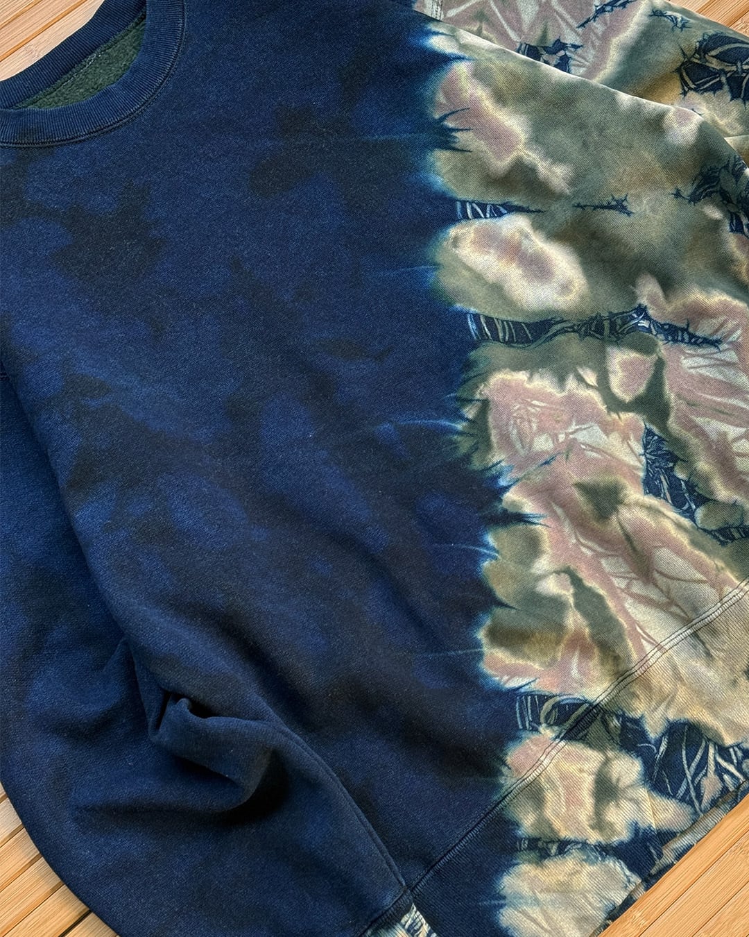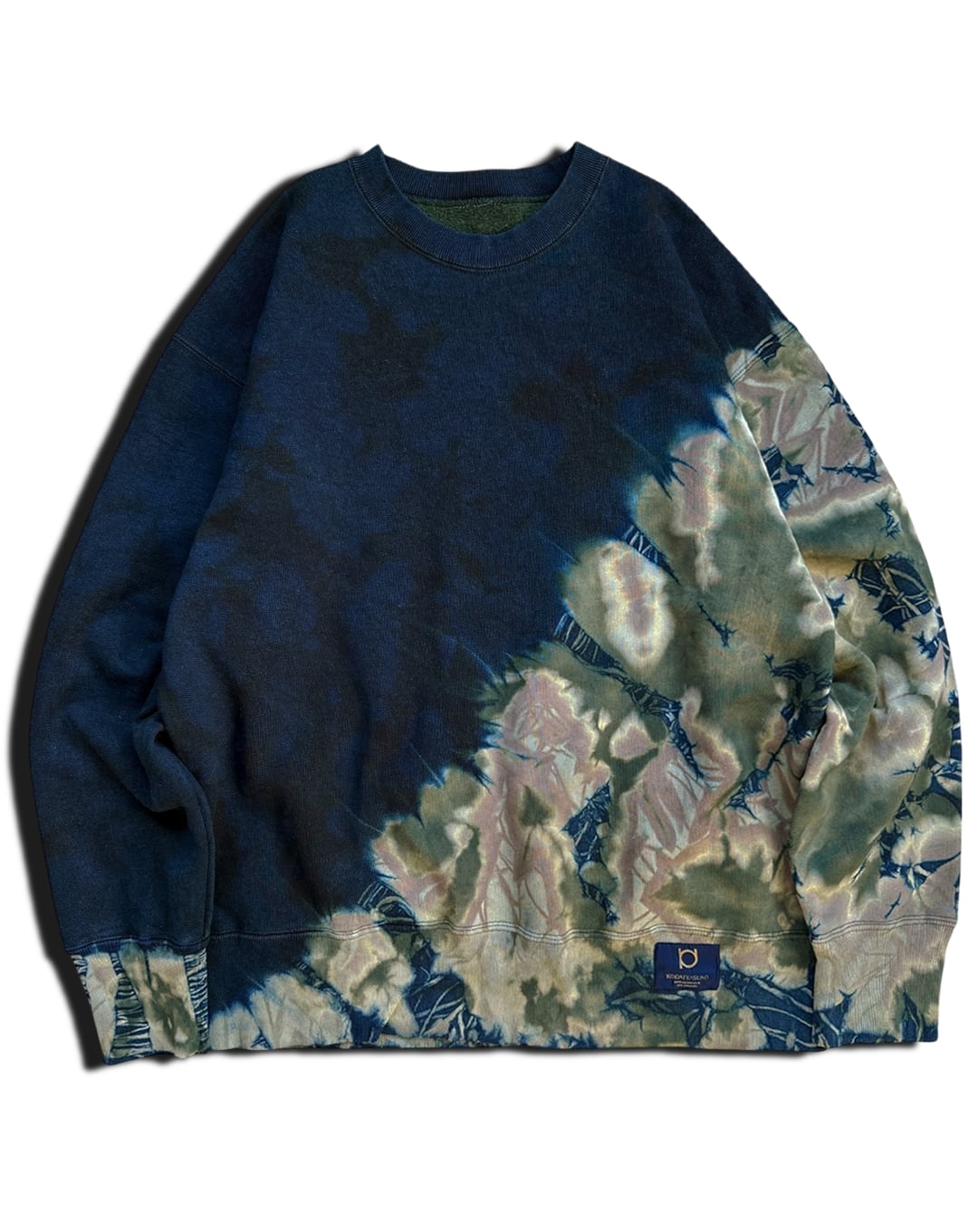 身ごろ斜め半分を藍染めで藍色1色に若干のタイダイ柄が入るように、斜め下半分と右袖口を緑、ベージュ、茶色、藍のタイダイ柄にに染色をしたヘビーオンスのトレーナー。