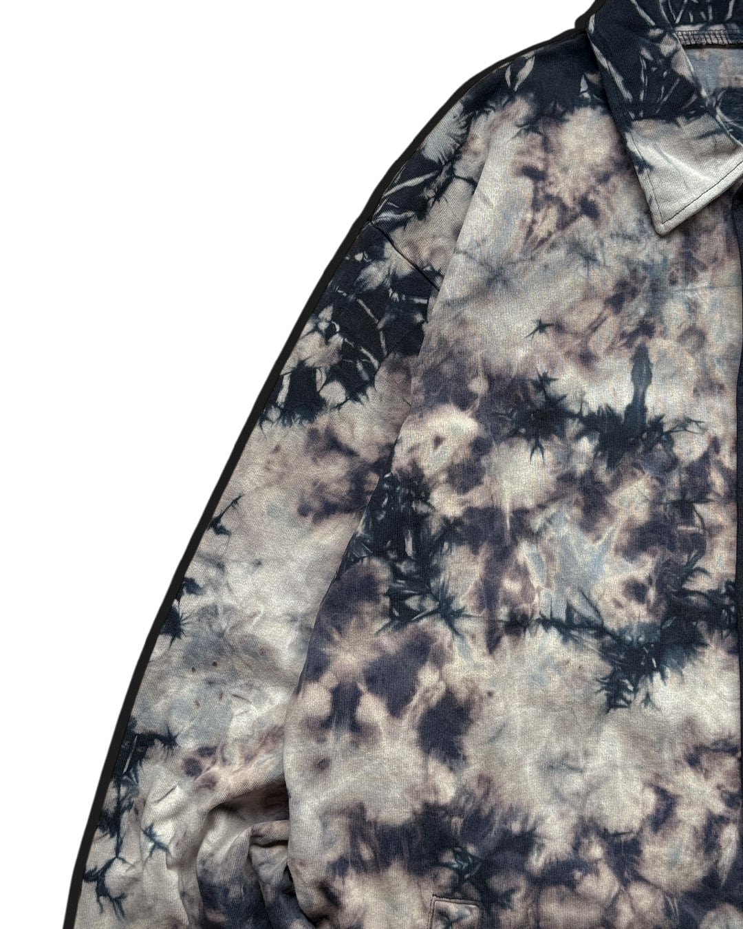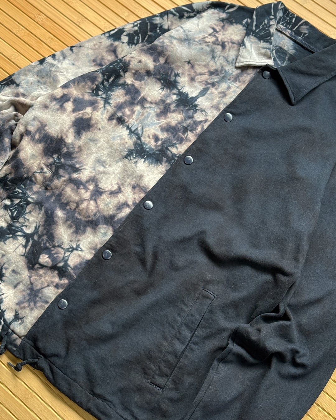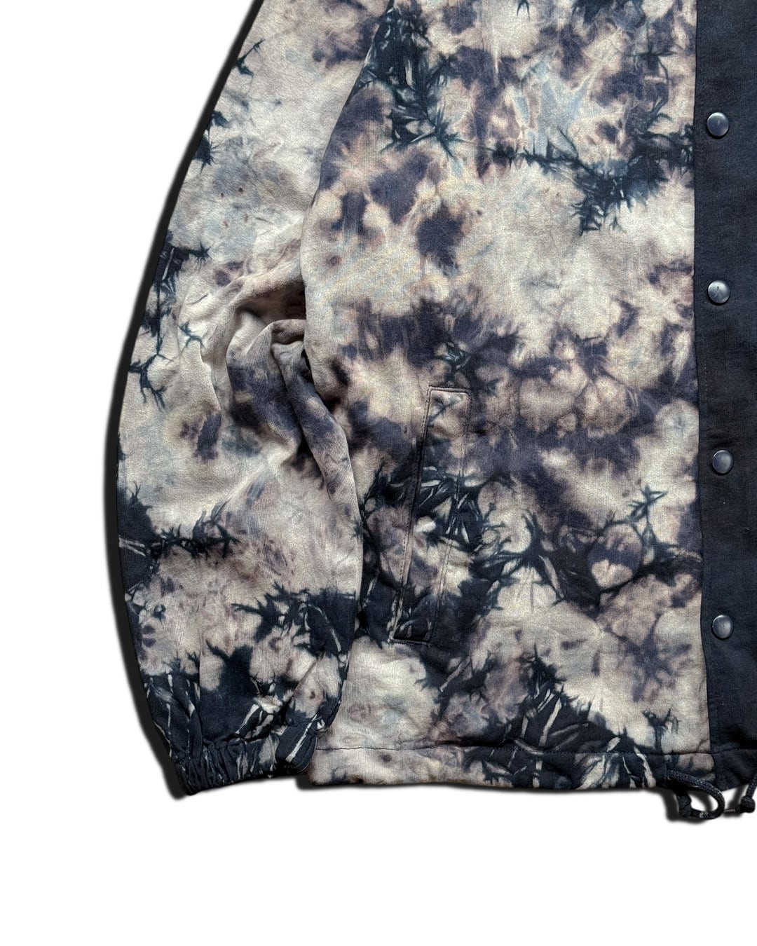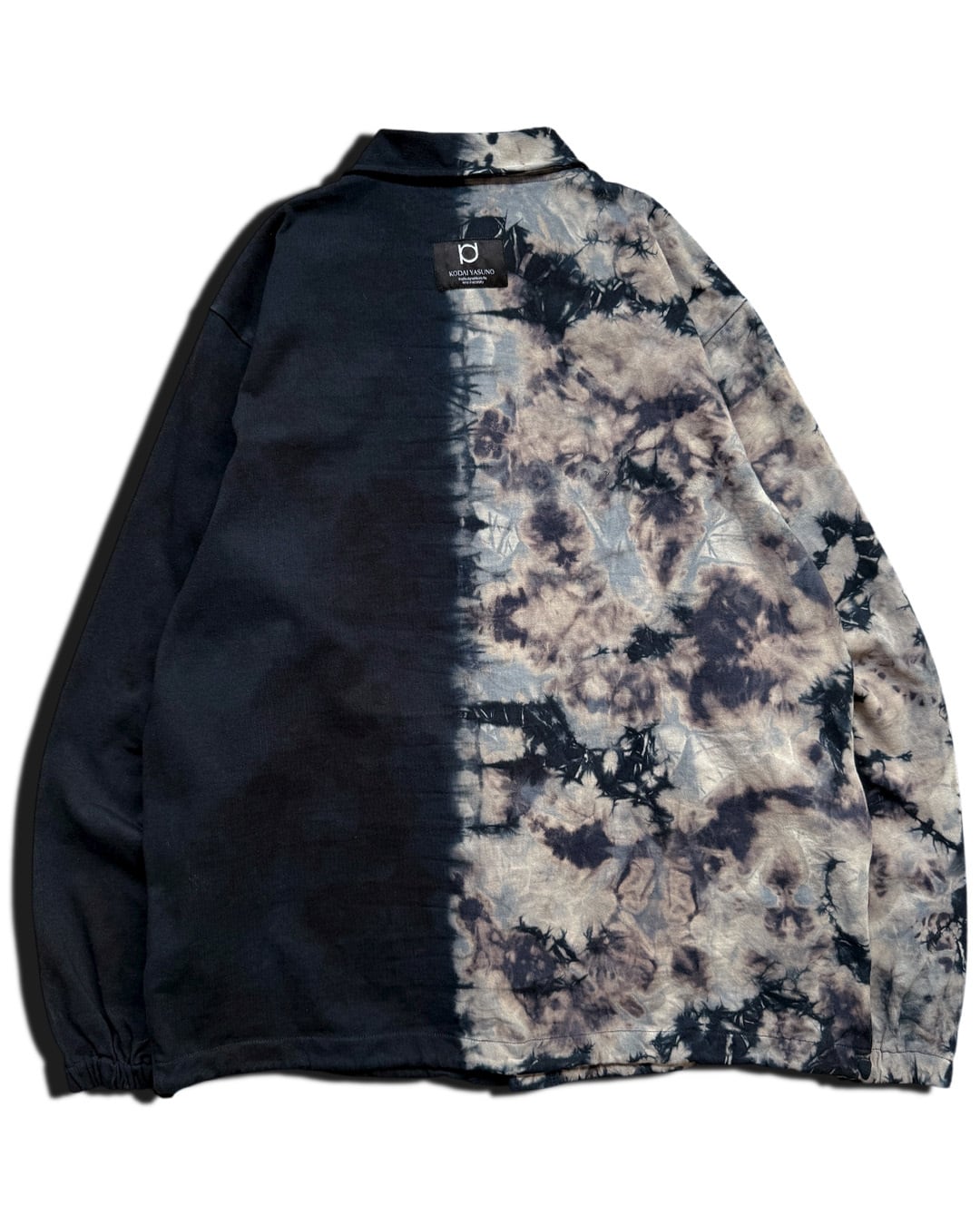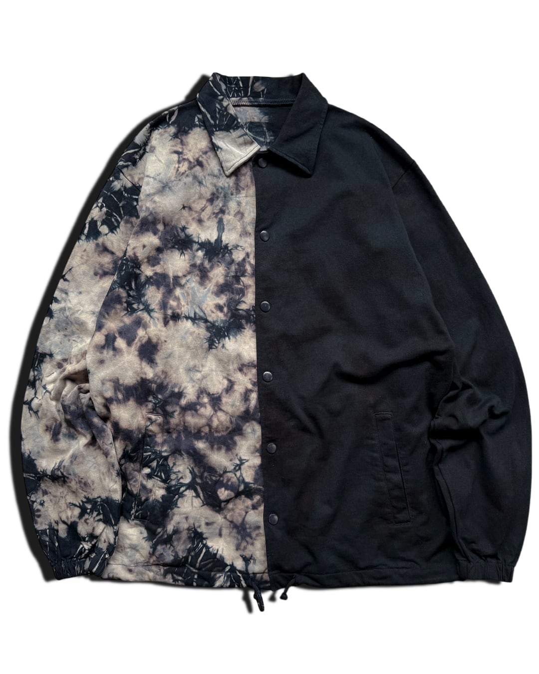 右半分をブリーチにてネイビーとベージュの立体感のあるタイダイ柄にしたのち、左半分を黒染めにて黒に染色したコットンジャージーコーチジャケット。