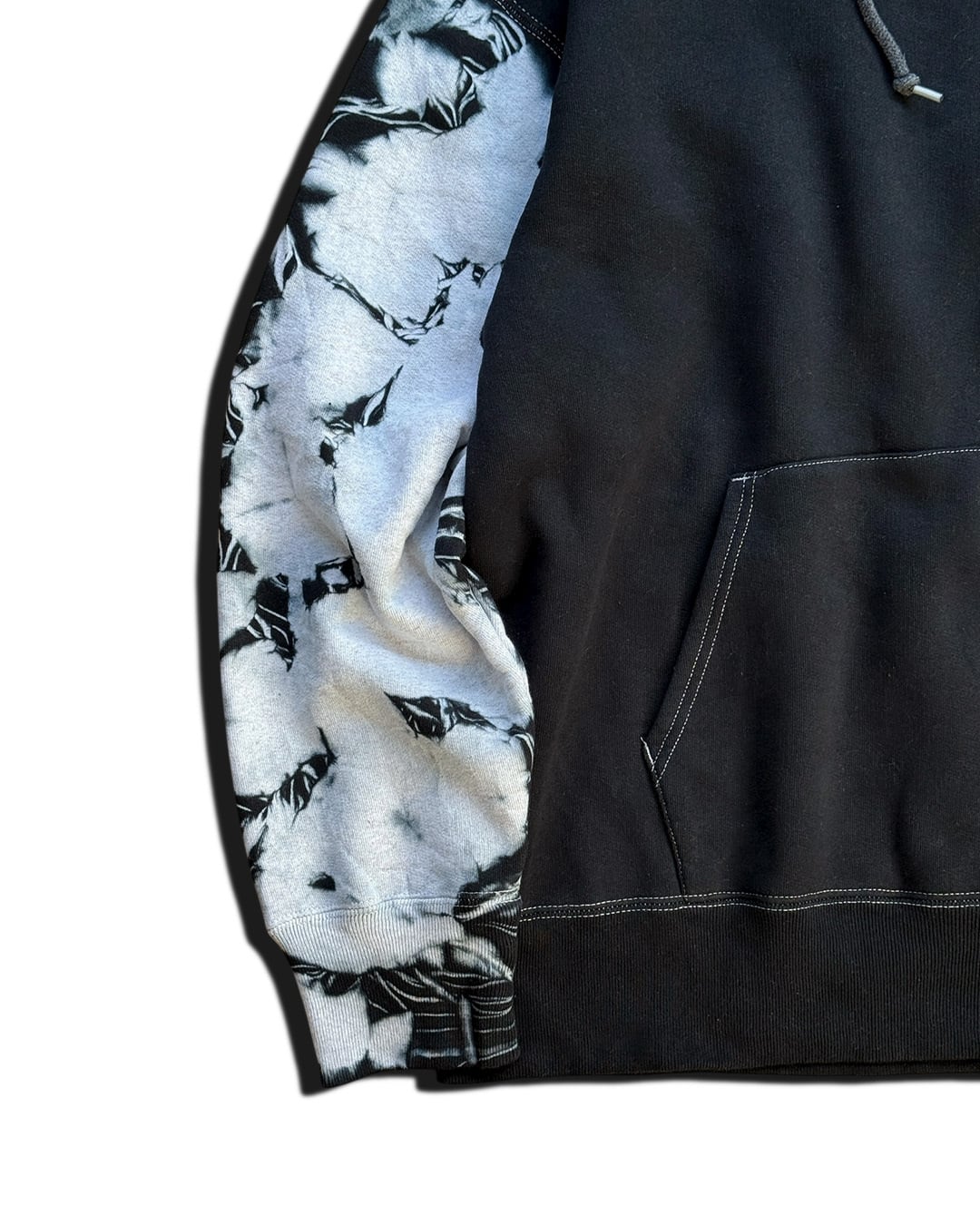 身ごろを黒一色に、袖とフードをグレーに黒のタイダイ柄が入るように染色をしたヘビーオンスのフーディー。