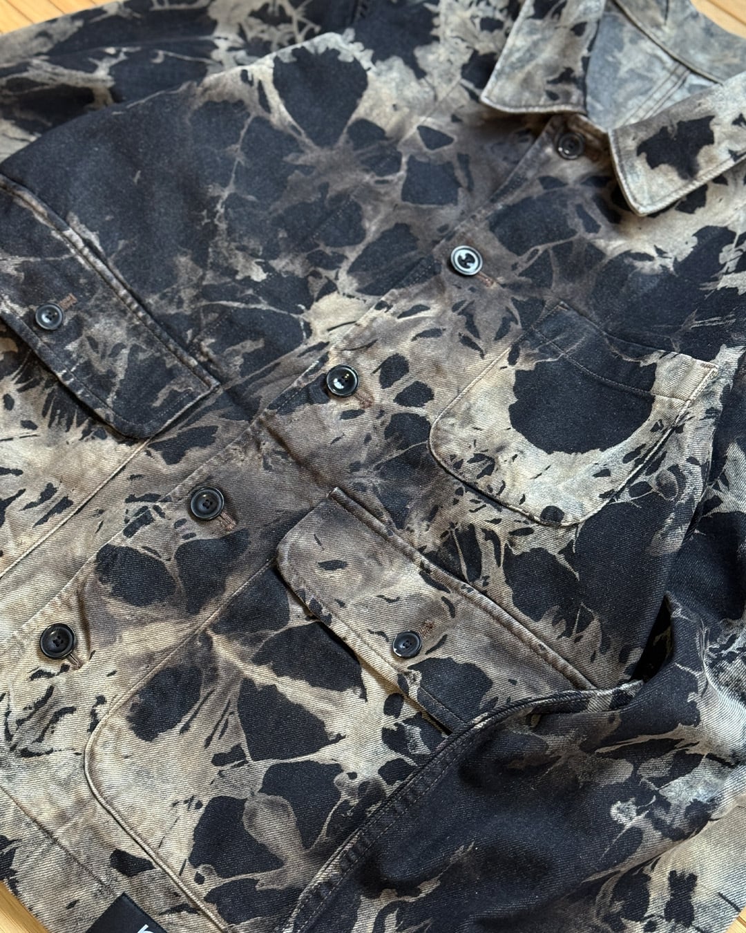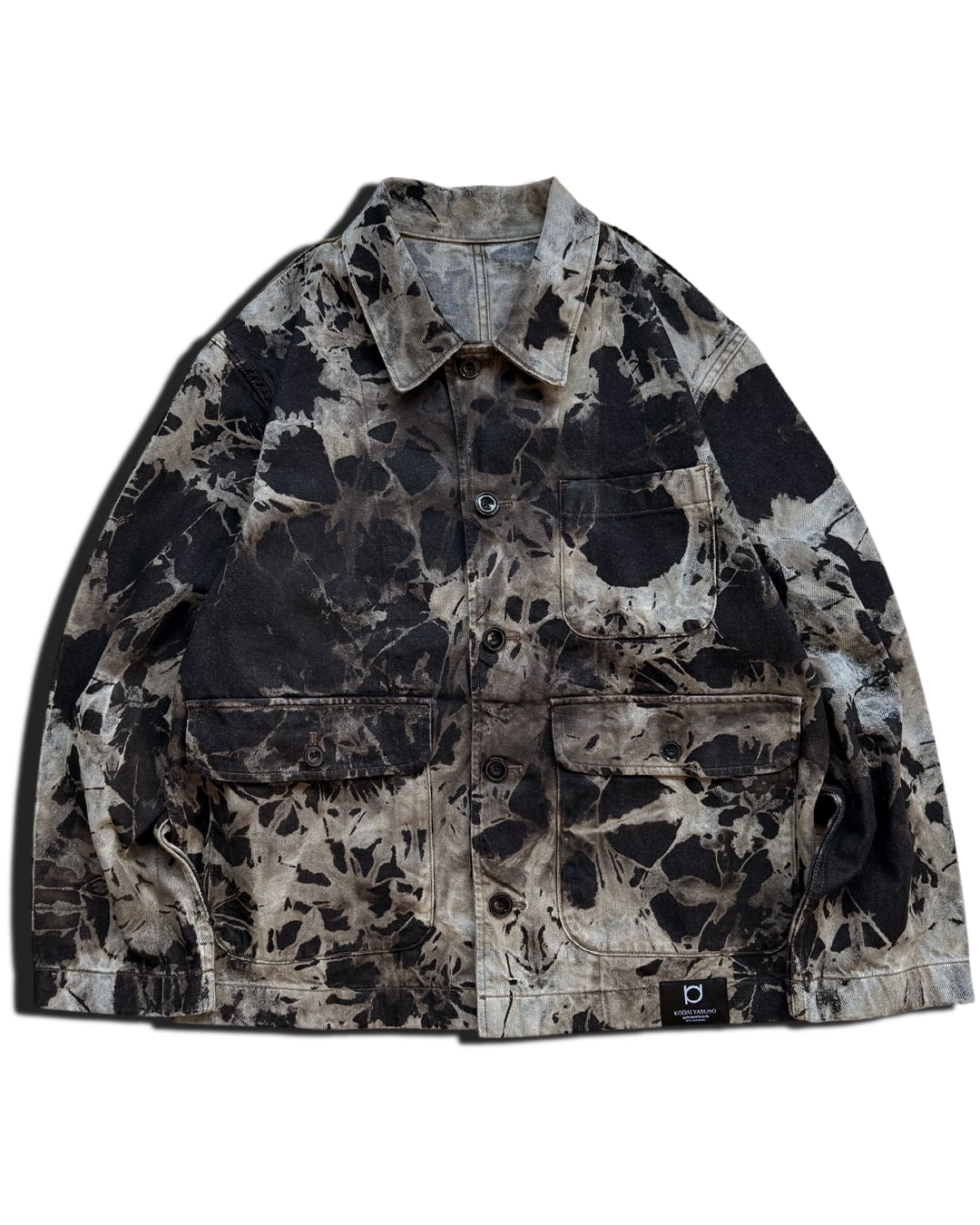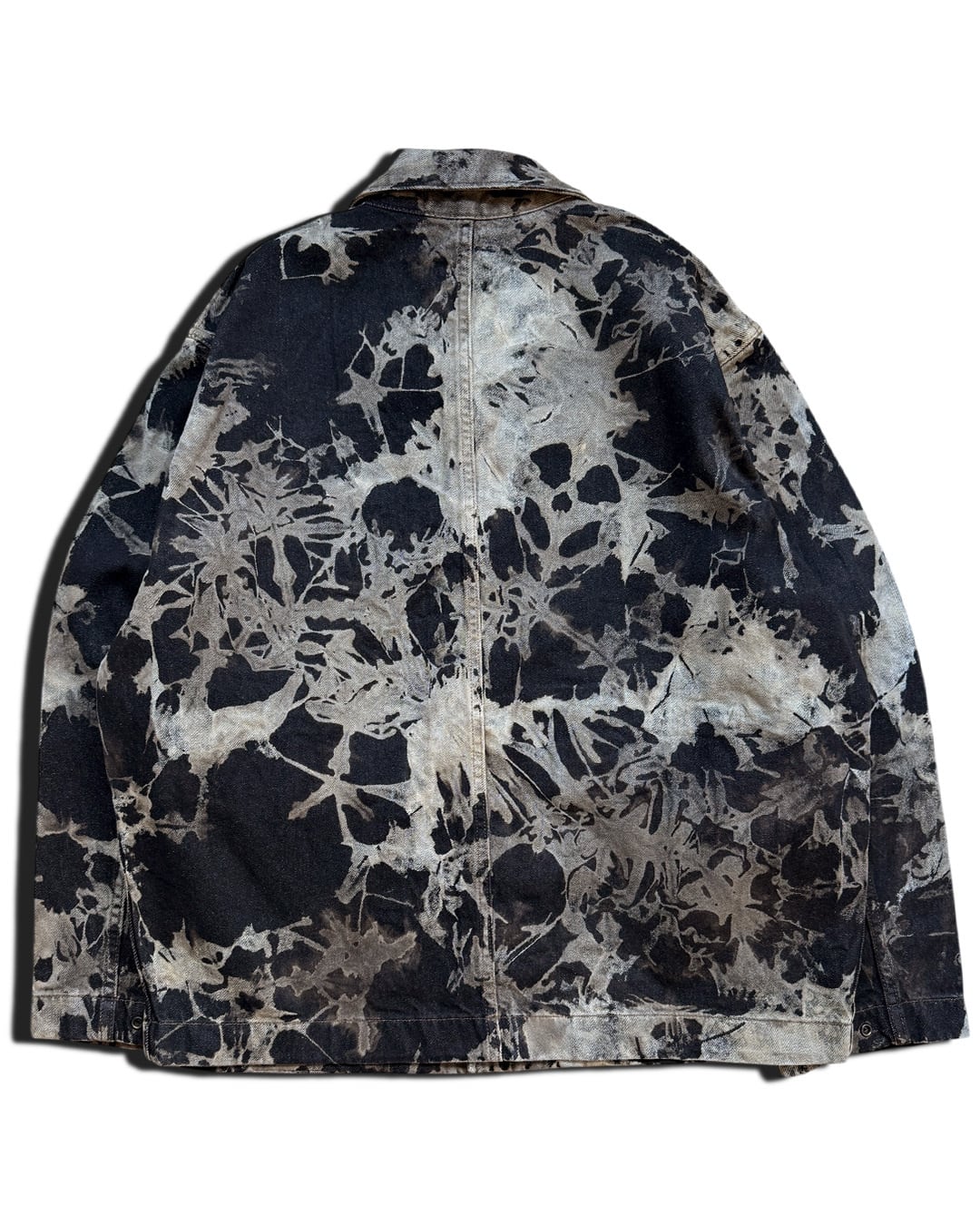 全体をタイダイ柄にブリーチして、黒と茶色味がかったベージュの不規則な柄に仕上げたデニムジャケット。濃い部分と薄い部分がランダムに配置されることで柄に立体感をだし、インパクトを出しました。個性的で唯一無二なデザインの1点でありつつも、渋い色合いに抑えることで着回しのしやすさも実現しました。