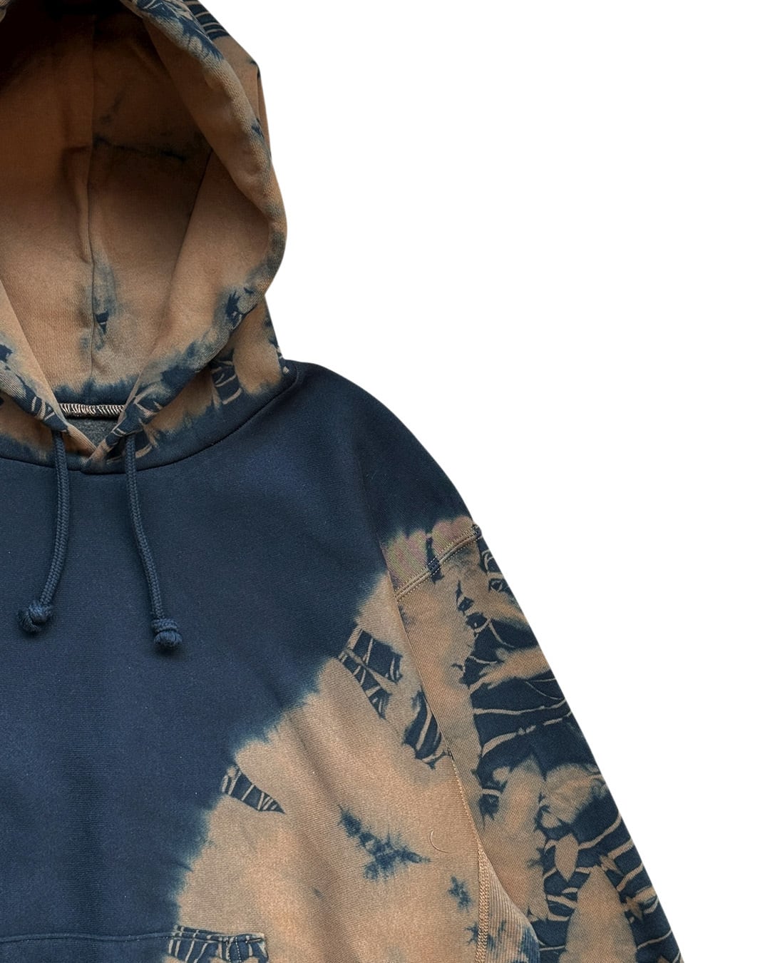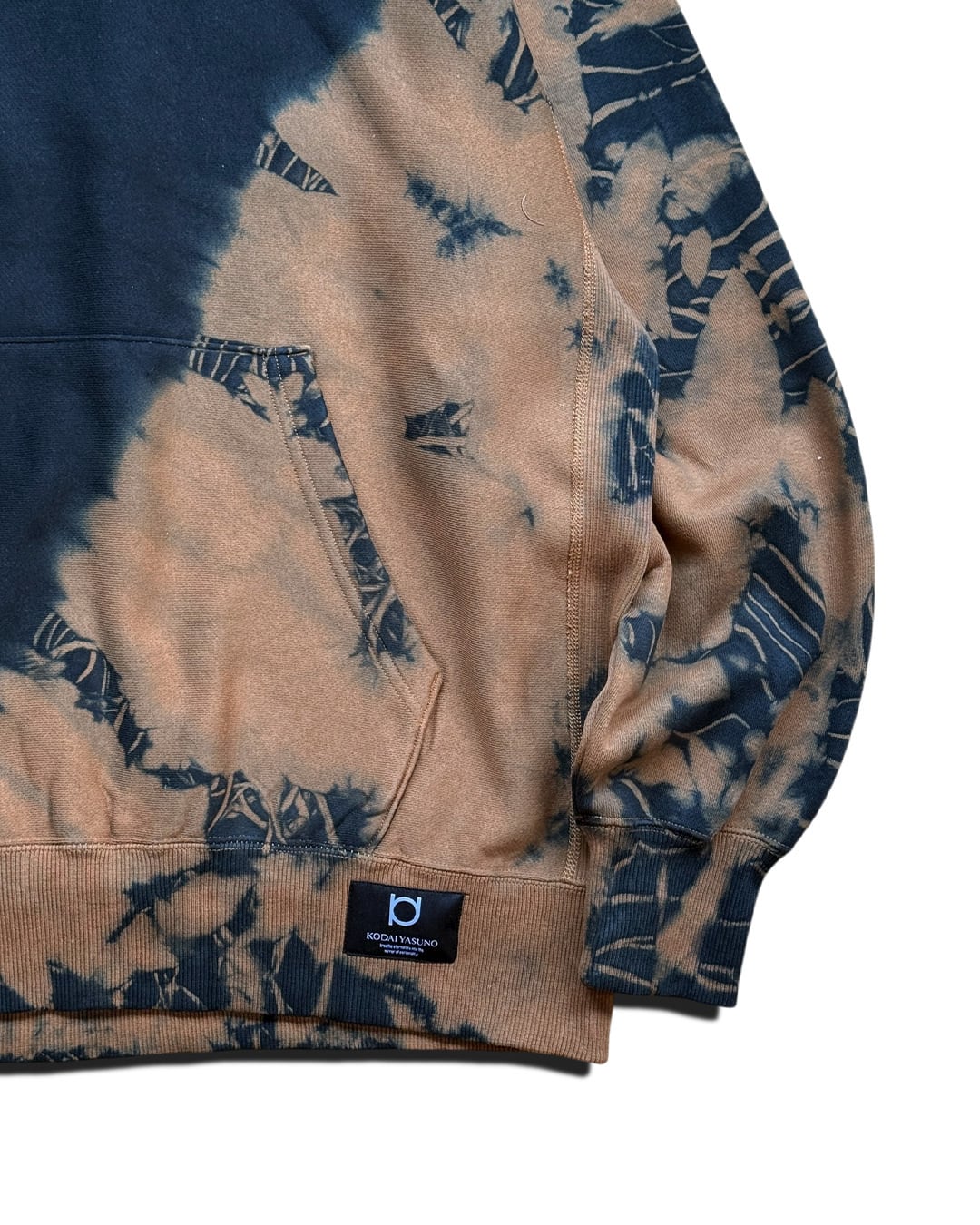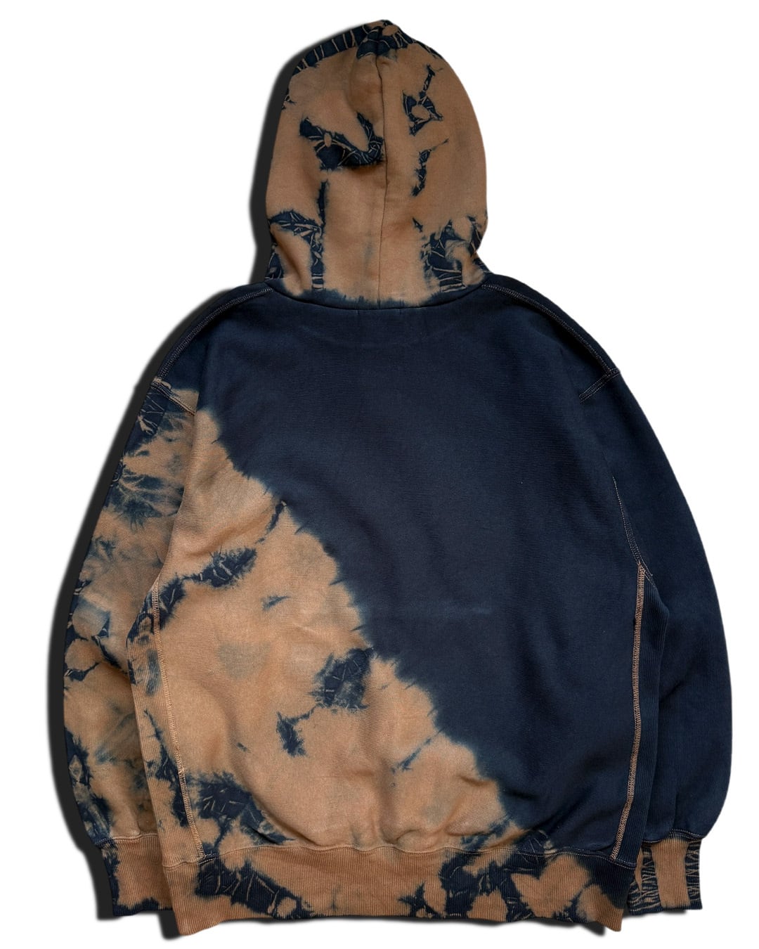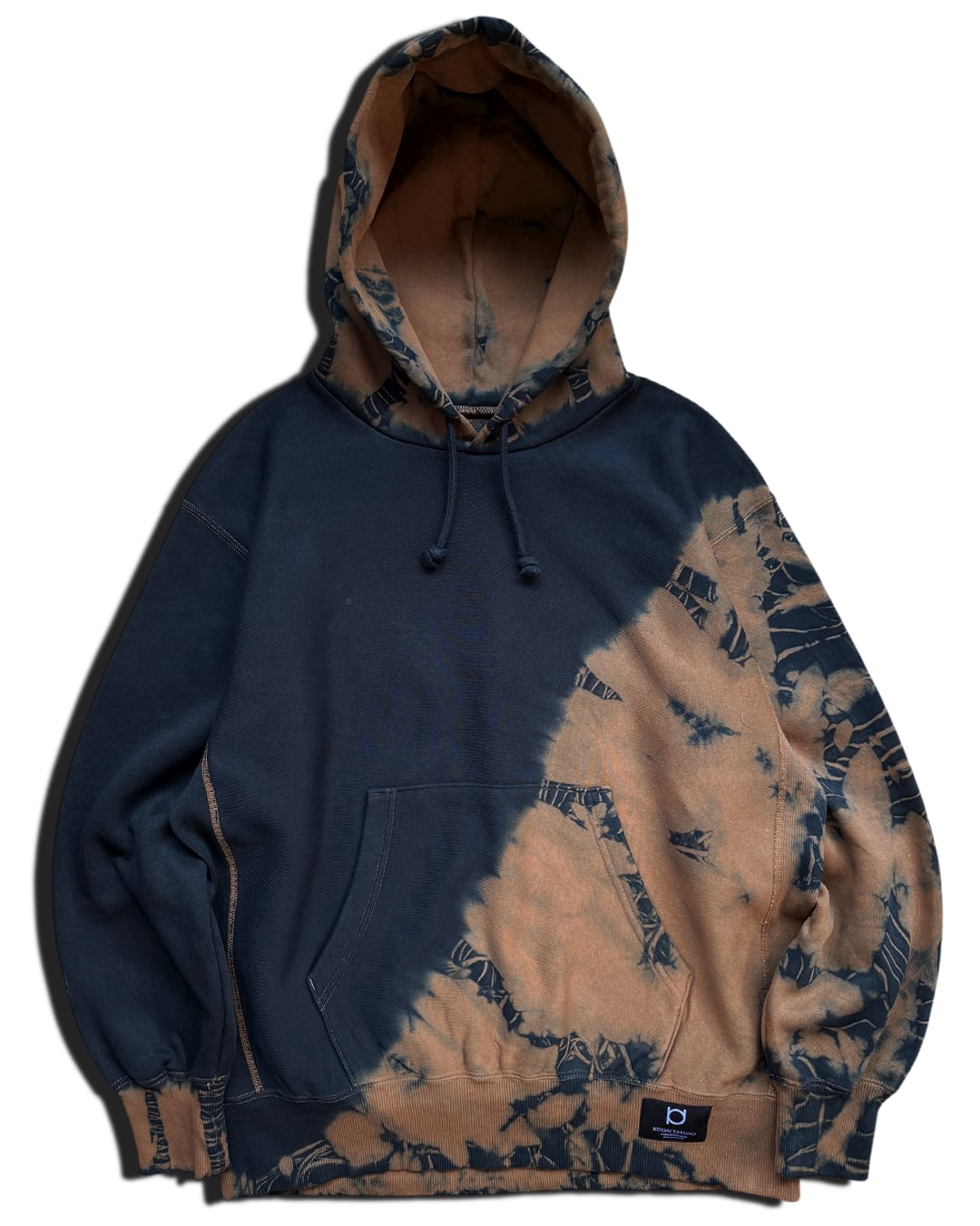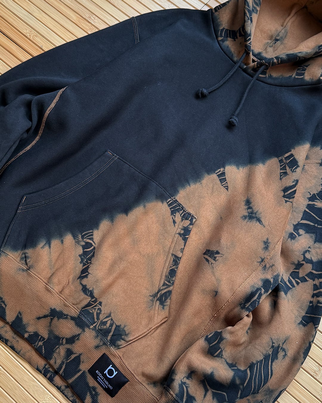 身ごろ左斜め下、フード、右袖口を茶色に黒のタイダイ柄が入るように、それ以外を黒一色に染色をしたヘビーオンスのフーディー。
