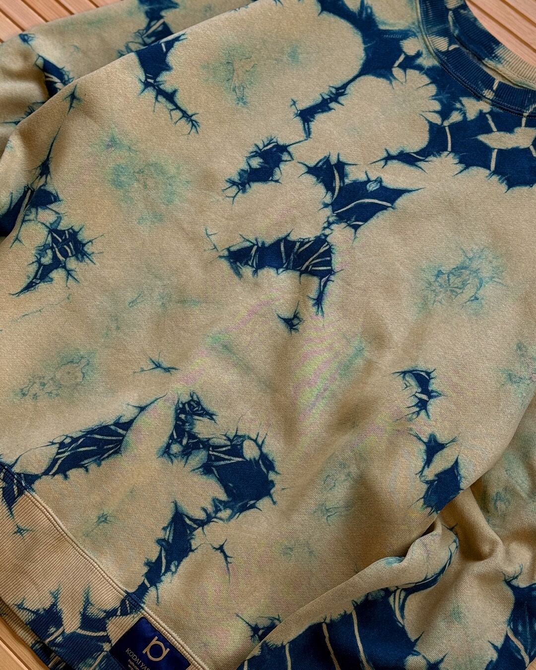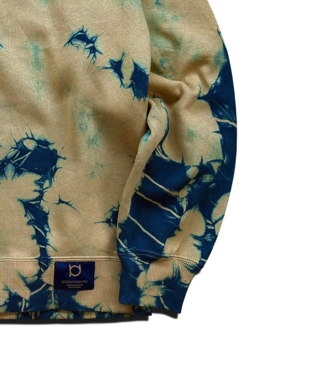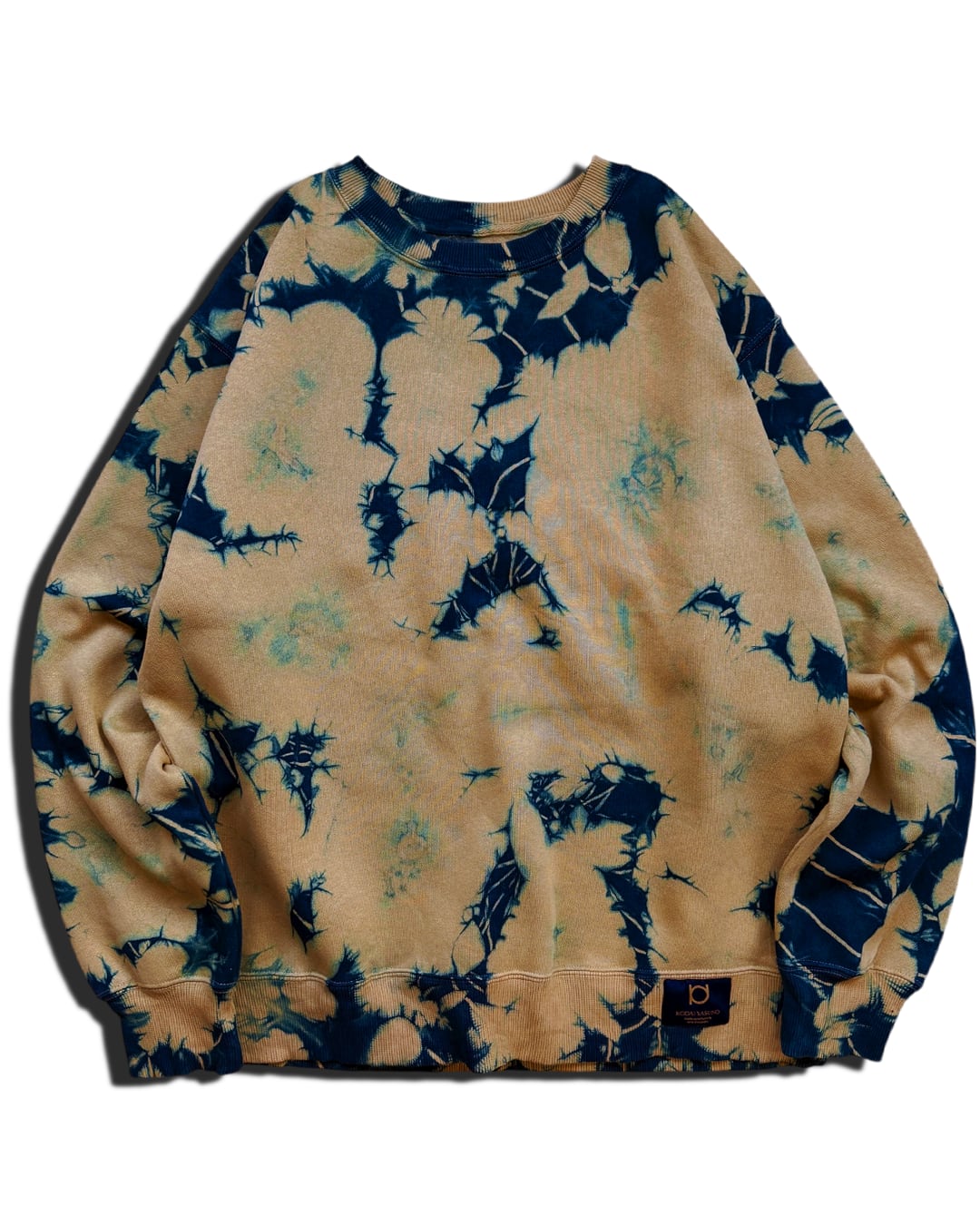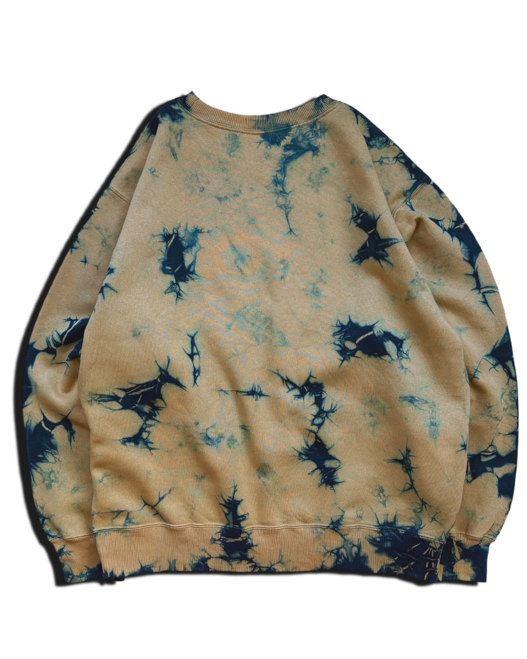 全体をマスタード色に近いベージュと藍のタイダイ柄に染色した裏起毛トレーナー。