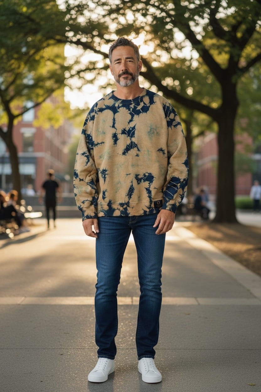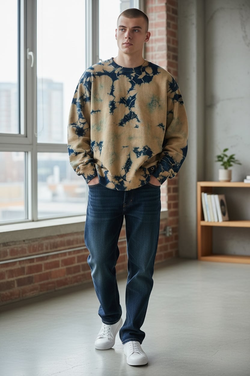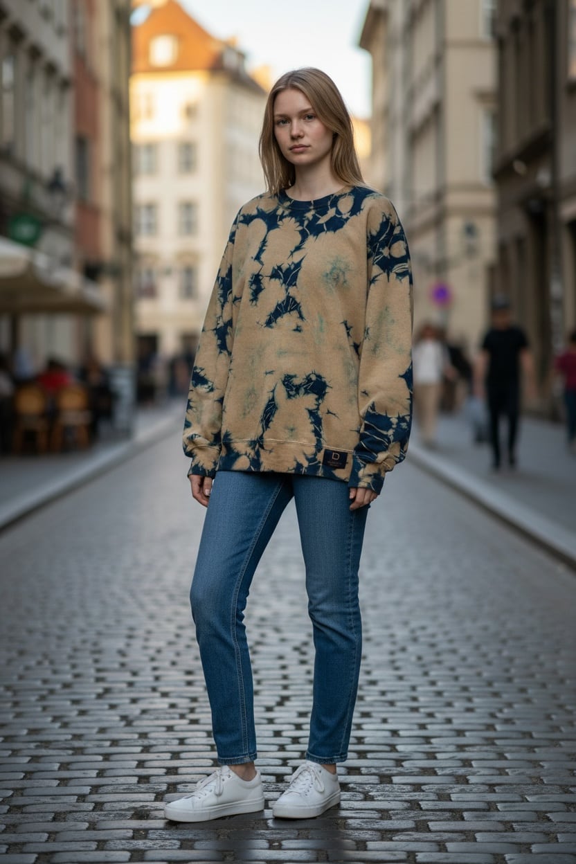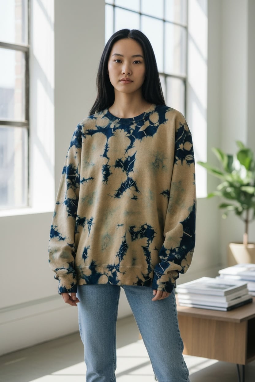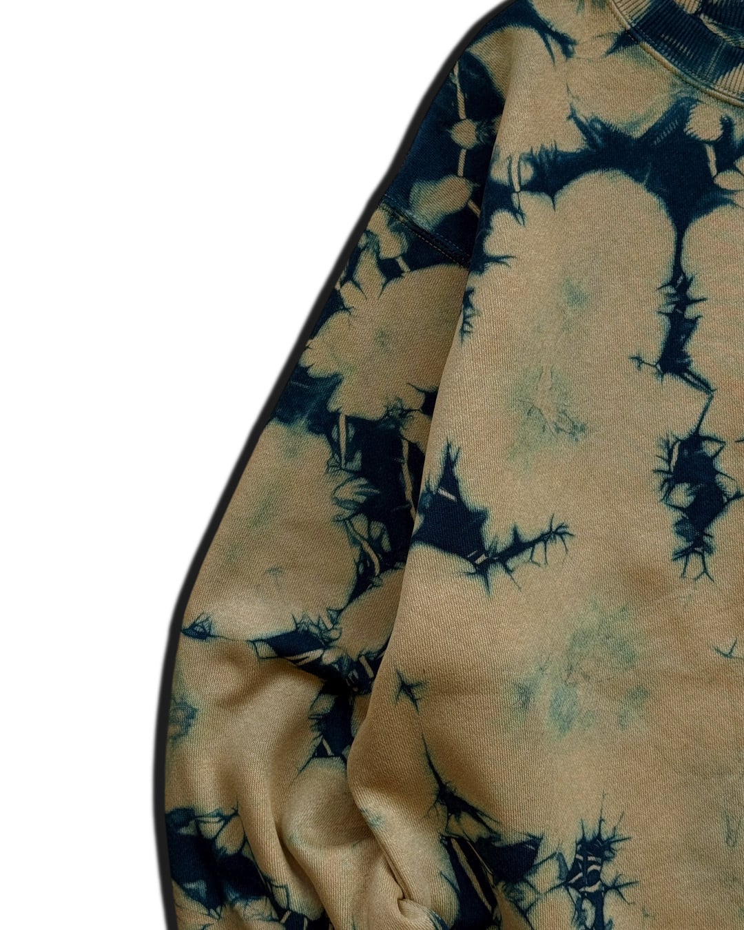 全体をマスタード色に近いベージュと藍のタイダイ柄に染色した裏起毛トレーナー。