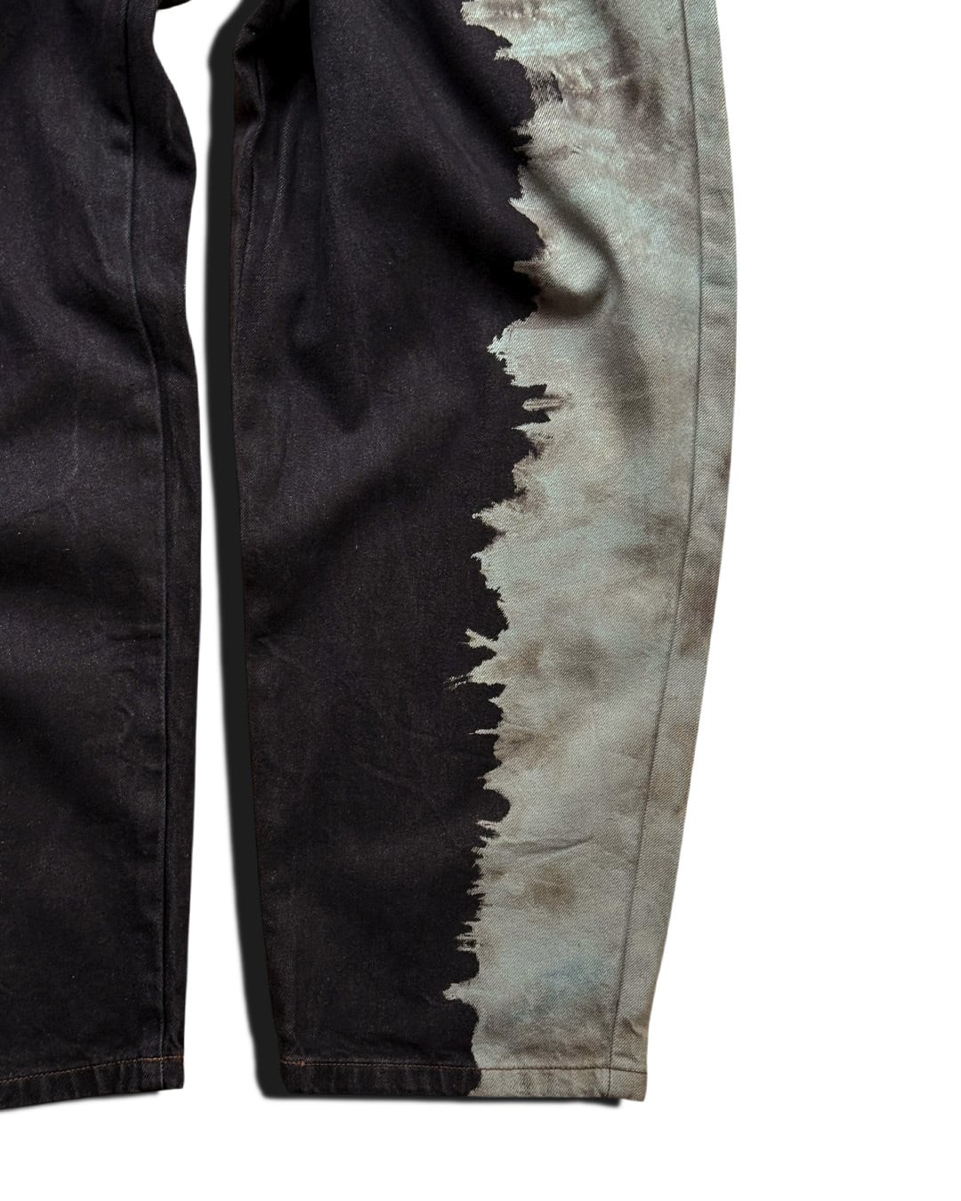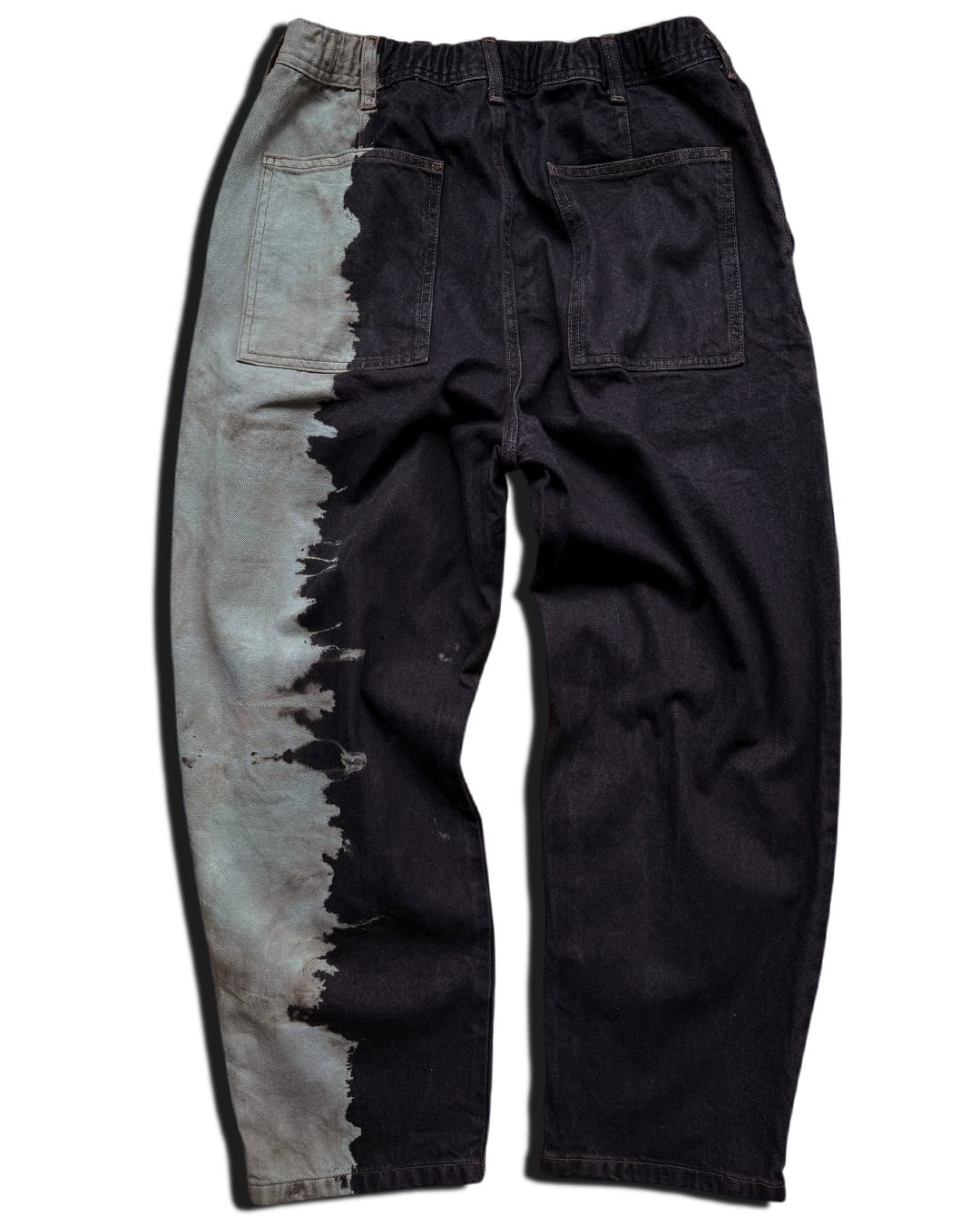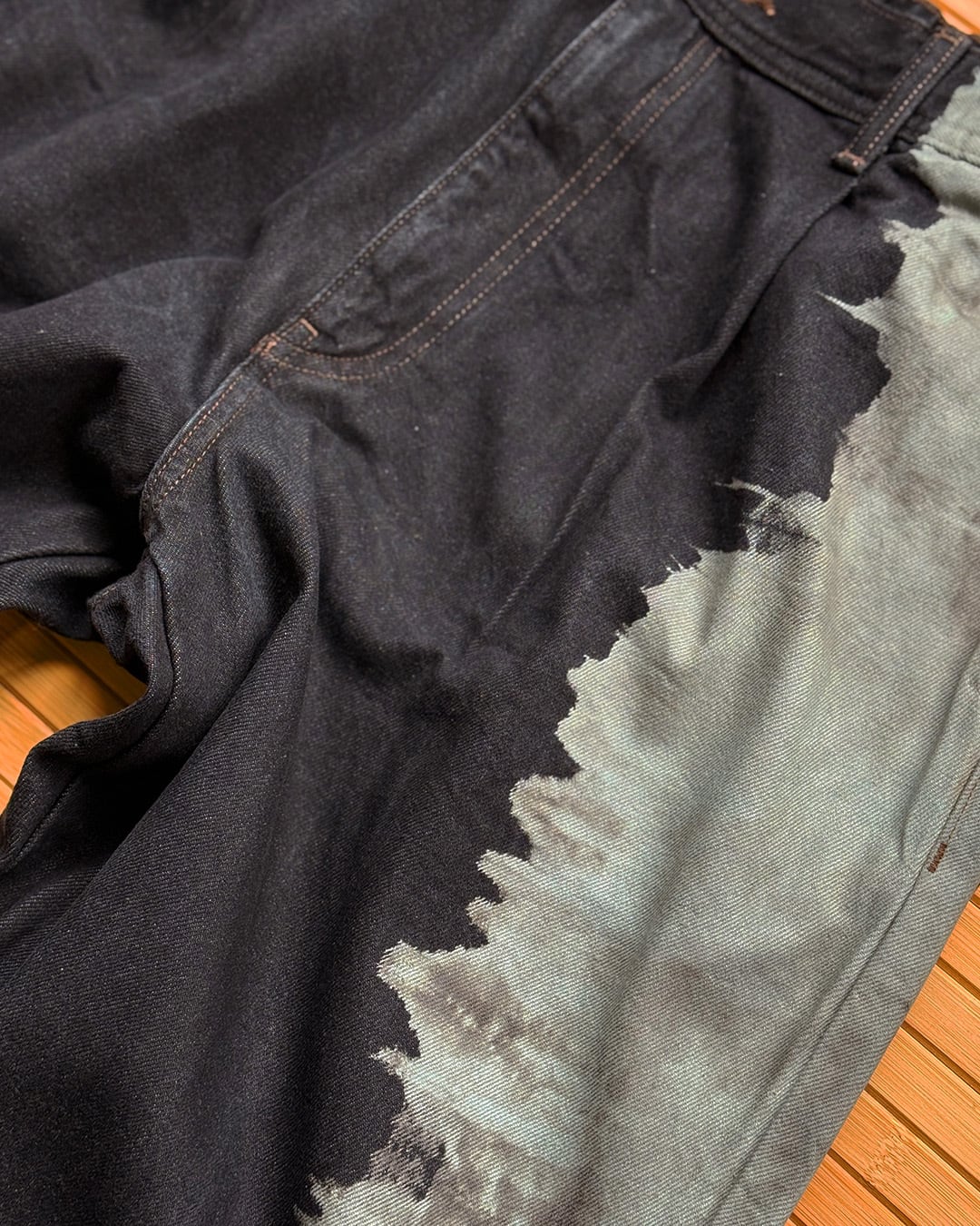 黒デニムの左端部分をブリーチしたのち、グレーに染色を重ねて制作したデニムパンツ。