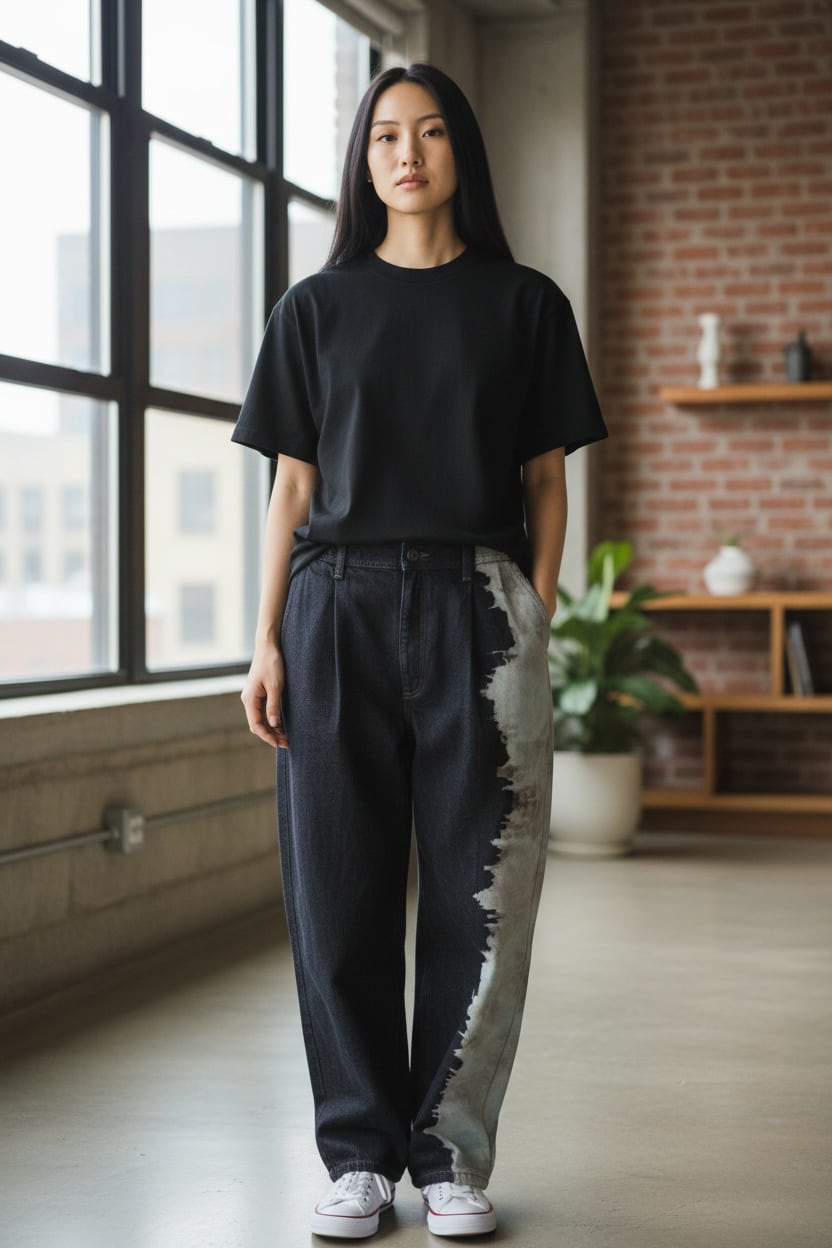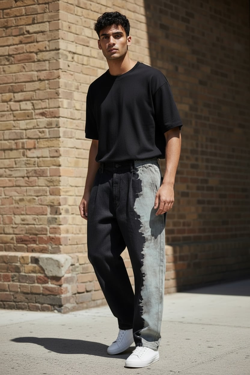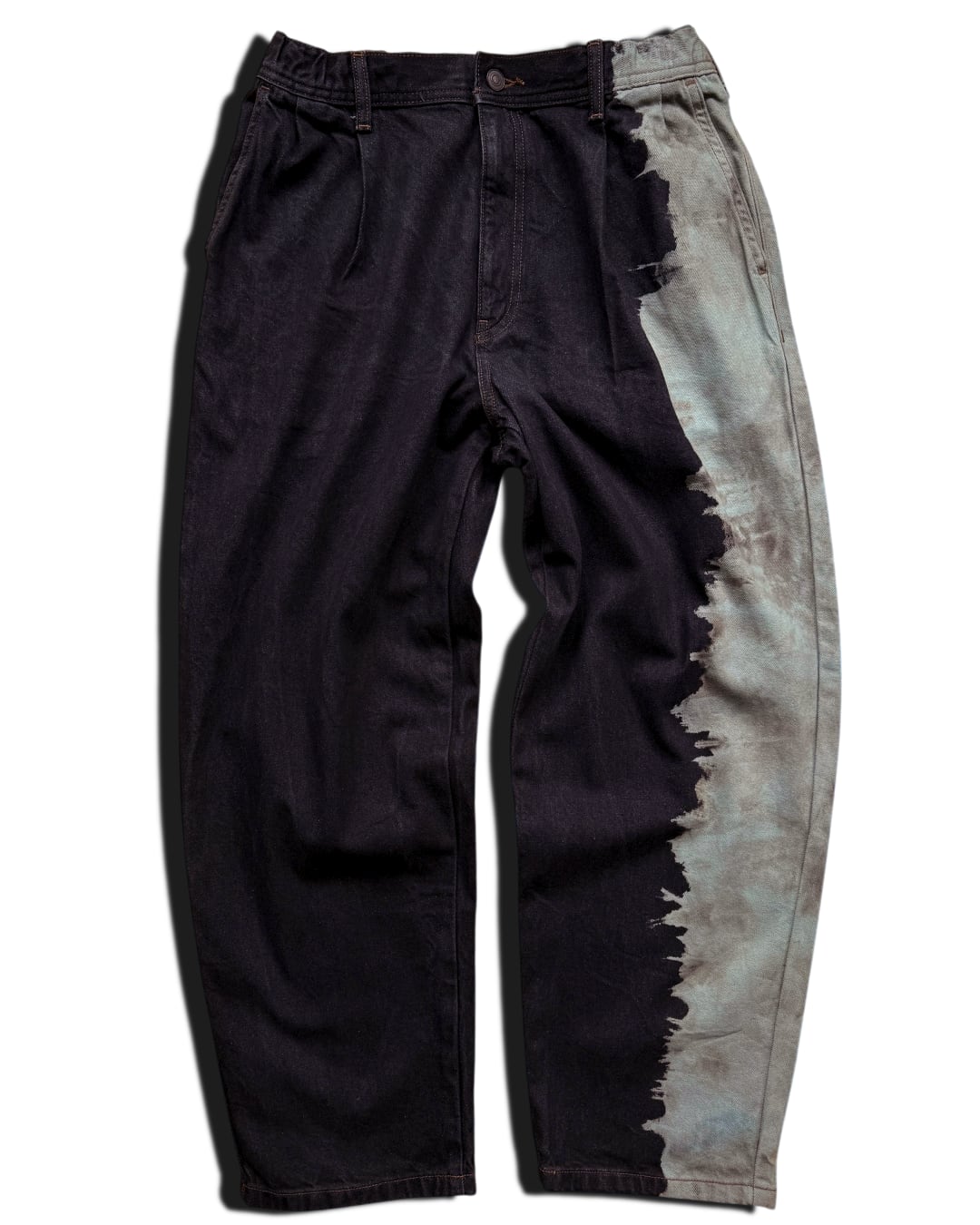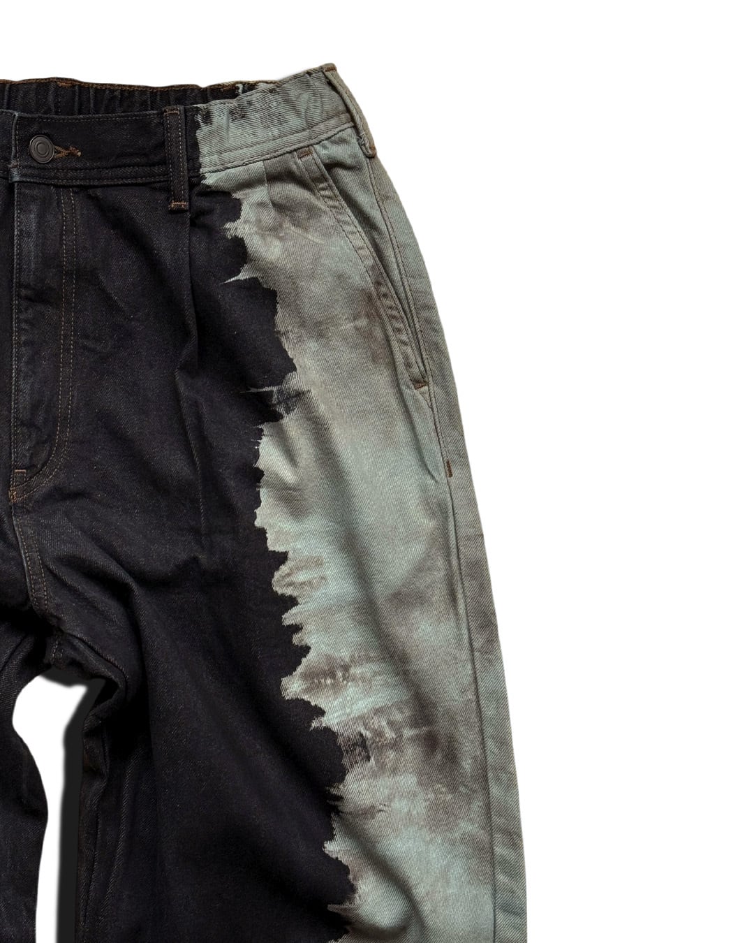 黒デニムの左端部分をブリーチしたのち、グレーに染色を重ねて制作したデニムパンツ。