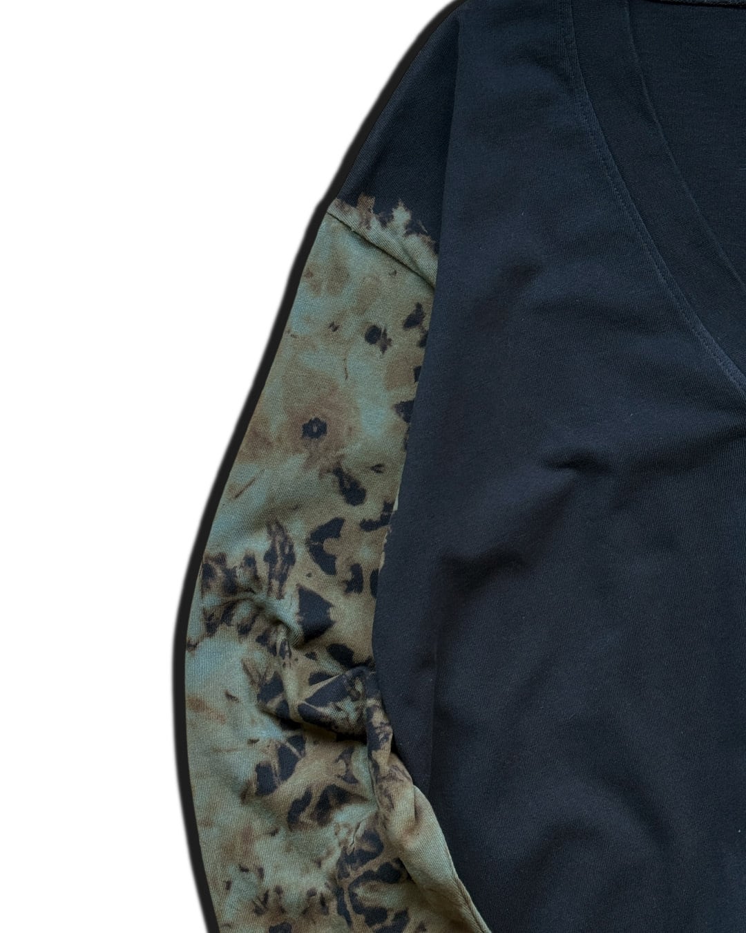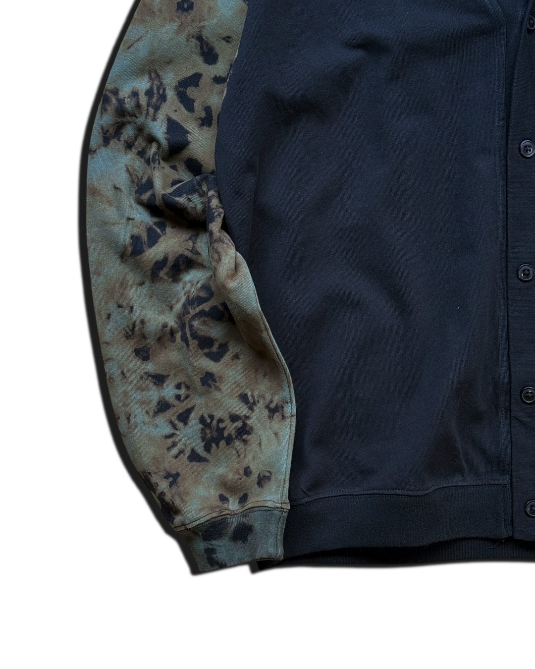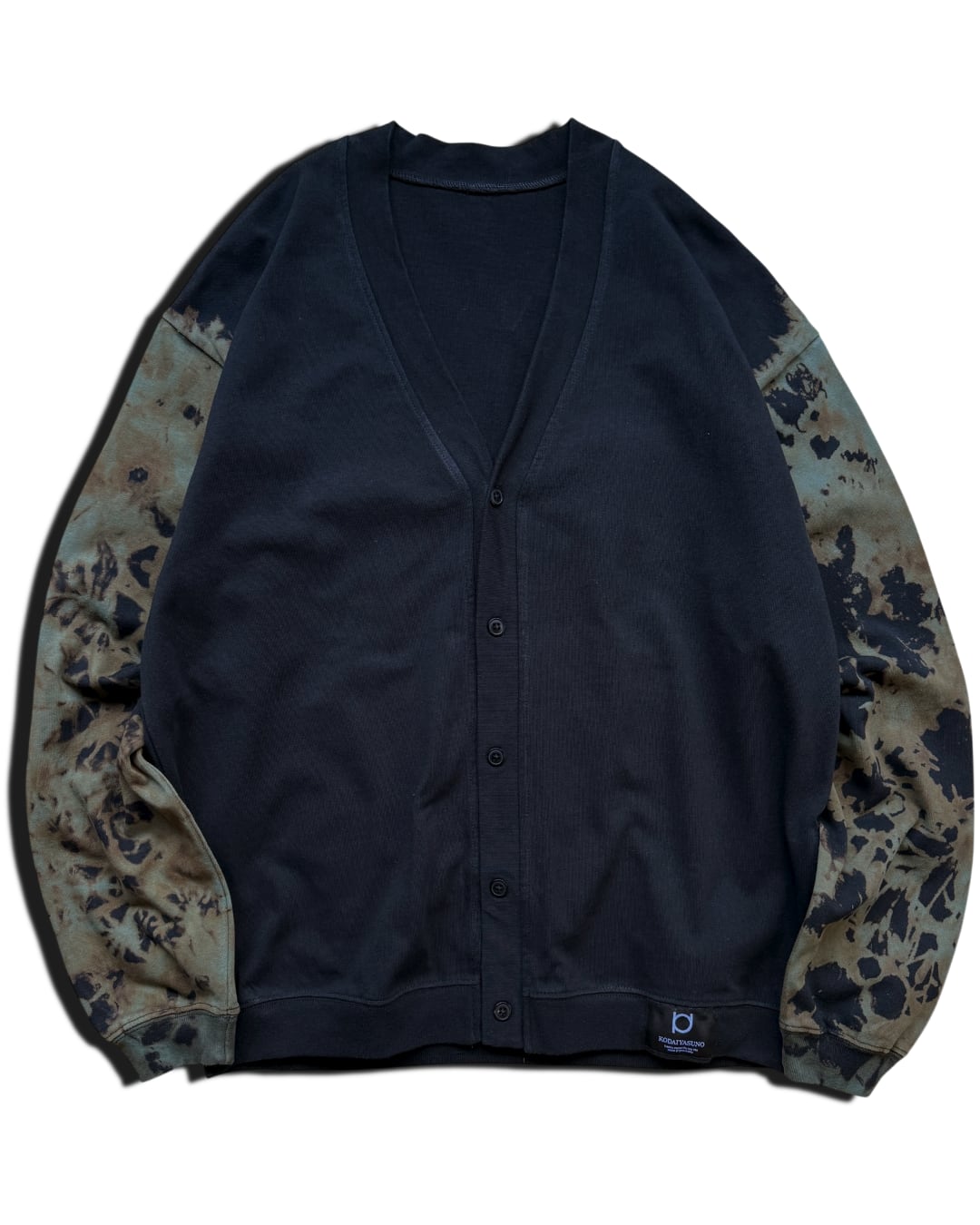 身ごろを真っ黒に、袖をブリーチにてタイダイ柄に落としたのち、緑に染め重ねて袖にデザインと立体感を出したカーディガン。