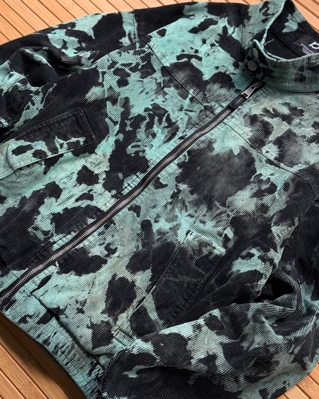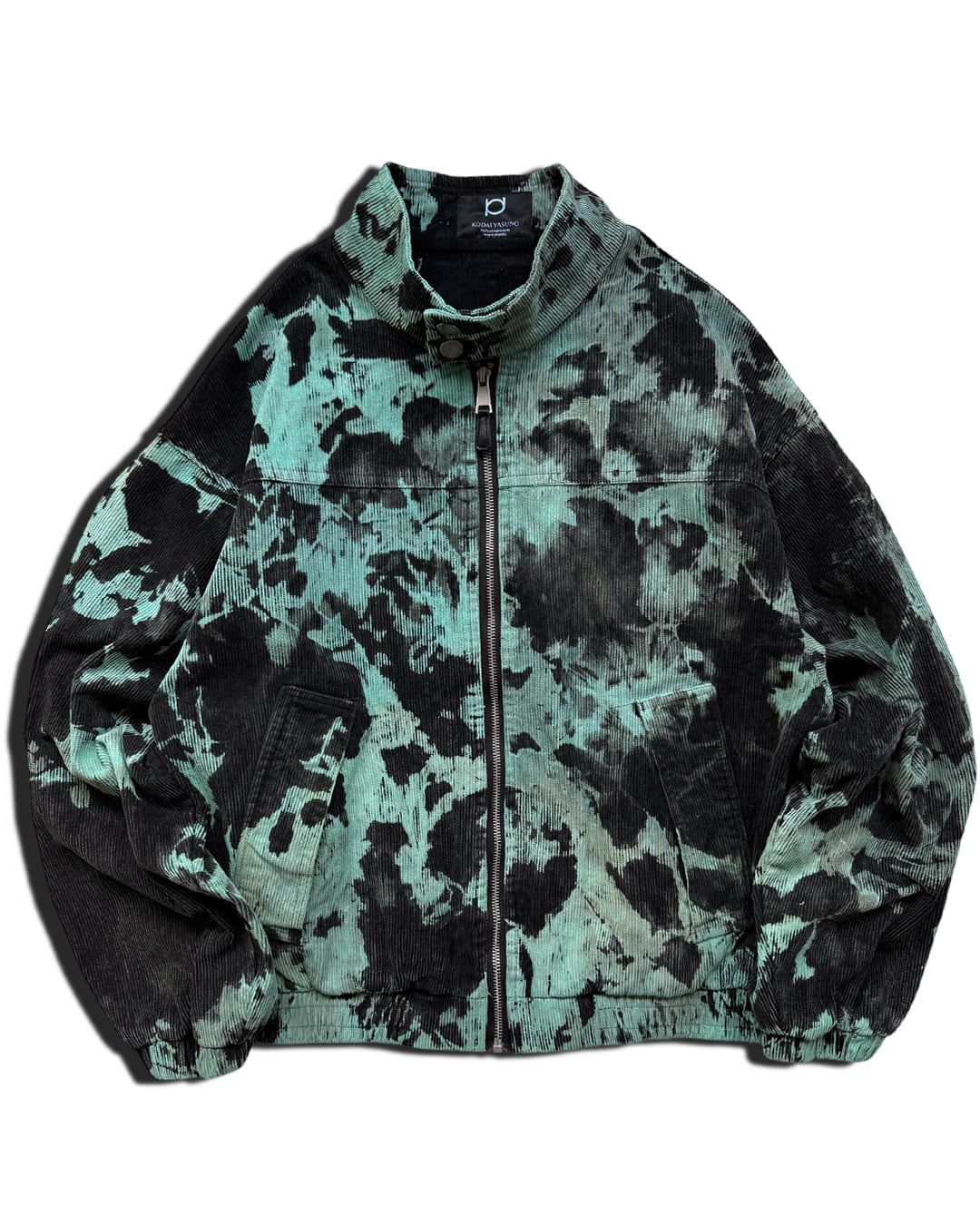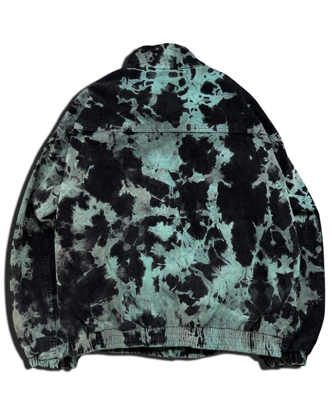 身ごろをウォッシュがかかったかのような質感の黒に染色したのち、全体をブリーチして不規則な柄を入れたのち、水色に染め重ねて制作したコーデュロイ生地のブルゾンジャケット。