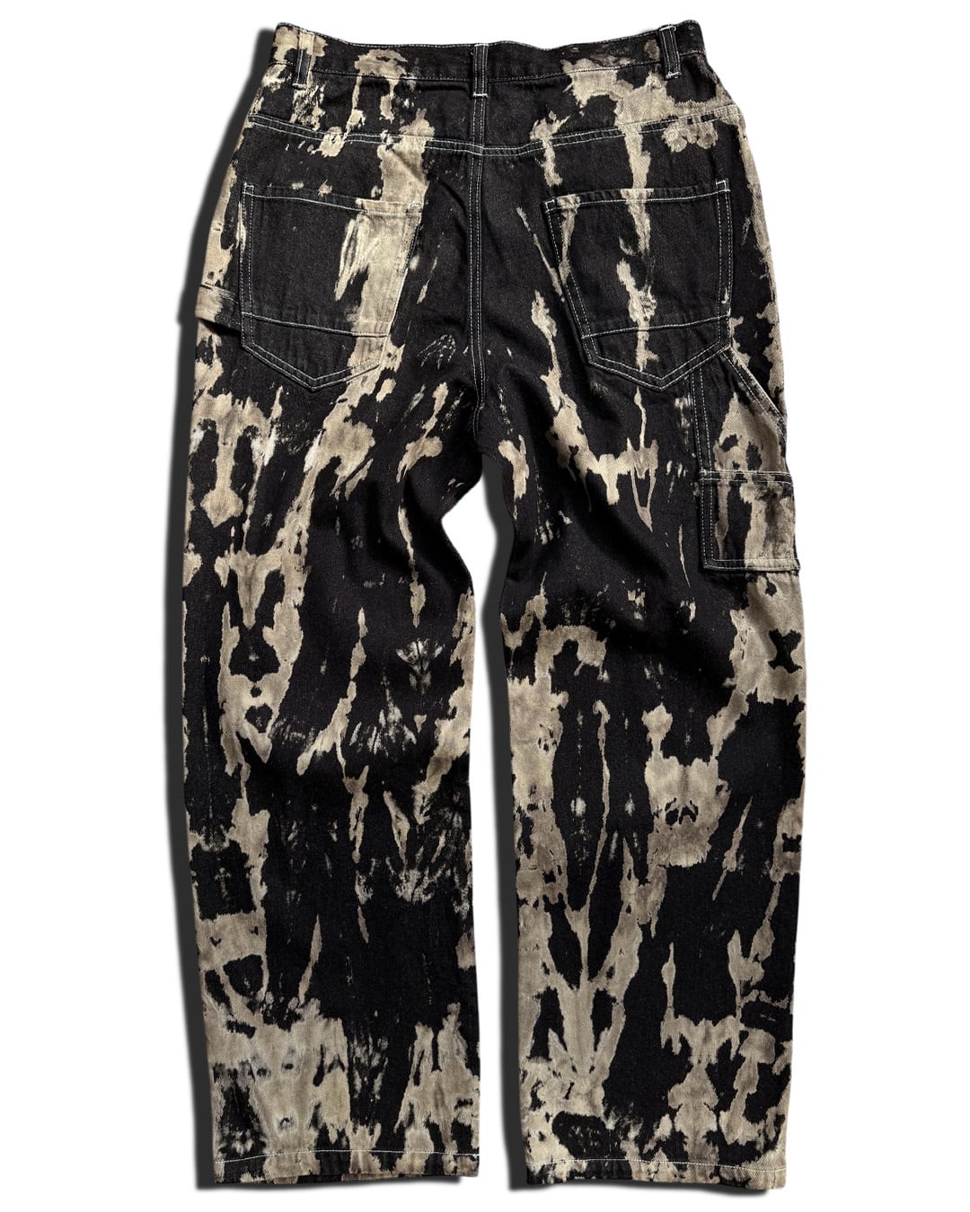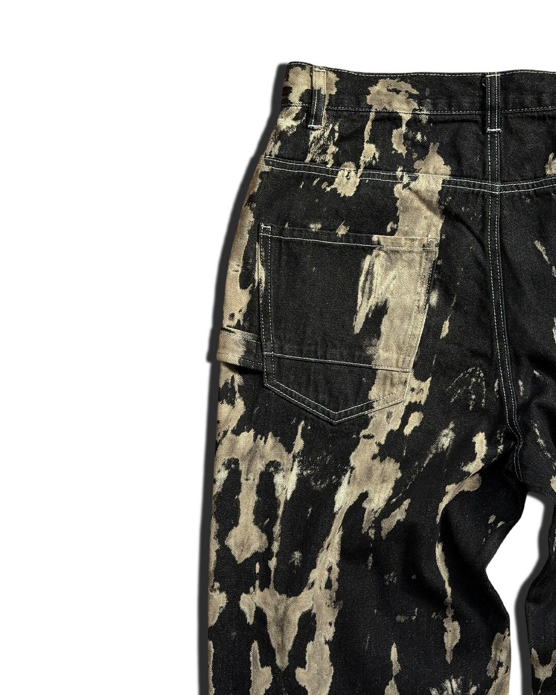 黒デニムに枯れ木をイメージしたブラウンベージュの絞り柄を入れたペインターデニムパンツ。