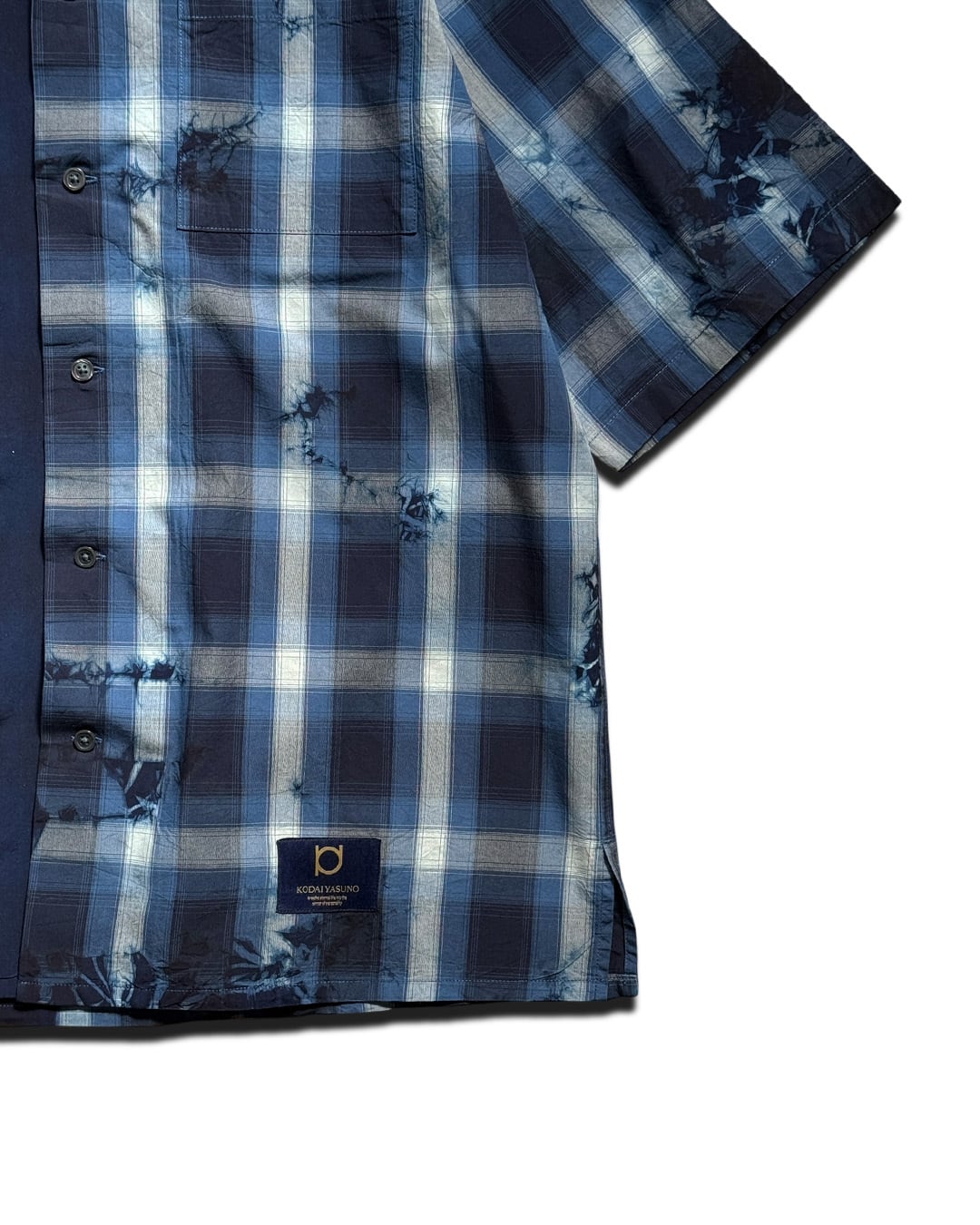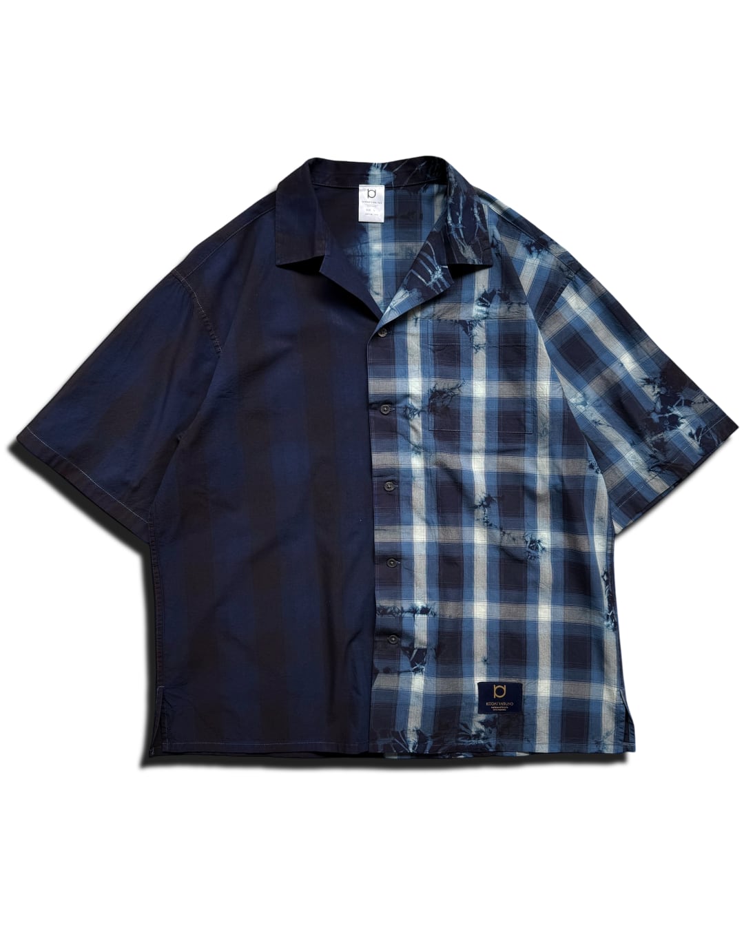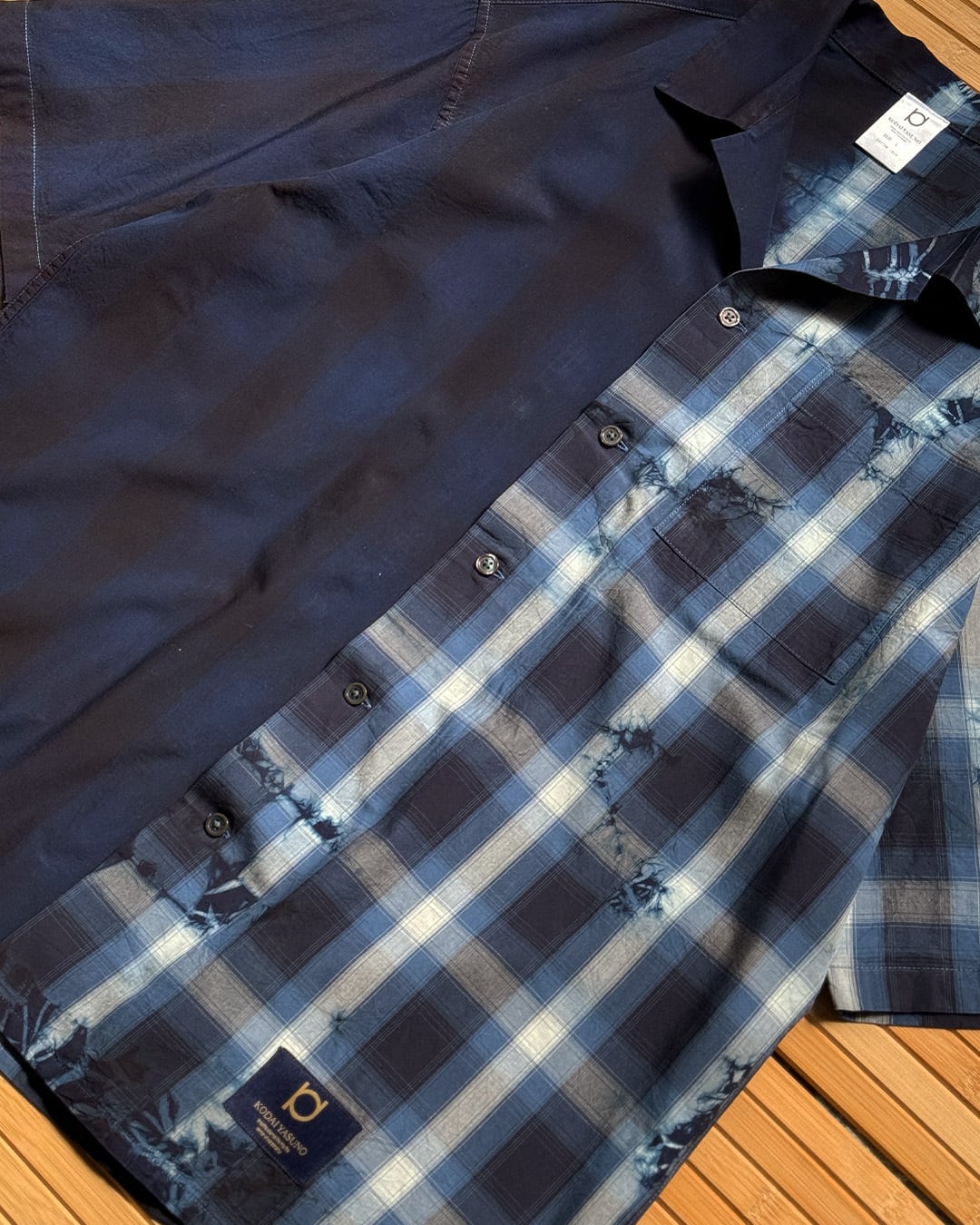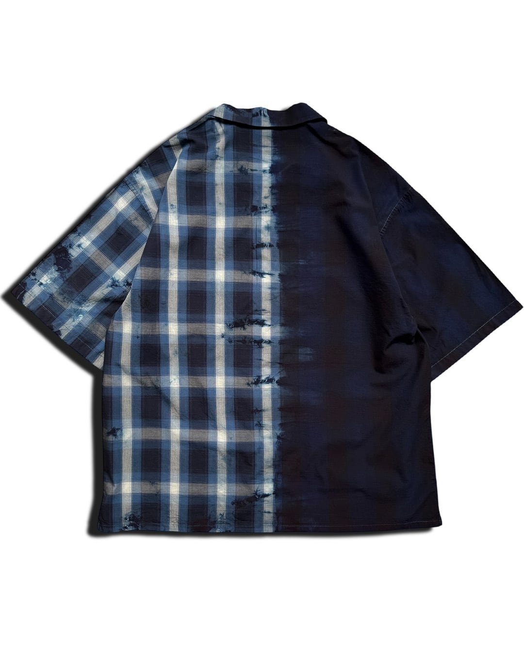 右身ごろを藍一色に、左身ごろを青のチェックシャツのデザインに仕上げた開襟シャツ。